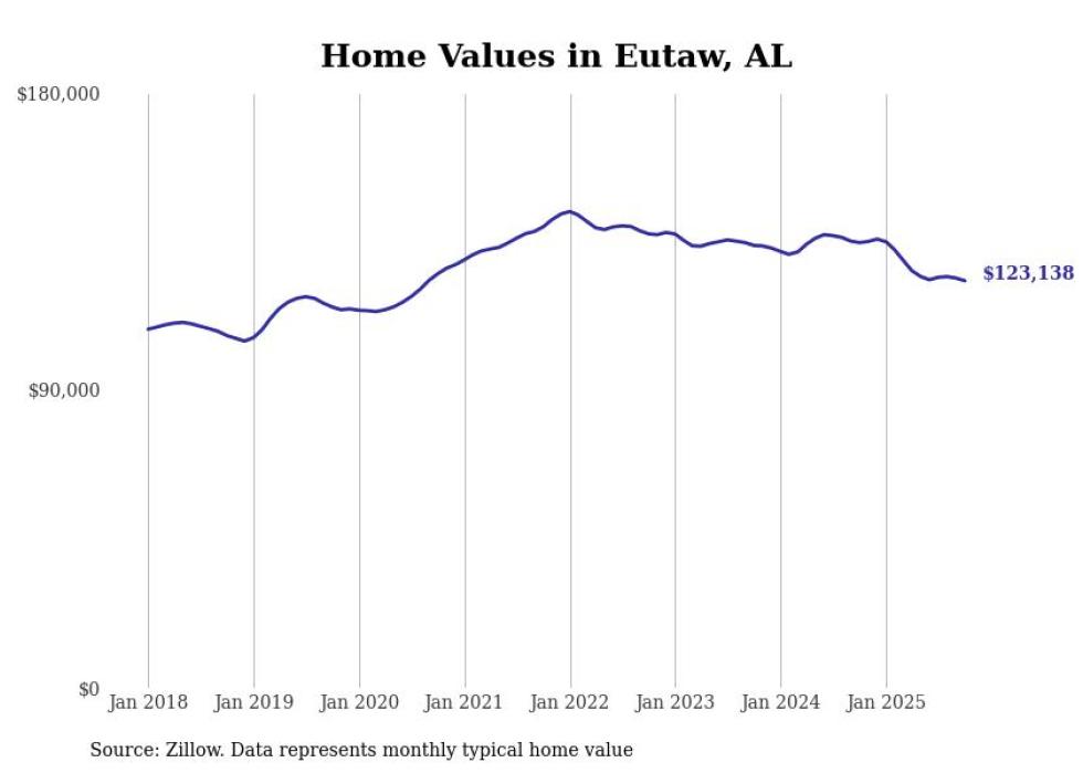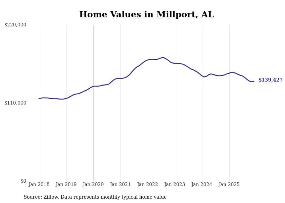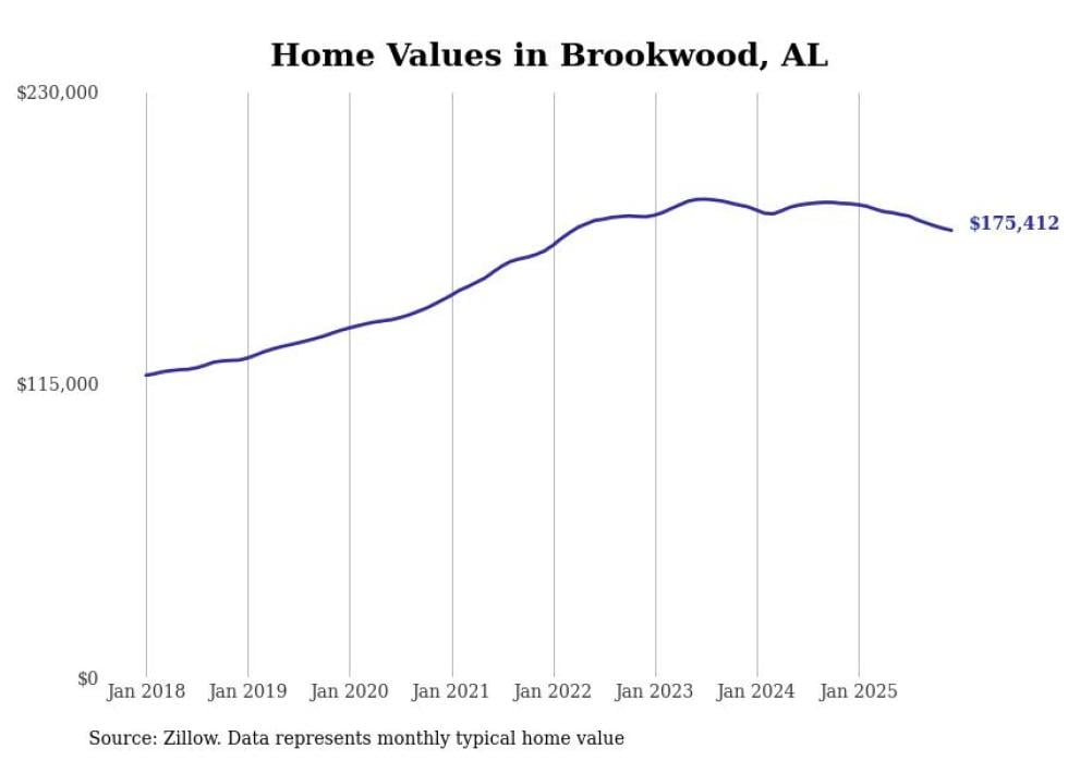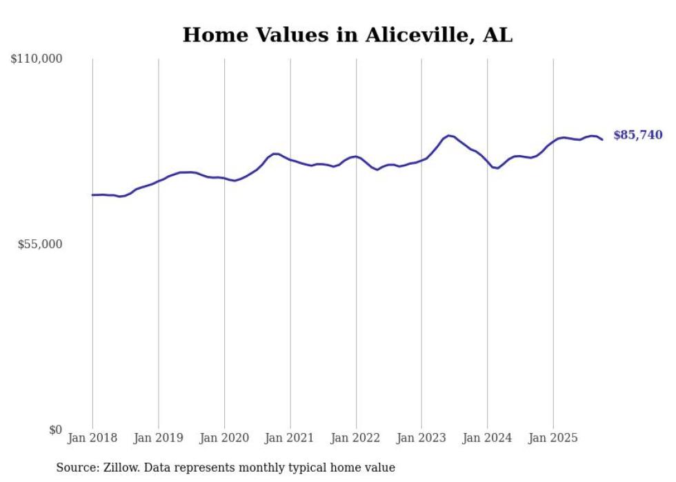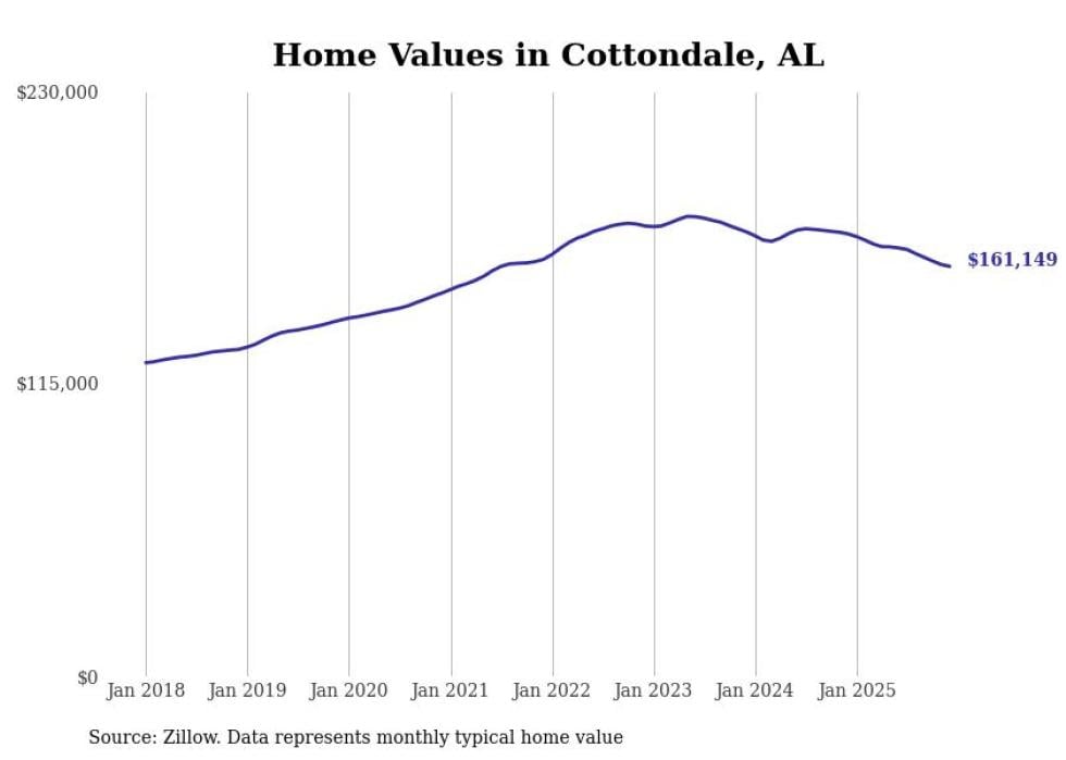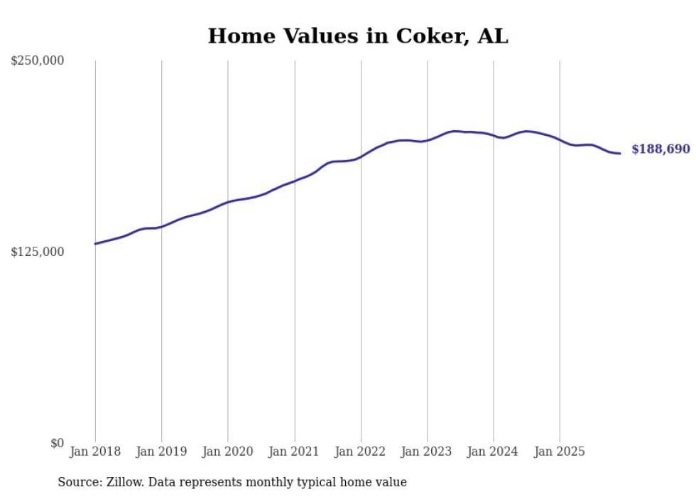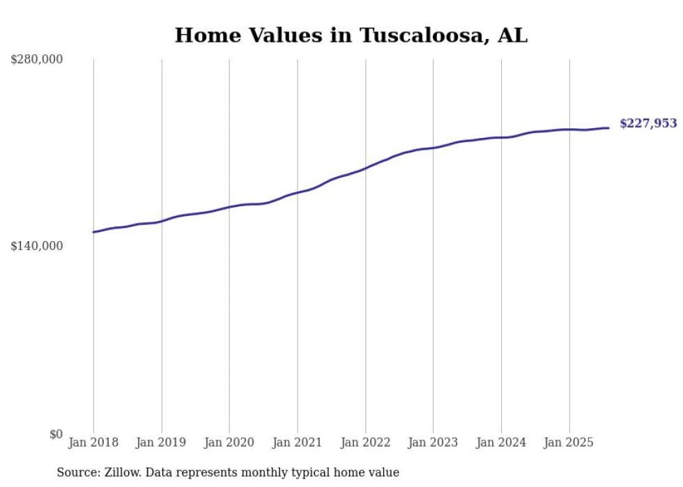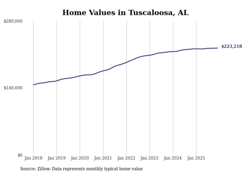 Stacker compiled a list of cities with the most expensive homes in the Tuscaloosa, AL metro area using data from Zillow. Charts show the monthly typical home value since January 2018.