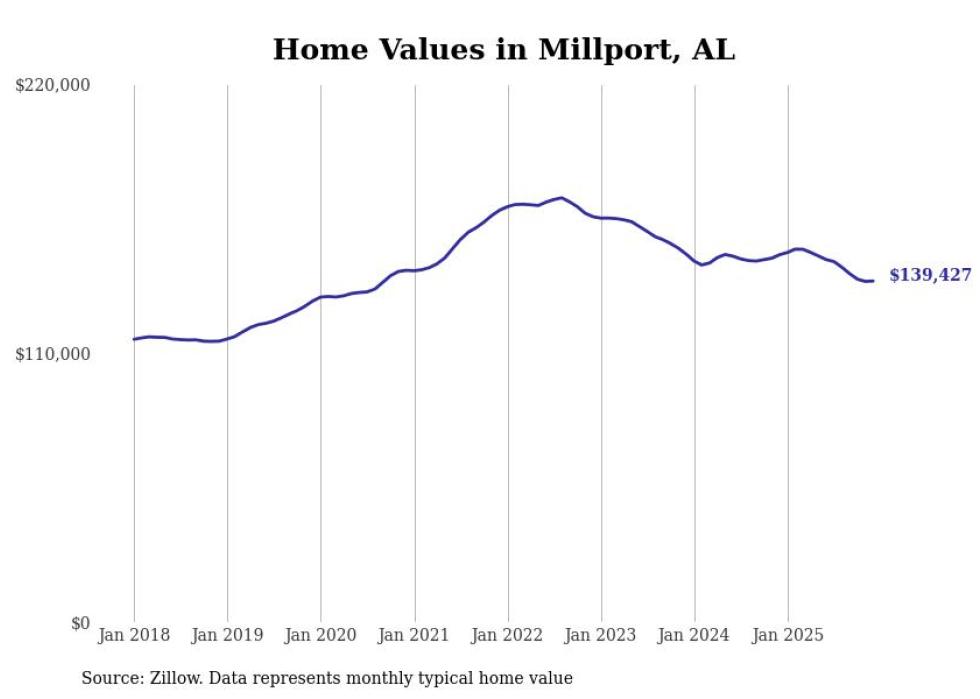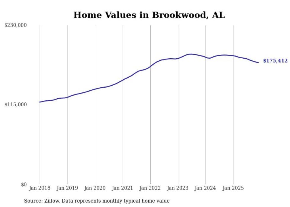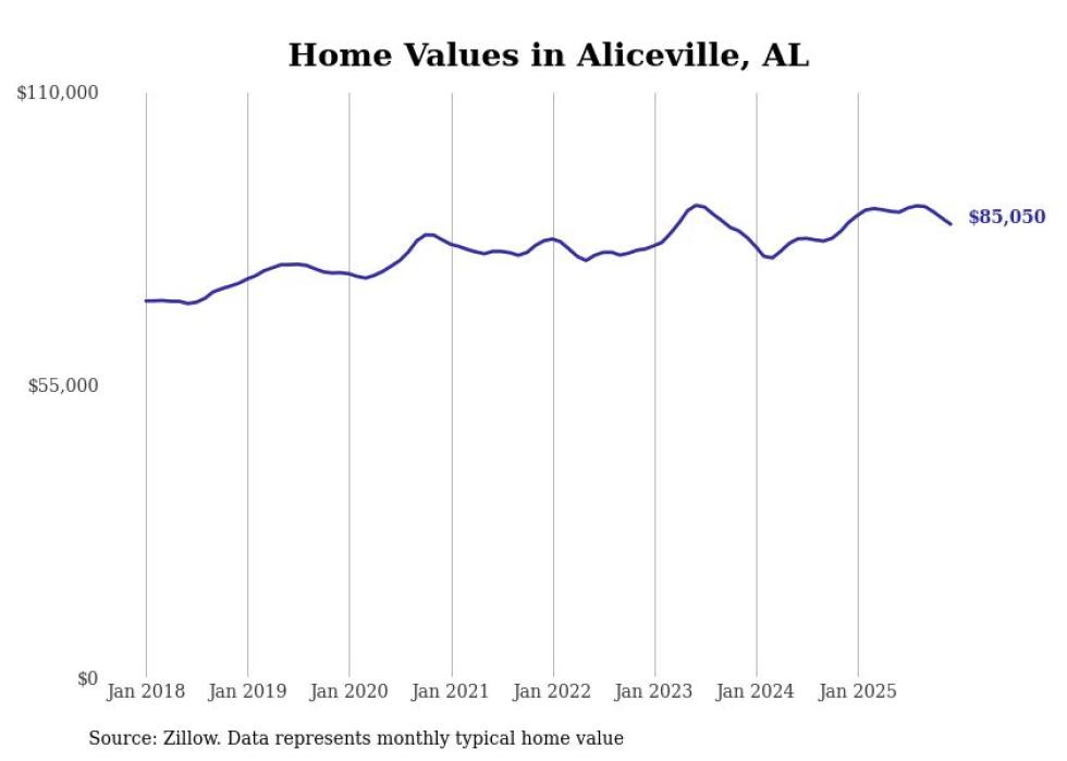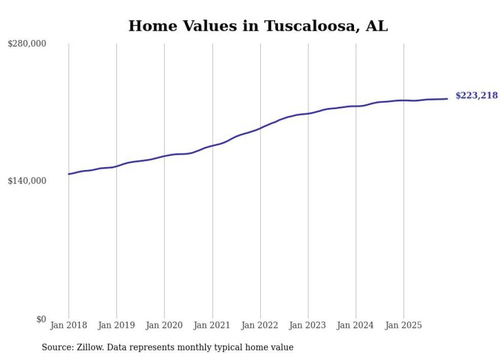 Stacker compiled a list of cities with the most expensive homes in the Tuscaloosa metro area using data from Zillow. Charts show the monthly typical home value since January 2018. All 19 cities and towns with data available were included in the list.