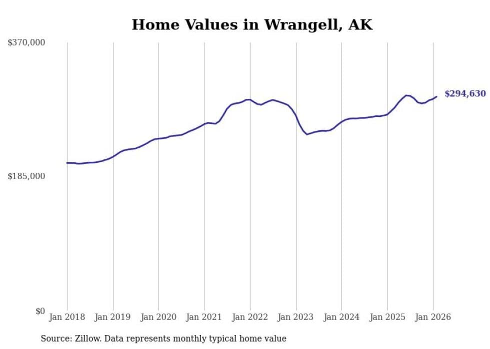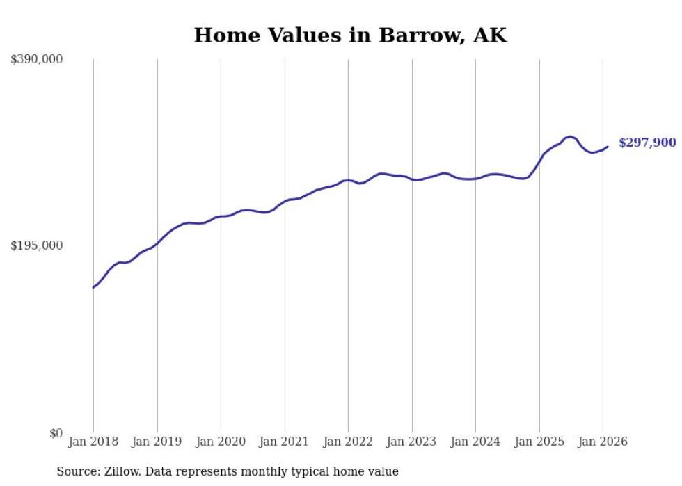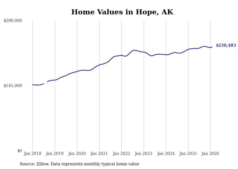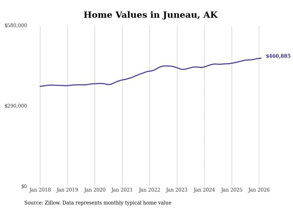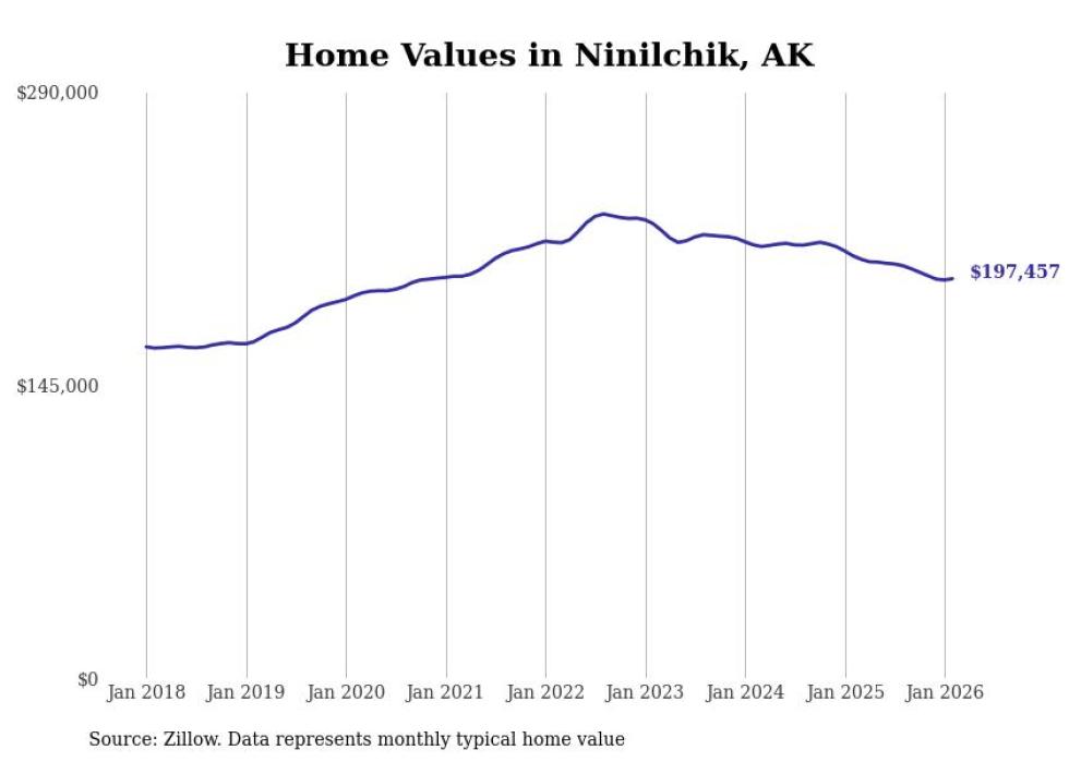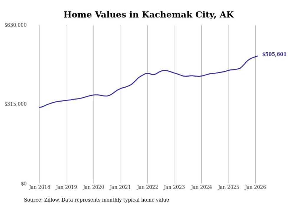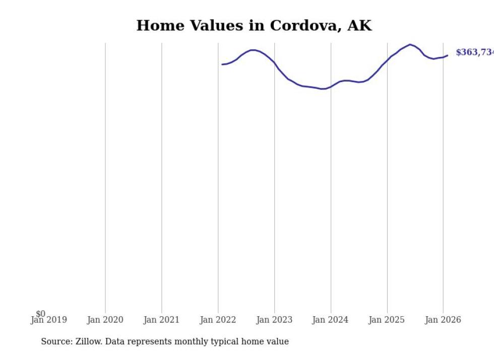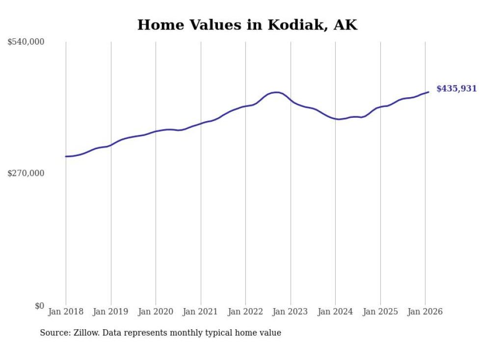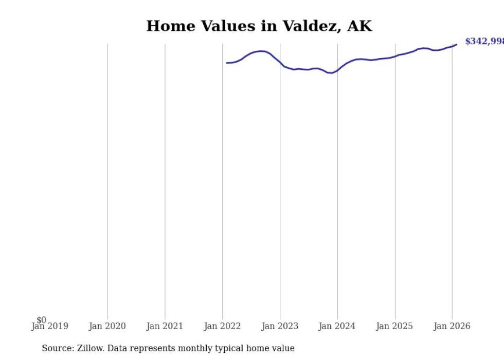 Stacker compiled a list of cities with the fastest-growing home prices in Alaska using data from Zillow. Cities are ranked by the dollar change in the Zillow Home Values Index for all homes from the 12 months ending February 2026. The charts in this story were created automatically using Matplotlib. Data was available for 40 cities and towns in Alaska.