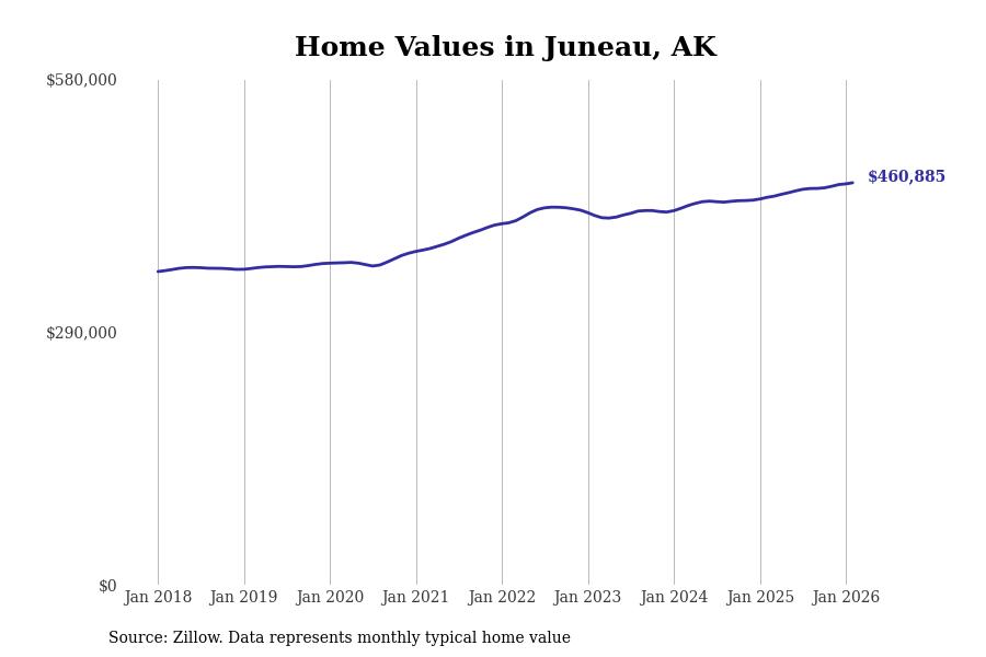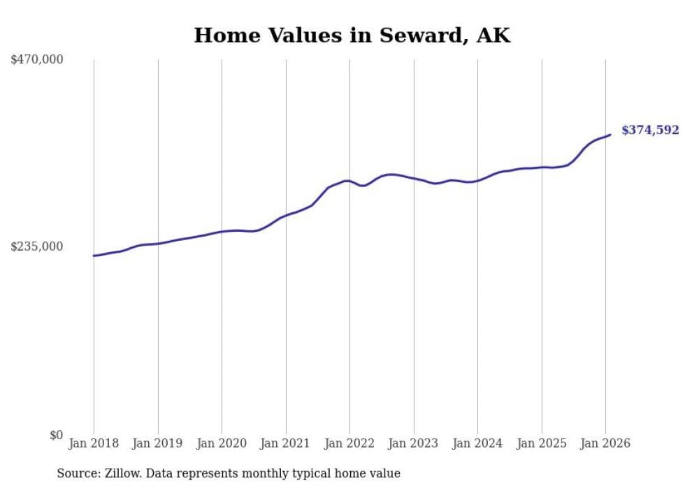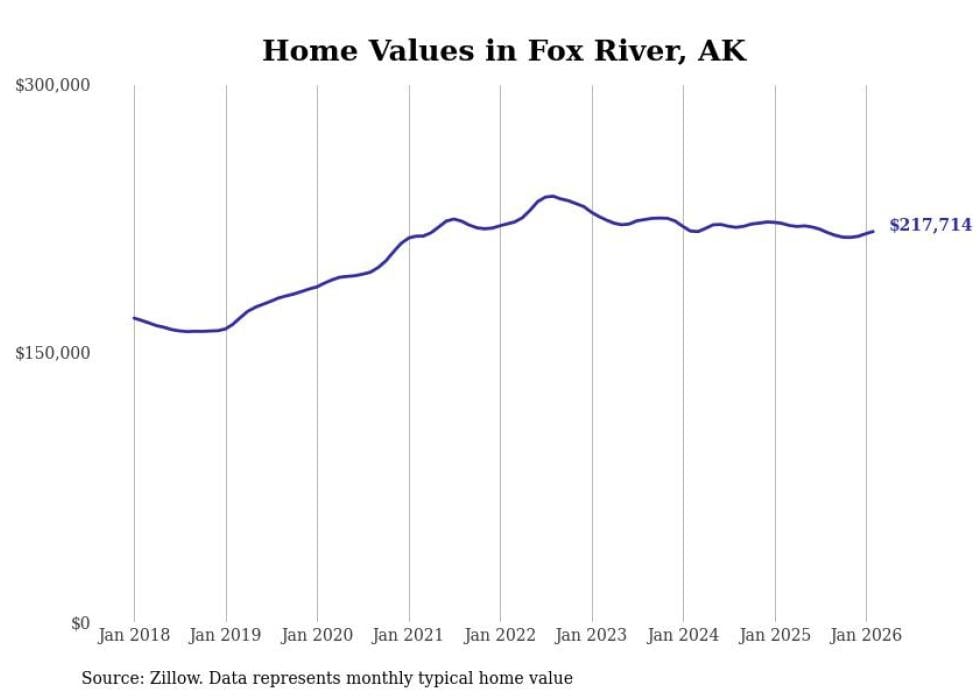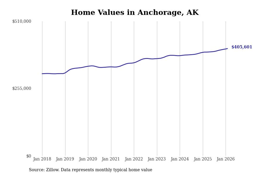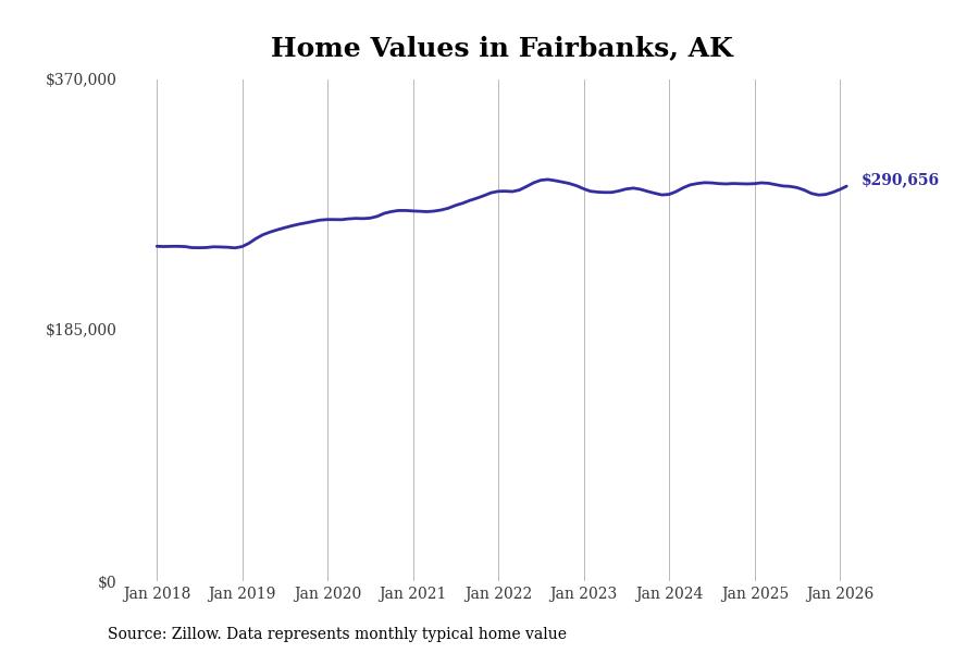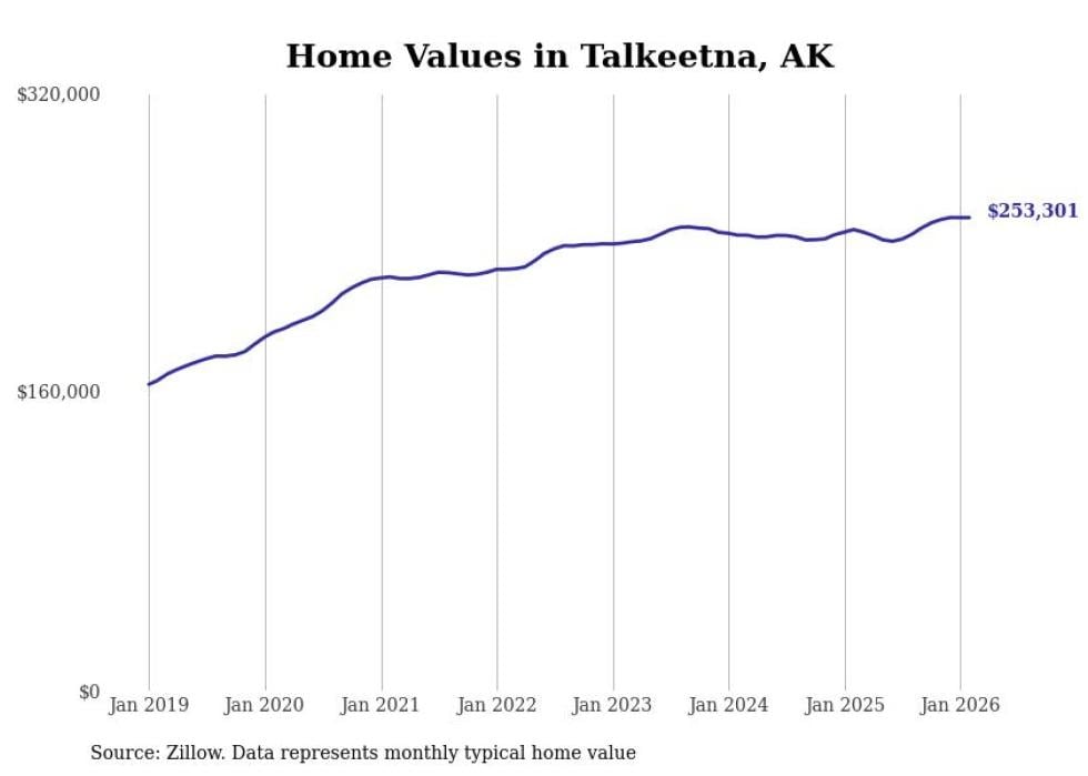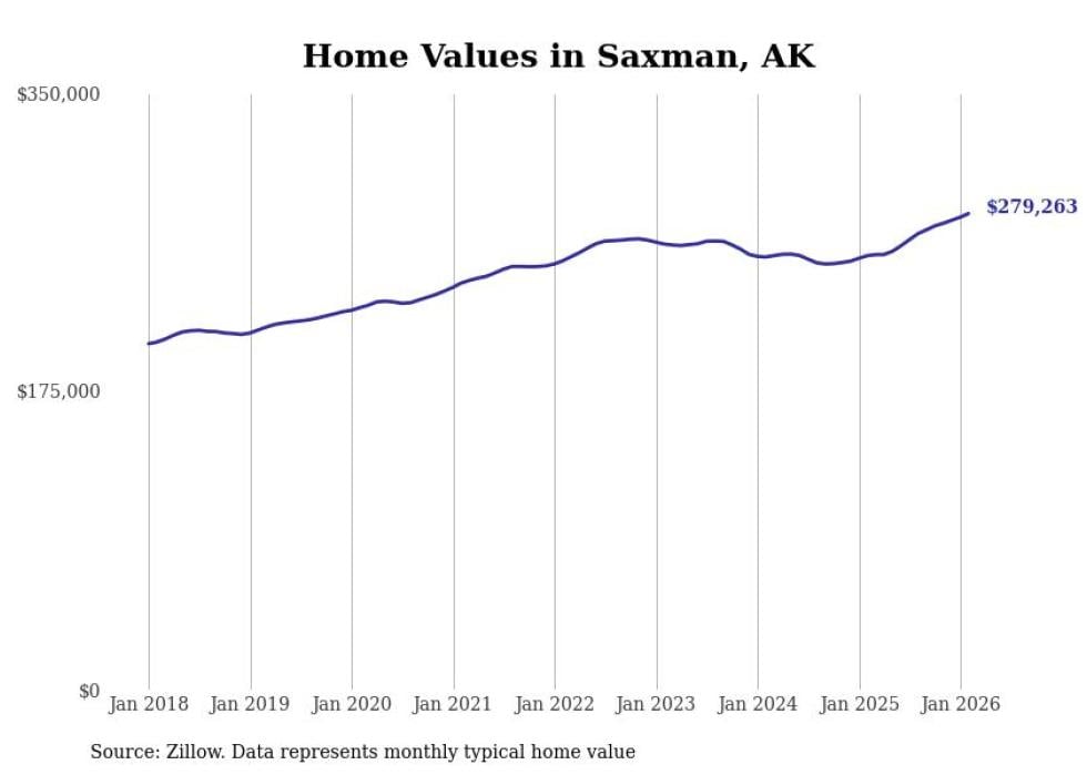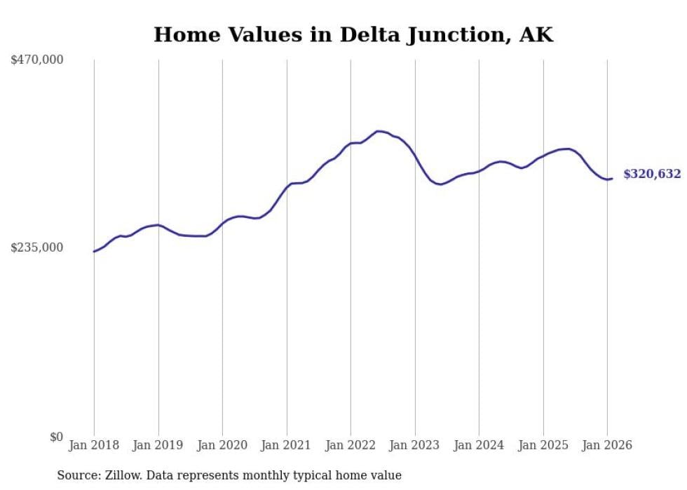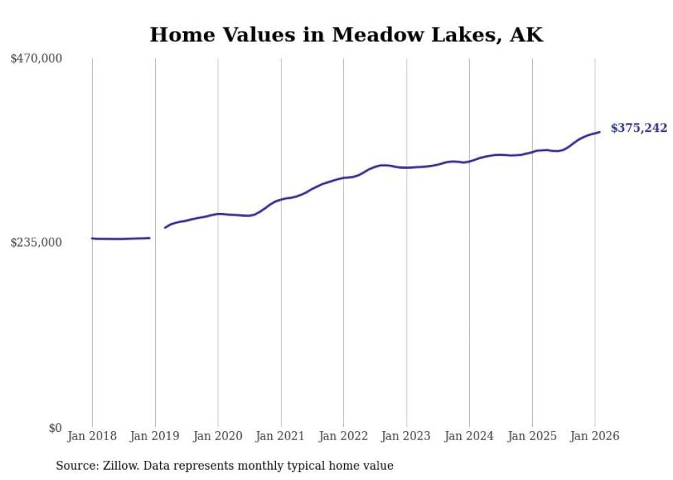 Stacker compiled a list of cities with the fastest-growing home prices in Alaska using data from Zillow. Cities are ranked by the dollar change in the Zillow Home Values Index for all homes from the 12 months ending February 2026. The charts in this story were created automatically using Matplotlib. Data was available for 40 cities and towns in Alaska.