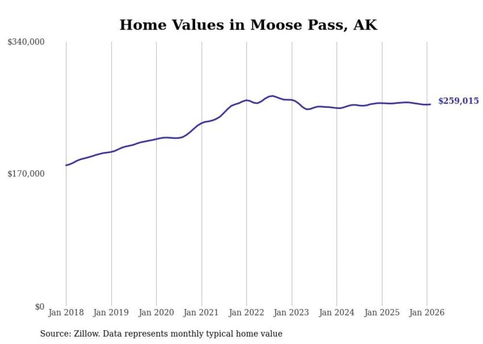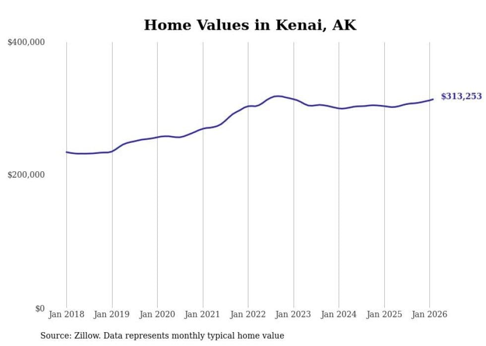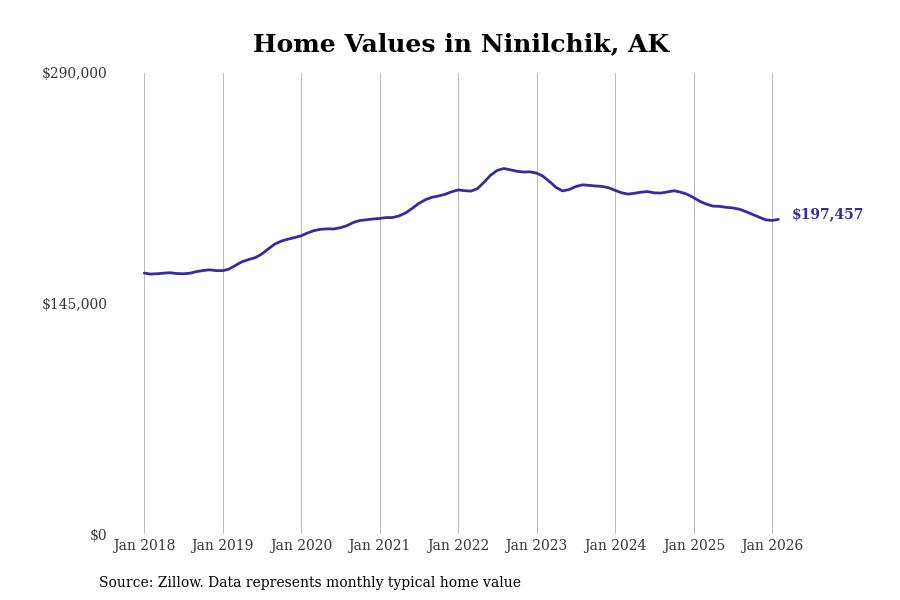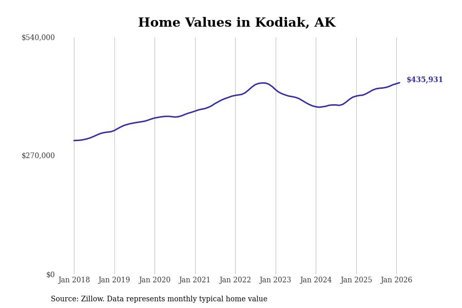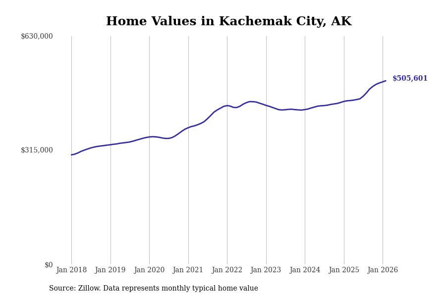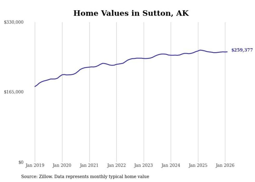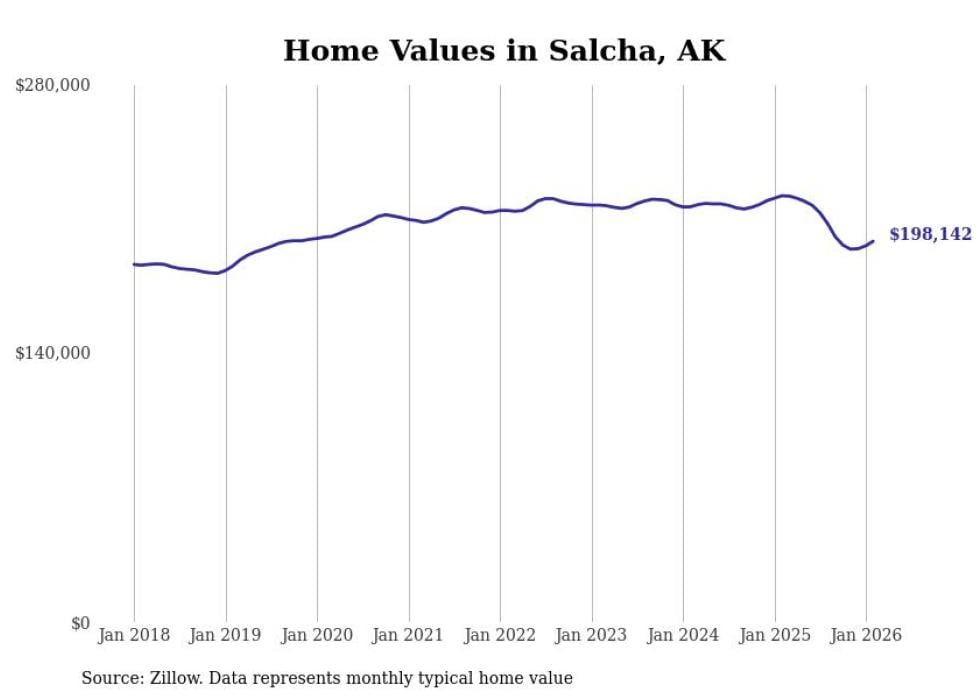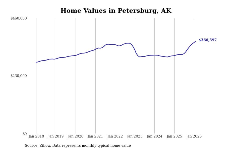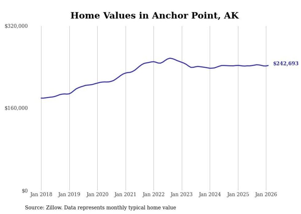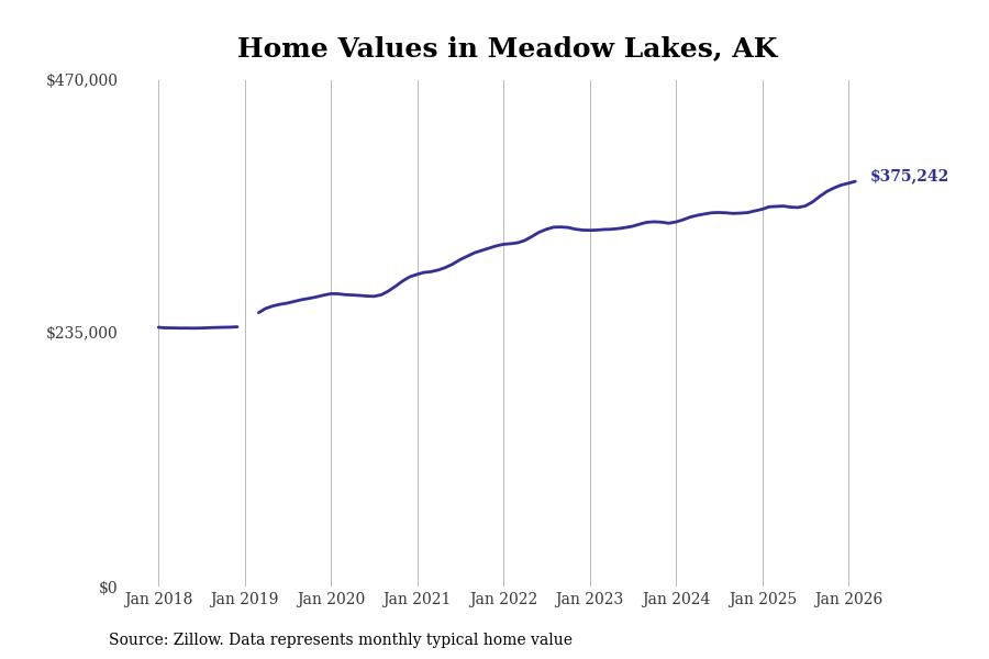 Stacker compiled a list of cities with the fastest-growing home prices in Alaska using data from Zillow. Cities are ranked by the dollar change in the Zillow Home Values Index for all homes from the 12 months ending February 2026. The charts in this story were created automatically using Matplotlib. Data was available for 40 cities and towns in Alaska.