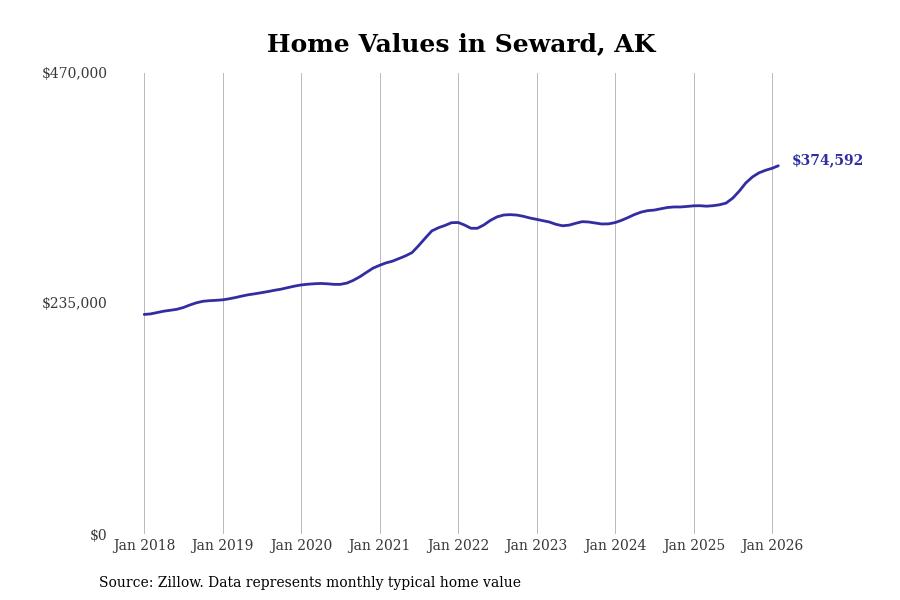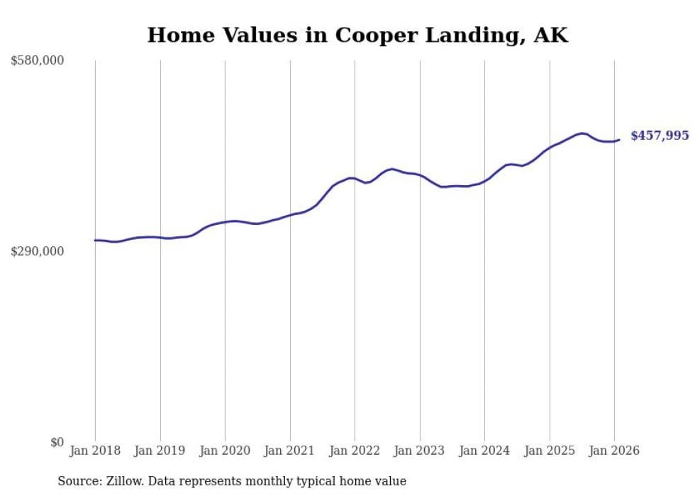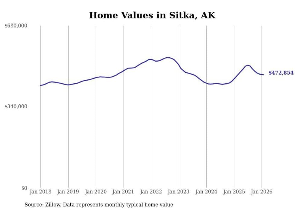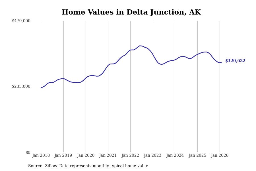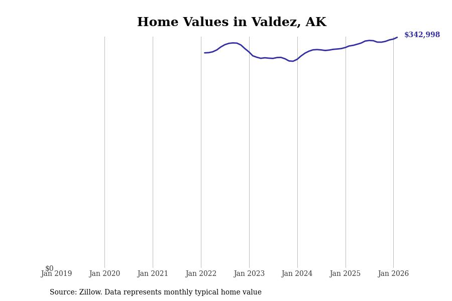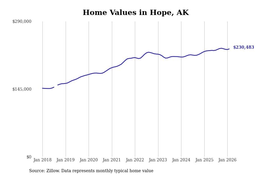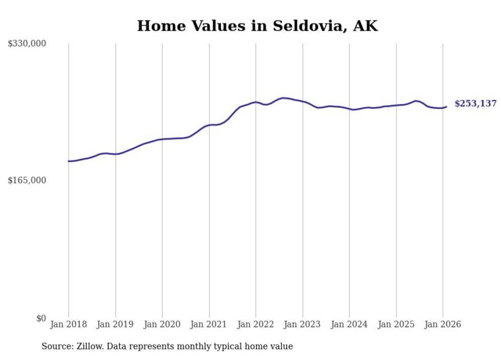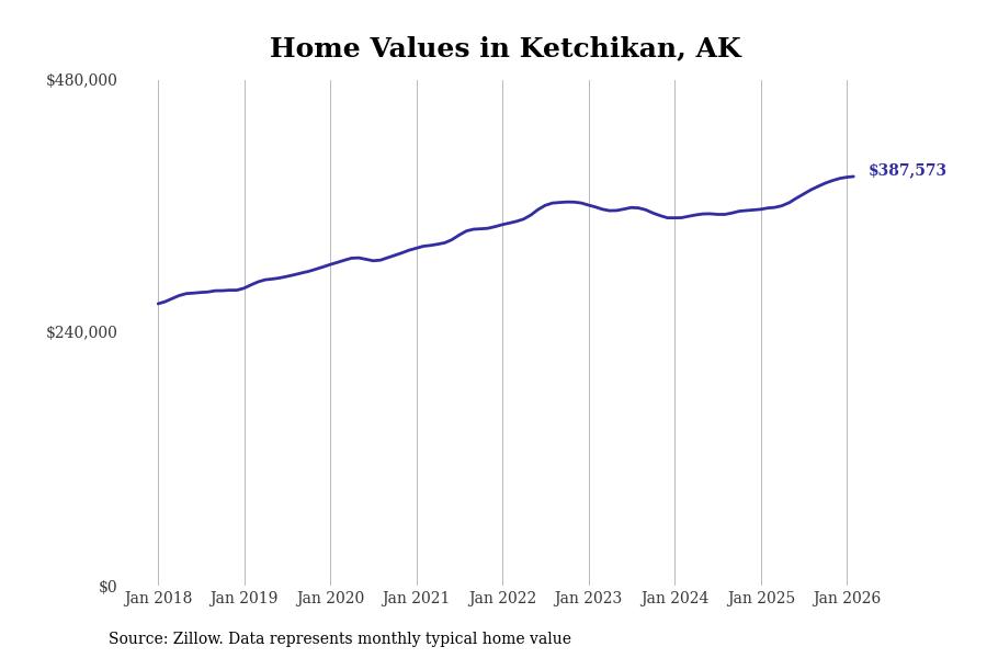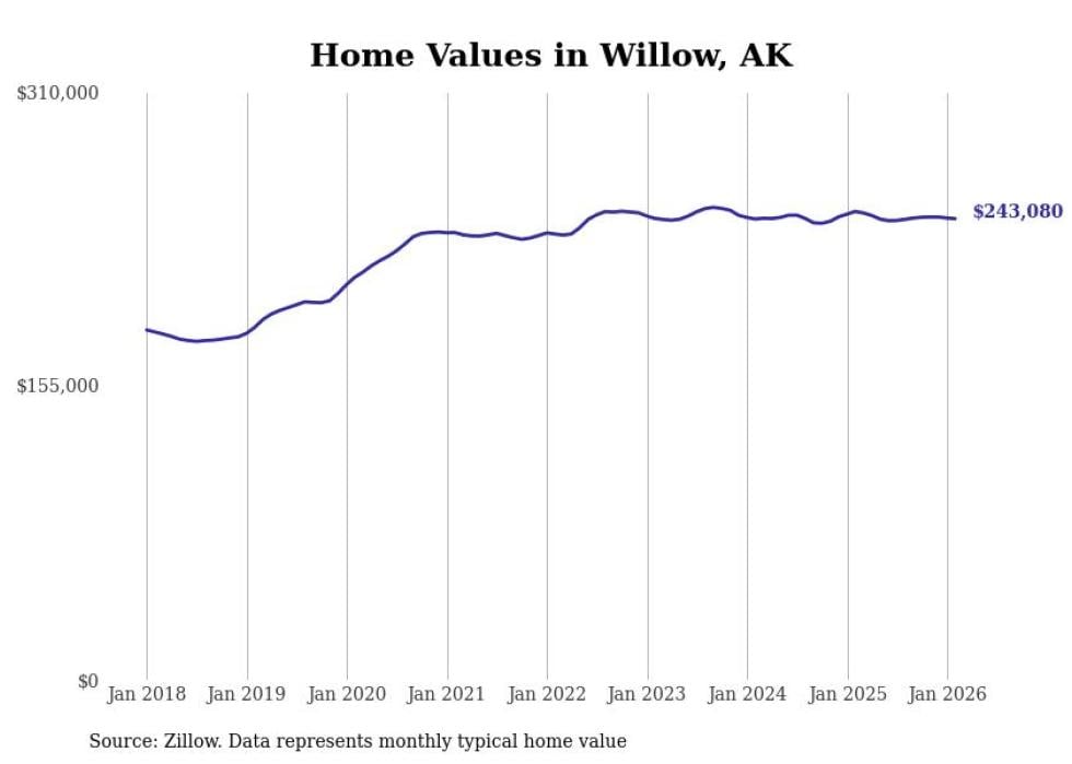 Stacker compiled a list of cities with the fastest-growing home prices in Alaska using data from Zillow. Cities are ranked by the dollar change in the Zillow Home Values Index for all homes from the 12 months ending February 2026. The charts in this story were created automatically using Matplotlib. Data was available for 40 cities and towns in Alaska.