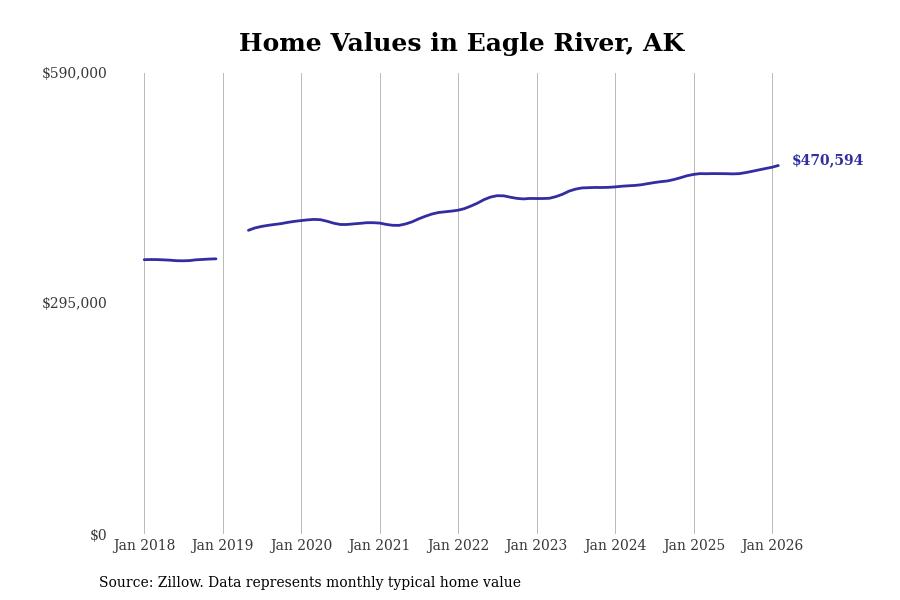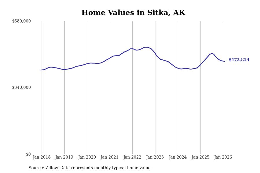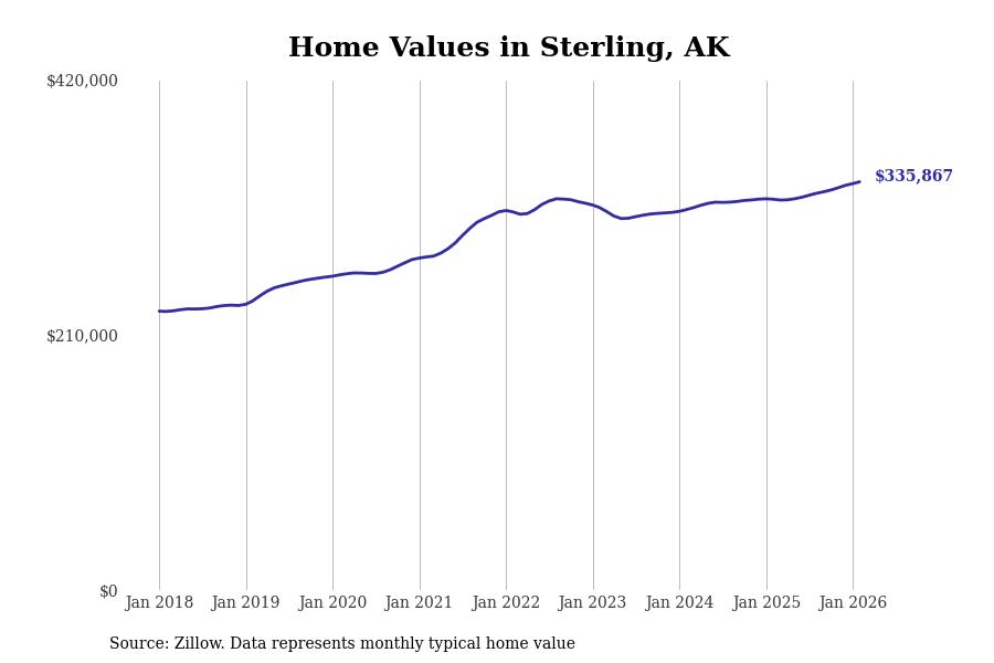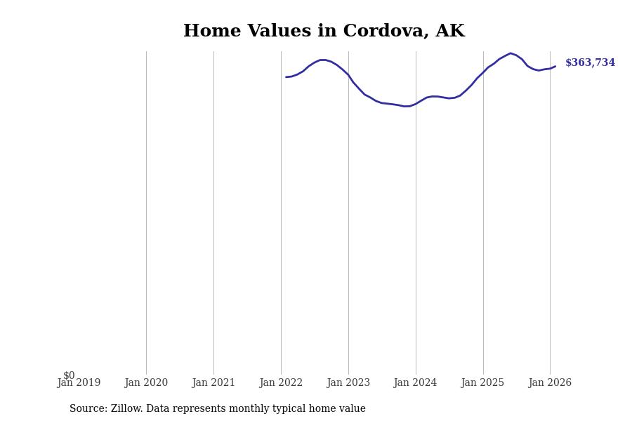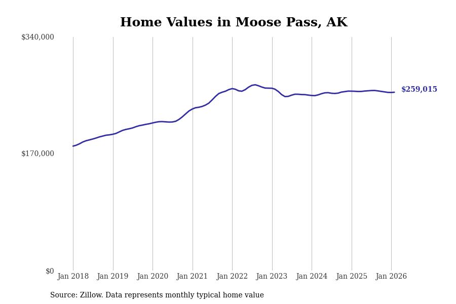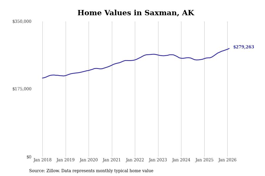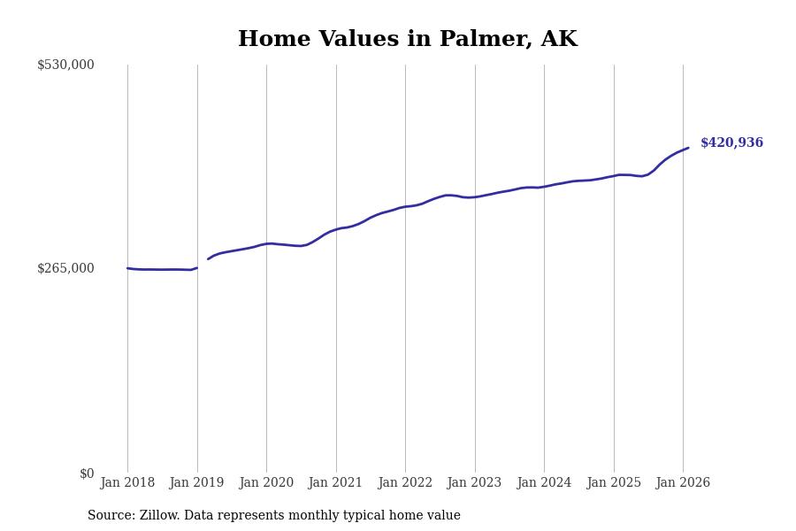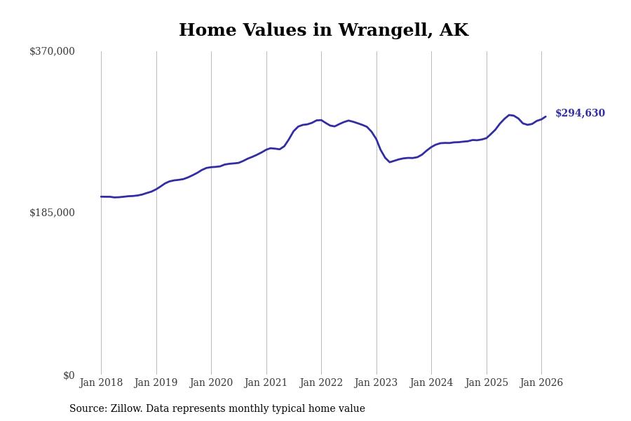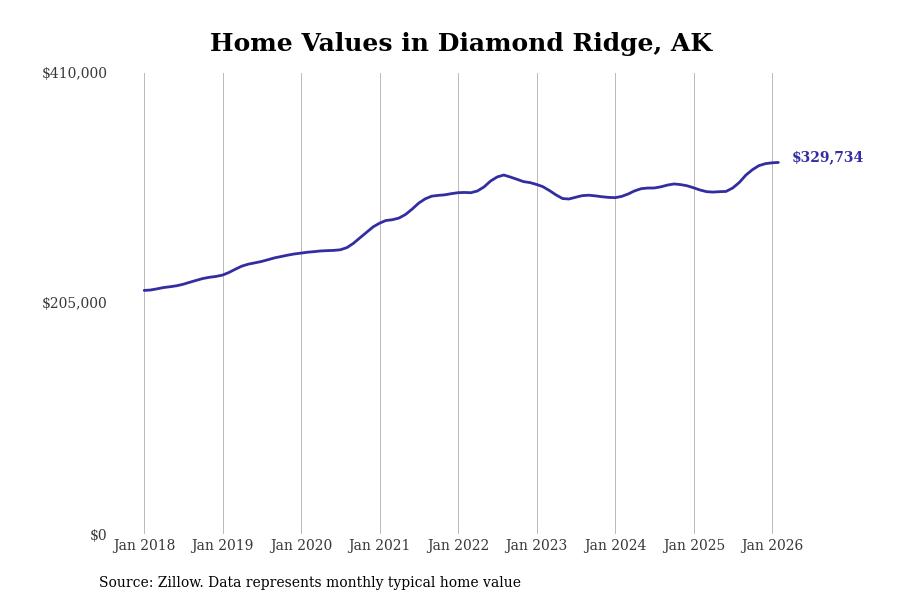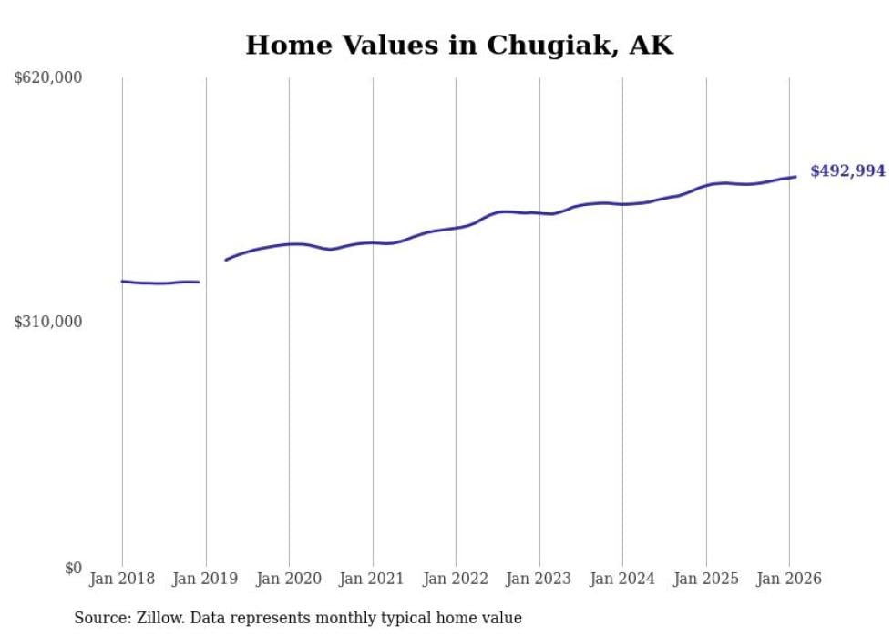Stacker compiled a list of cities with the fastest-growing home prices in Alaska using data from Zillow. Cities are ranked by the dollar change in the Zillow Home Values Index for all homes from the 12 months ending February 2026. The charts in this story were created automatically using Matplotlib. Data was available for 40 cities and towns in Alaska.