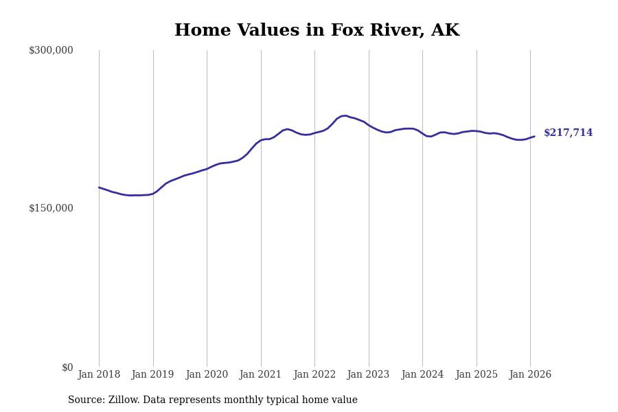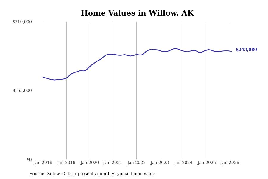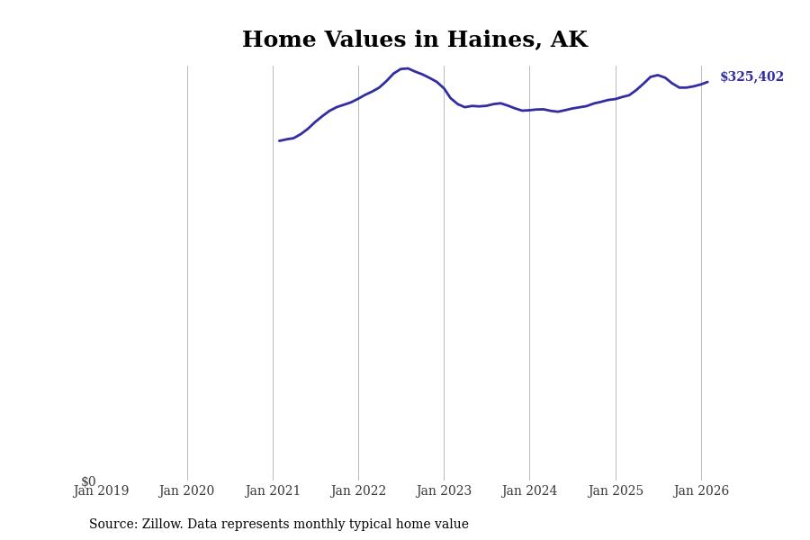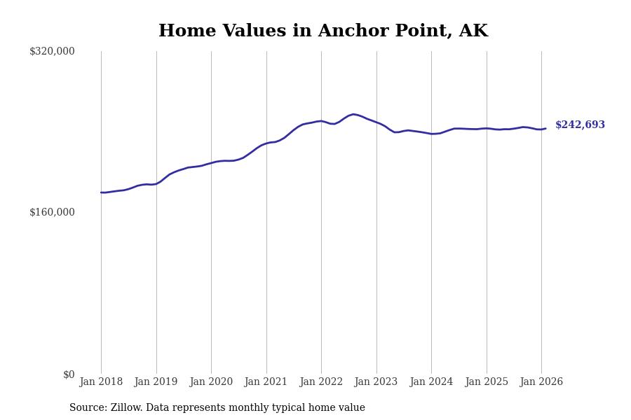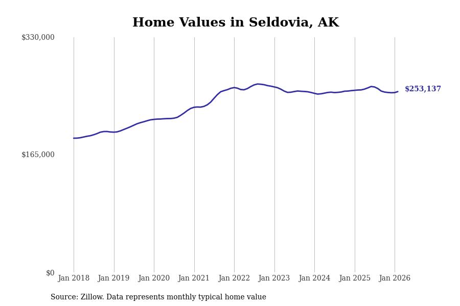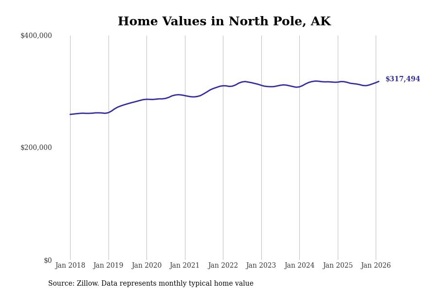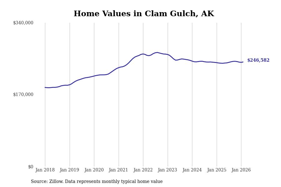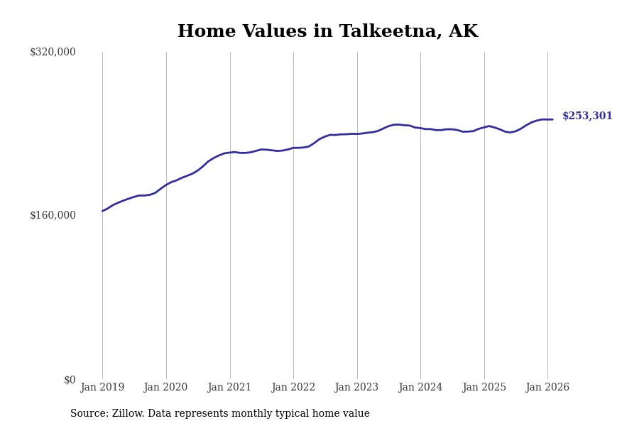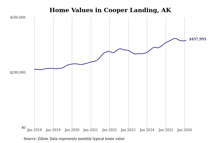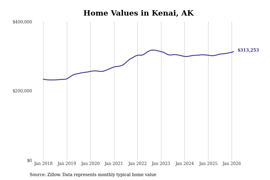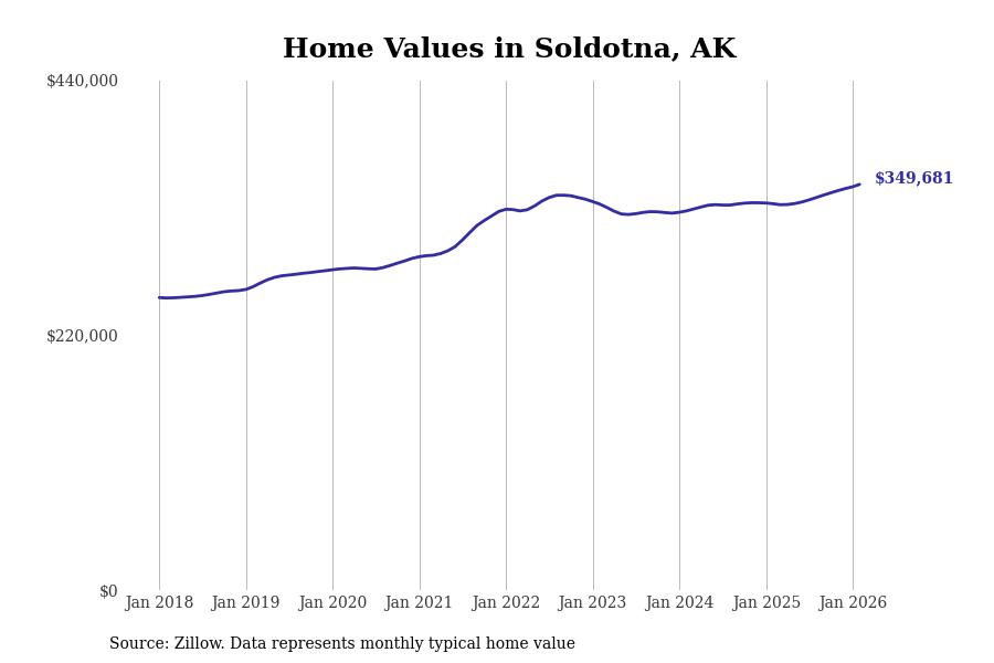 Stacker compiled a list of cities with the fastest-growing home prices in Alaska using data from Zillow. Cities are ranked by the dollar change in the Zillow Home Values Index for all homes from the 12 months ending February 2026. The charts in this story were created automatically using Matplotlib. Data was available for 40 cities and towns in Alaska.