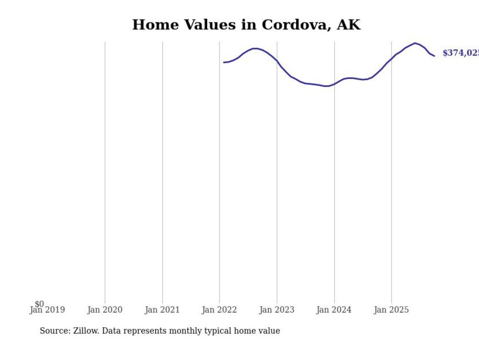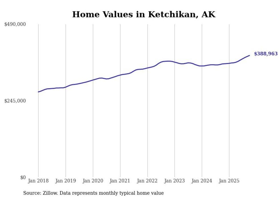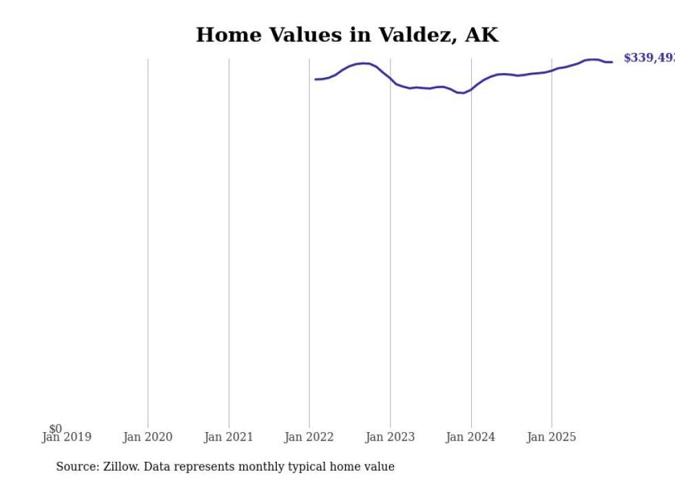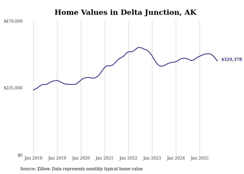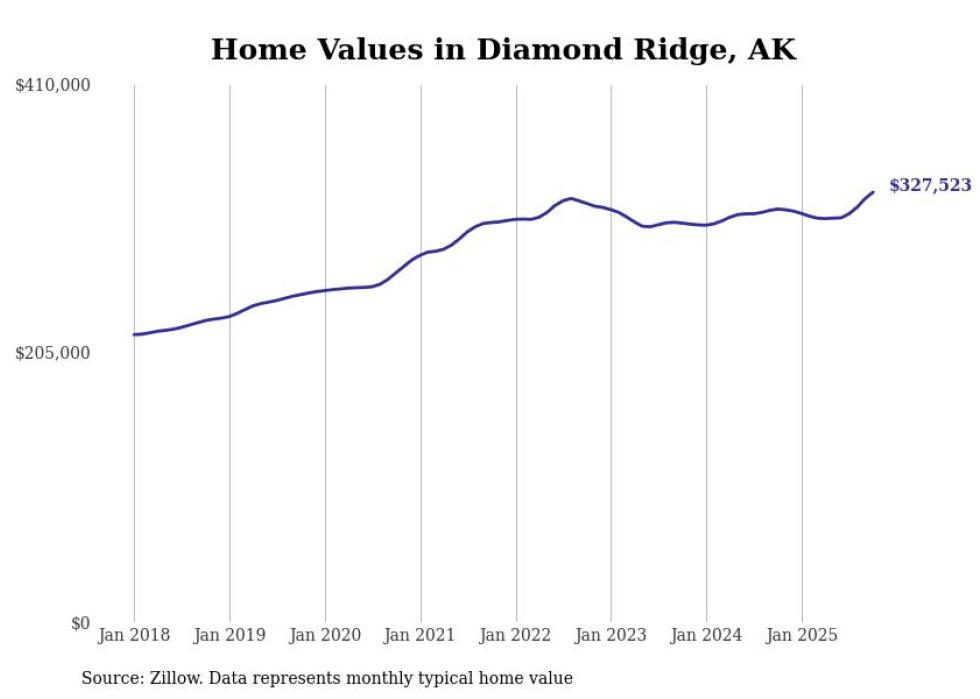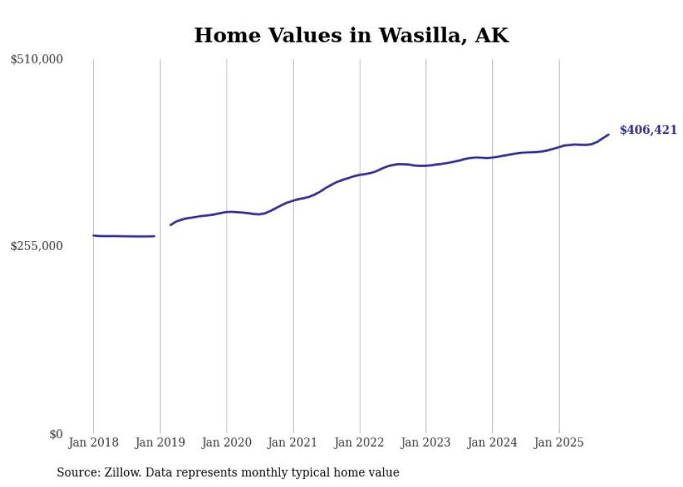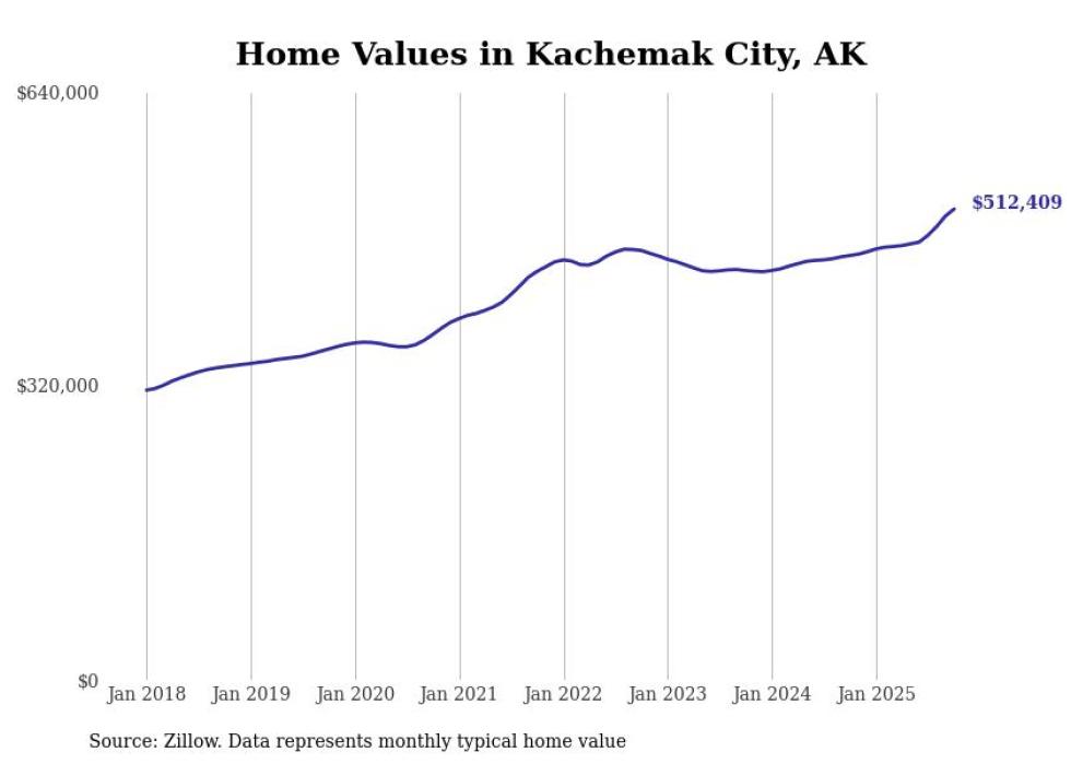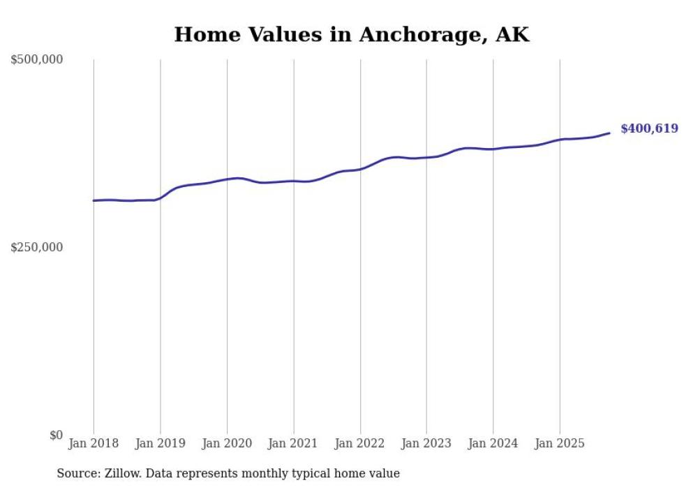 Stacker compiled a list of cities with the fastest-growing home prices in Alaska using data from Zillow. Cities are ranked by the dollar change in the Zillow Home Values Index for all homes from the 12 months ending October 2025. The charts in this story were created automatically using Matplotlib. Data was available for 40 cities and towns in Alaska.