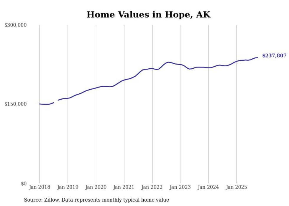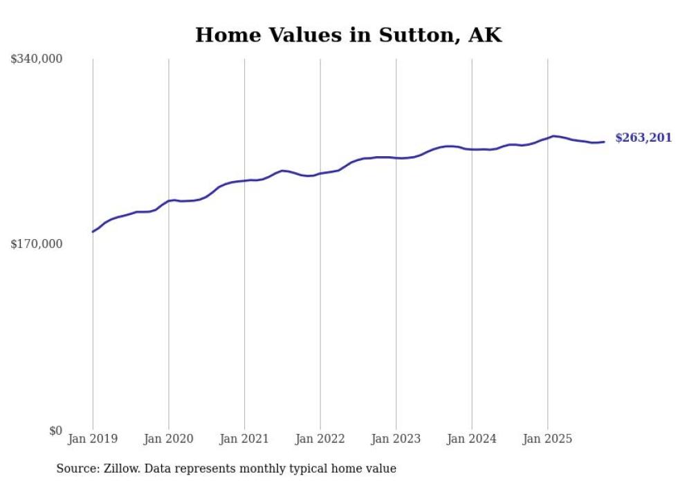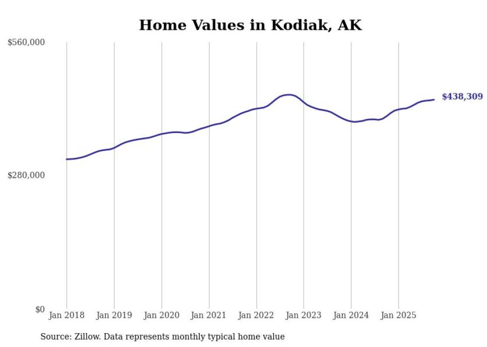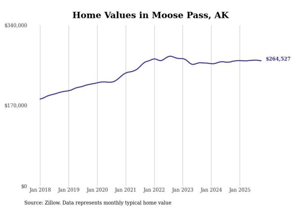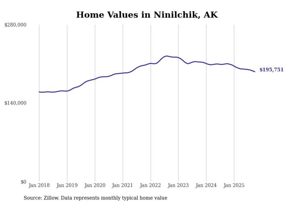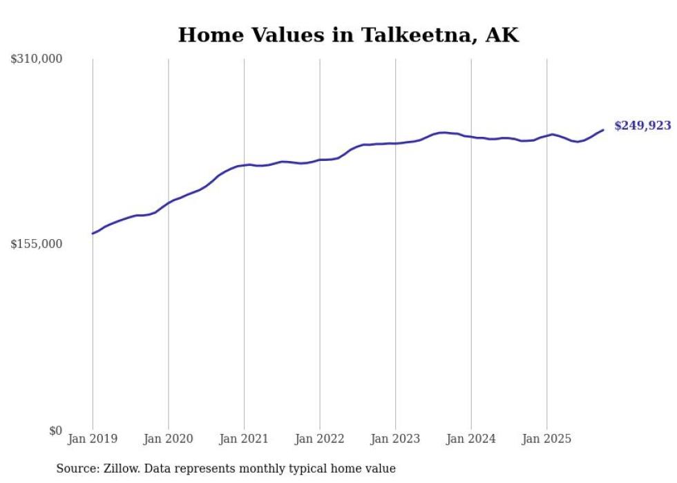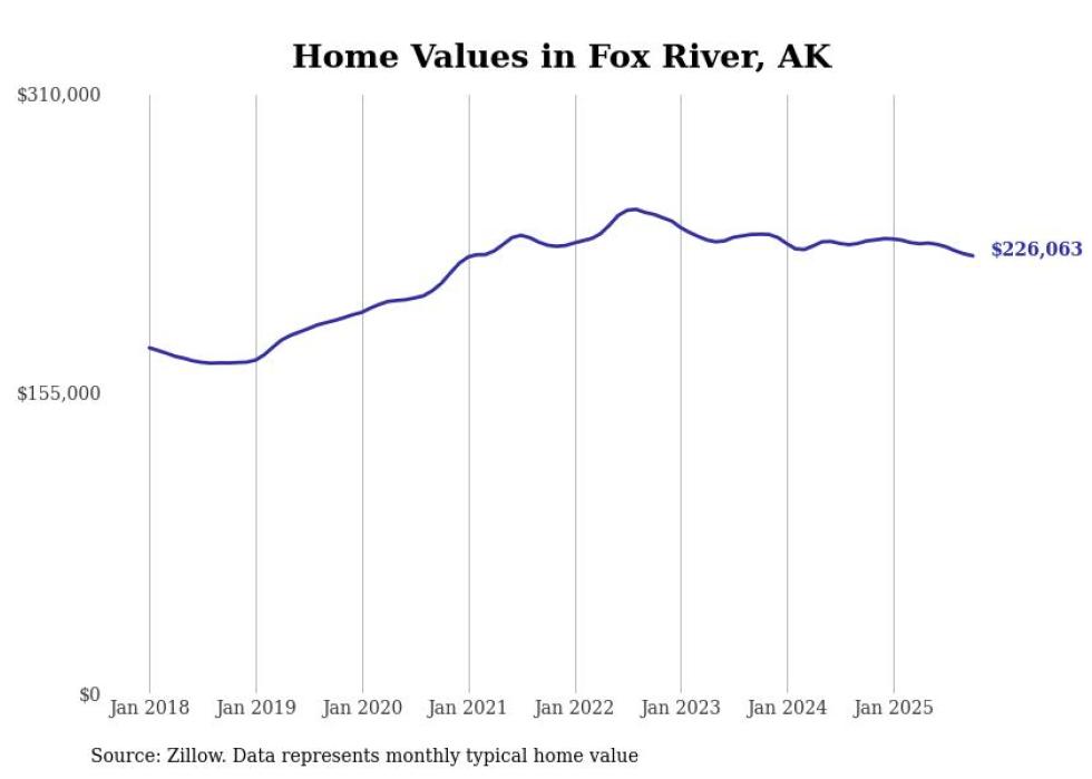 Stacker compiled a list of cities with the fastest-growing home prices in Alaska using data from Zillow. Cities are ranked by the dollar change in the Zillow Home Values Index for all homes from the 12 months ending October 2025. The charts in this story were created automatically using Matplotlib. Data was available for 40 cities and towns in Alaska.