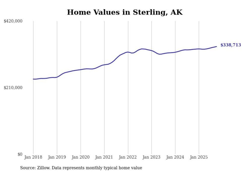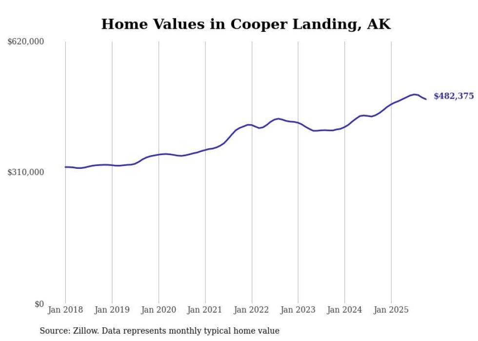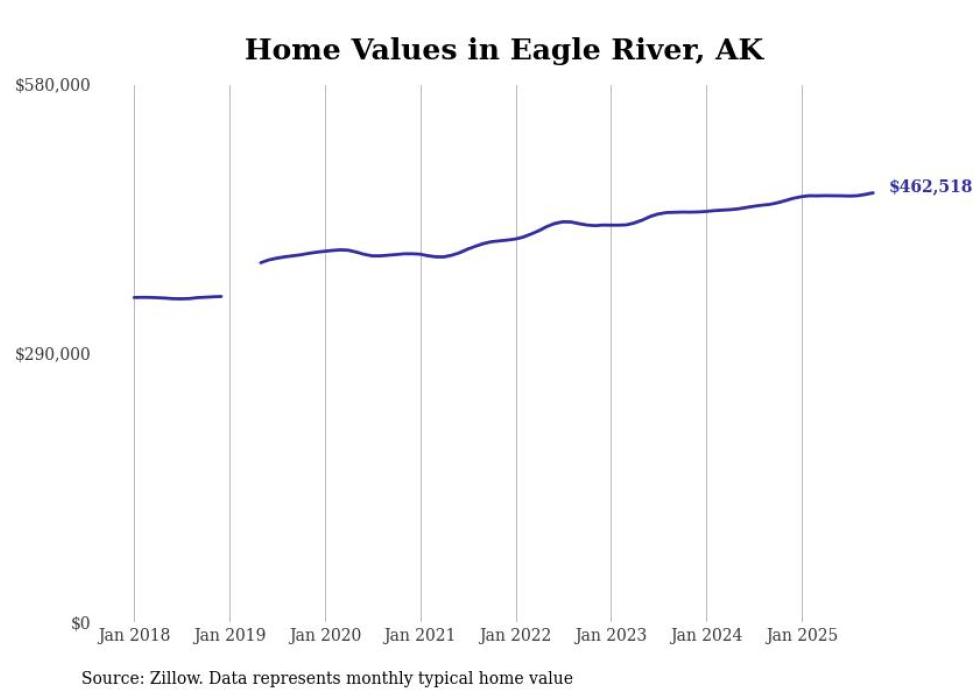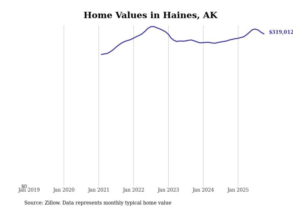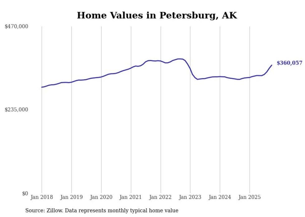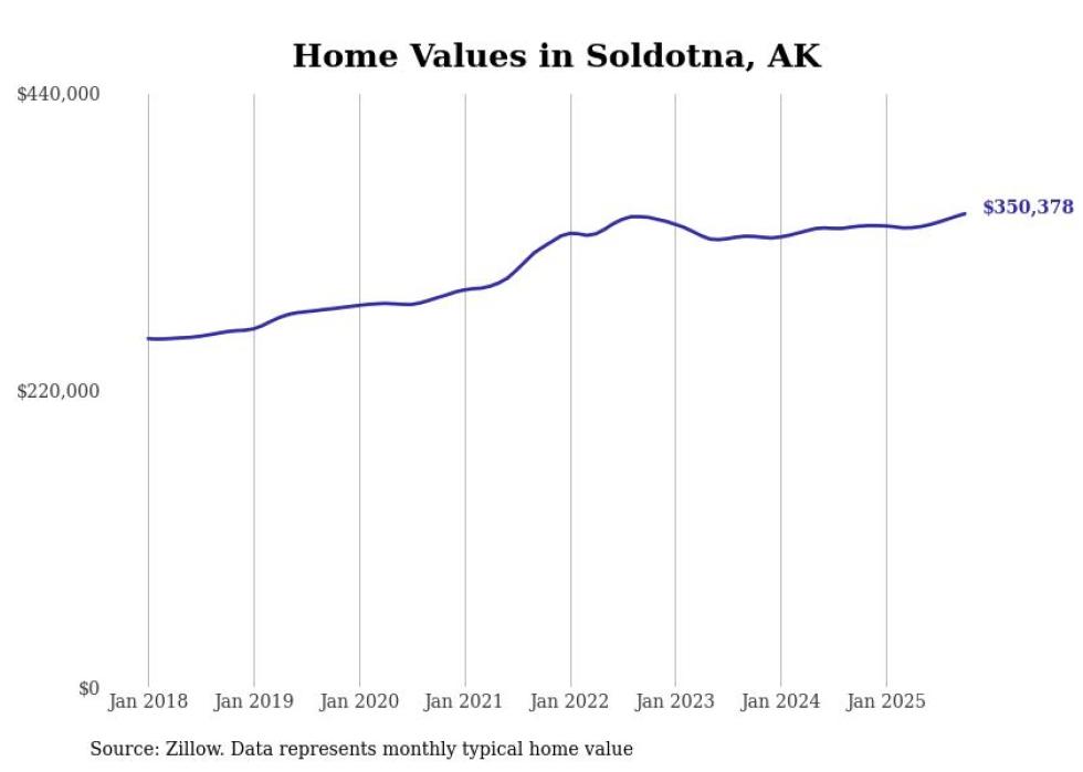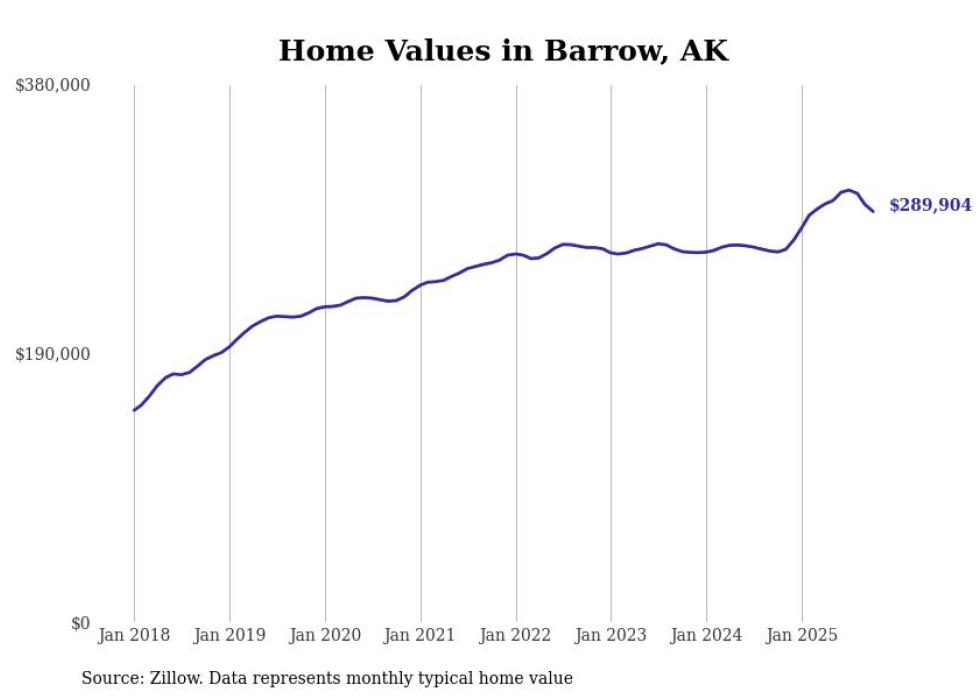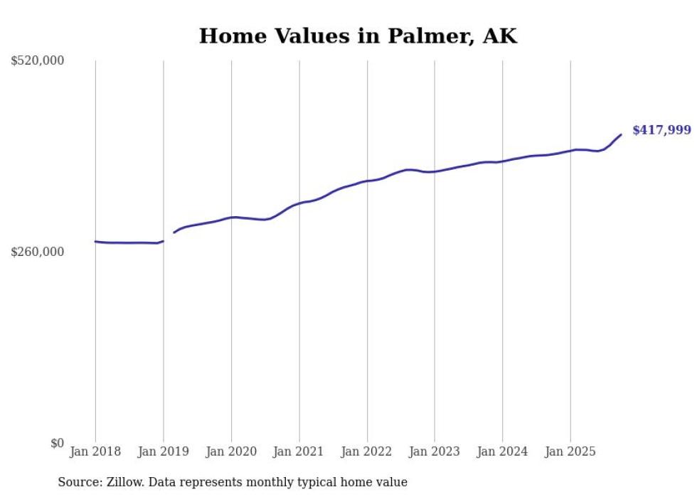 Stacker compiled a list of cities with the fastest-growing home prices in Alaska using data from Zillow. Cities are ranked by the dollar change in the Zillow Home Values Index for all homes from the 12 months ending October 2025. The charts in this story were created automatically using Matplotlib. Data was available for 40 cities and towns in Alaska.
