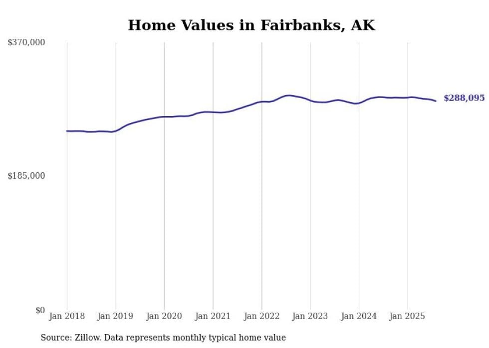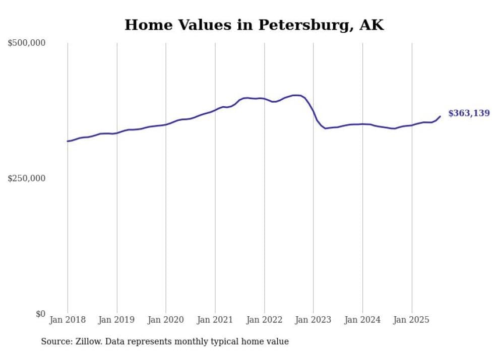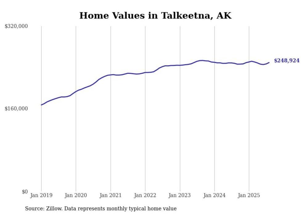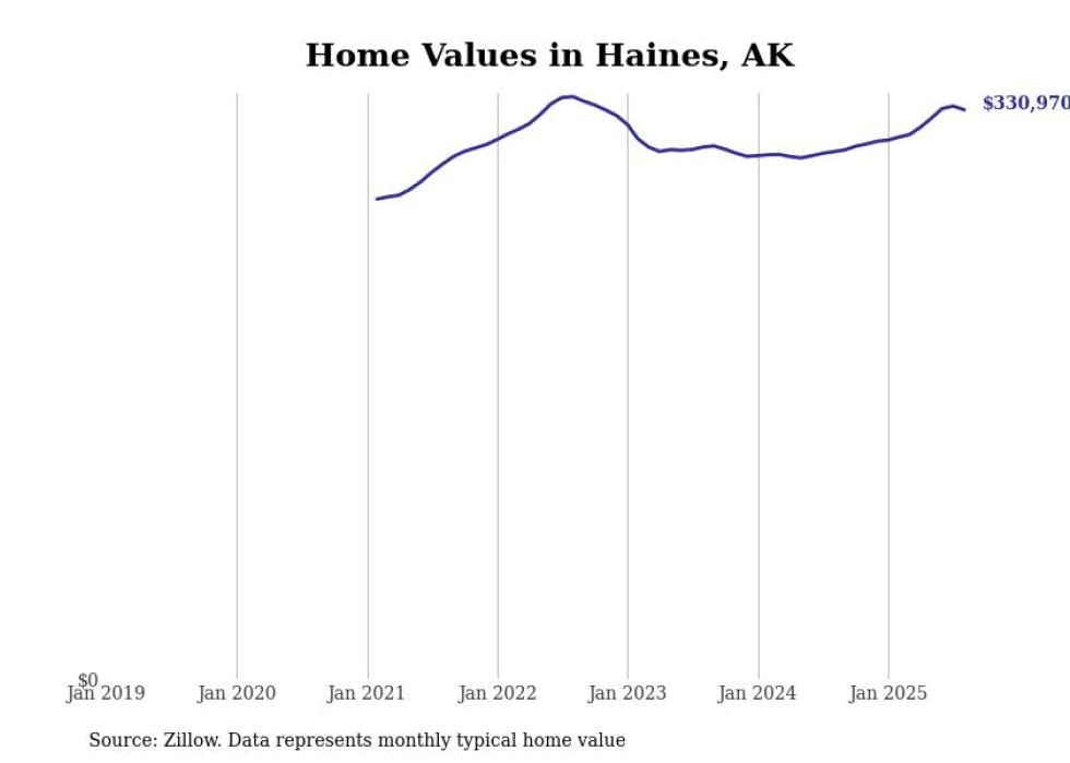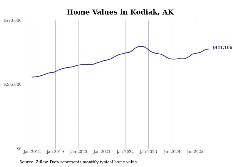 Stacker compiled a list of cities with the fastest-growing home prices in Alaska using data from Zillow. Cities are ranked by the dollar change in the Zillow Home Values Index for all homes from the 12 months ending August 2025. The charts in this story were created automatically using Matplotlib. Data was available for 40 cities and towns in Alaska.