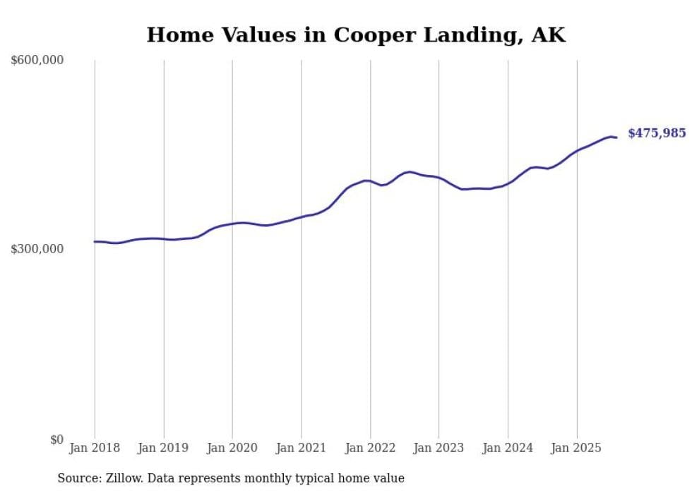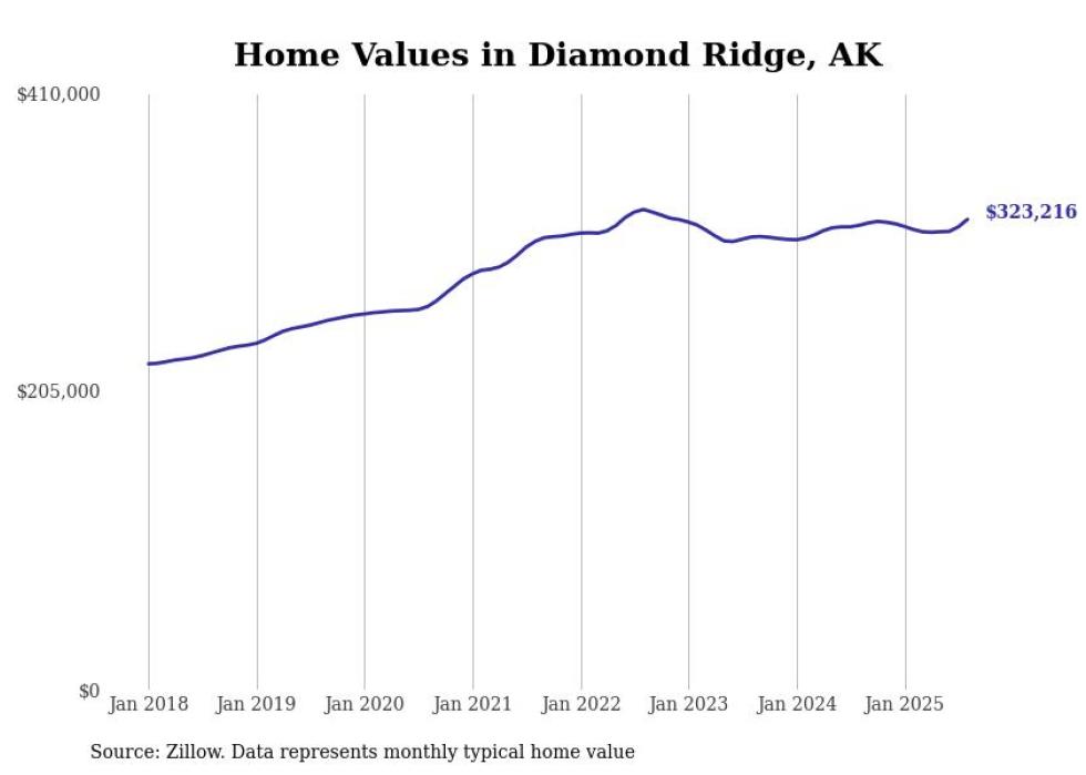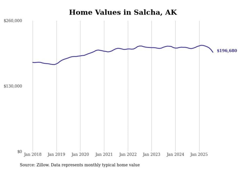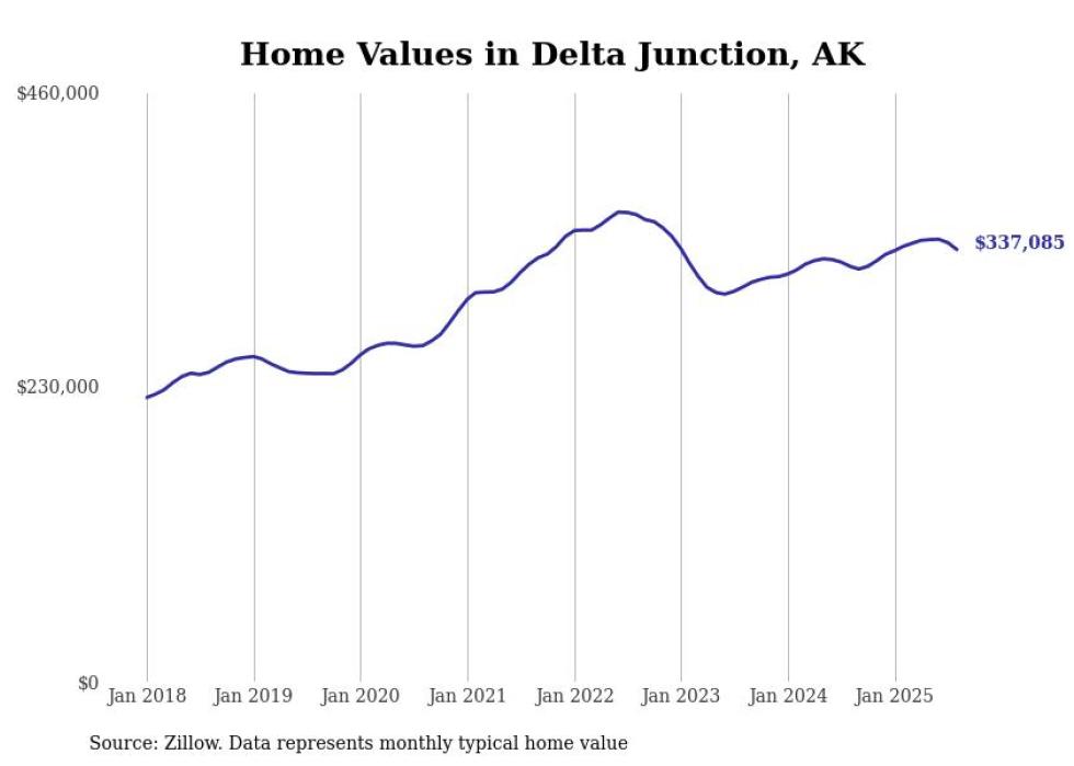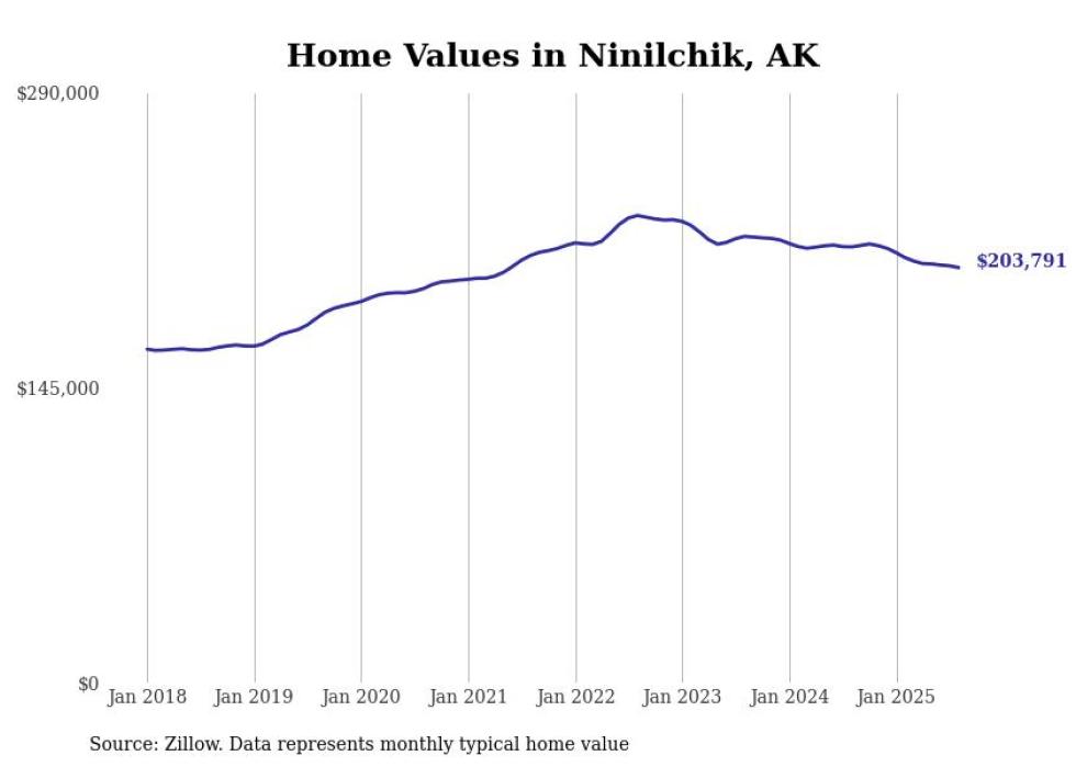 Stacker compiled a list of cities with the fastest-growing home prices in Alaska using data from Zillow. Cities are ranked by the dollar change in the Zillow Home Values Index for all homes from the 12 months ending August 2025. The charts in this story were created automatically using Matplotlib. Data was available for 40 cities and towns in Alaska.