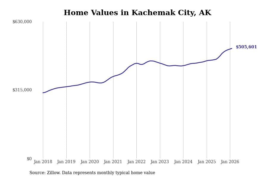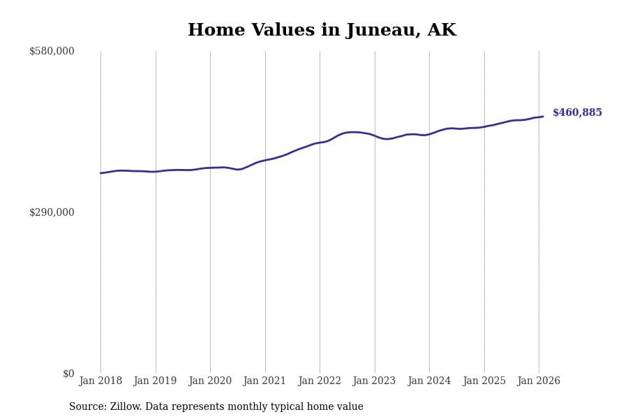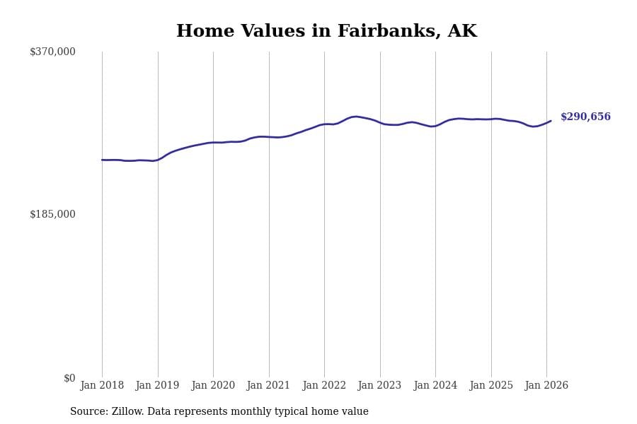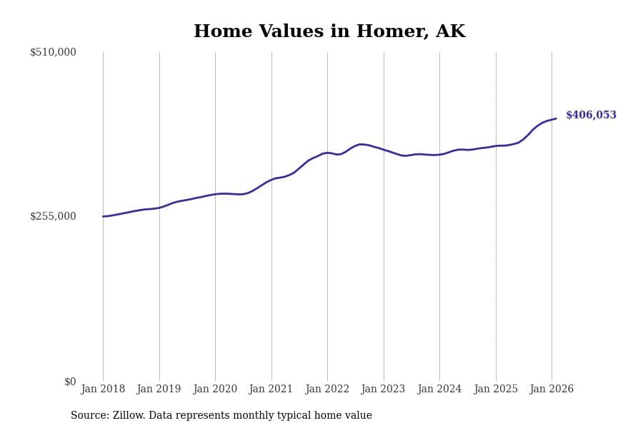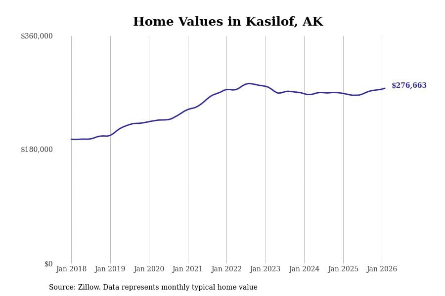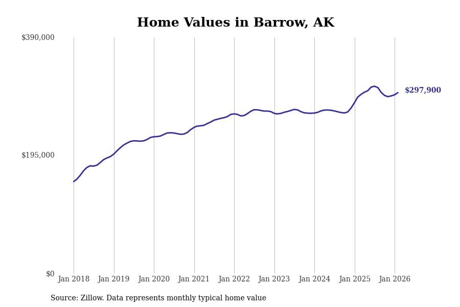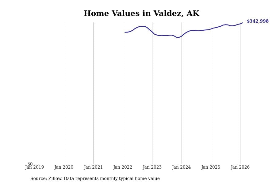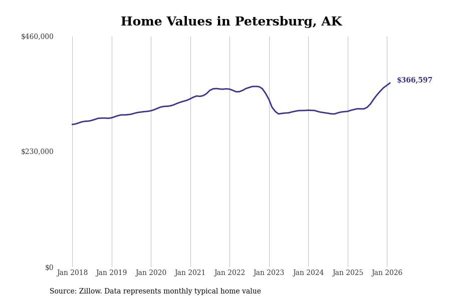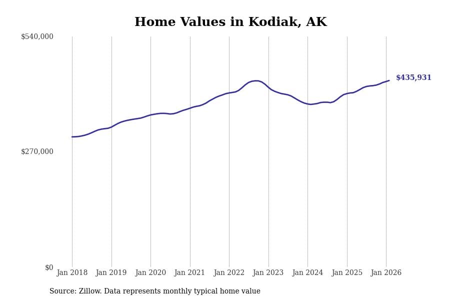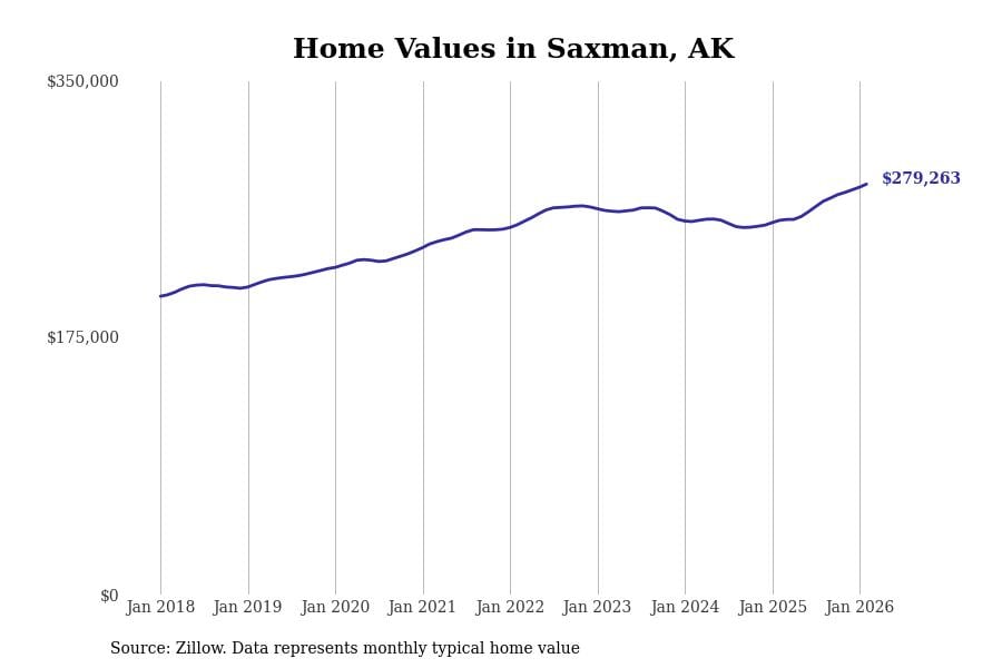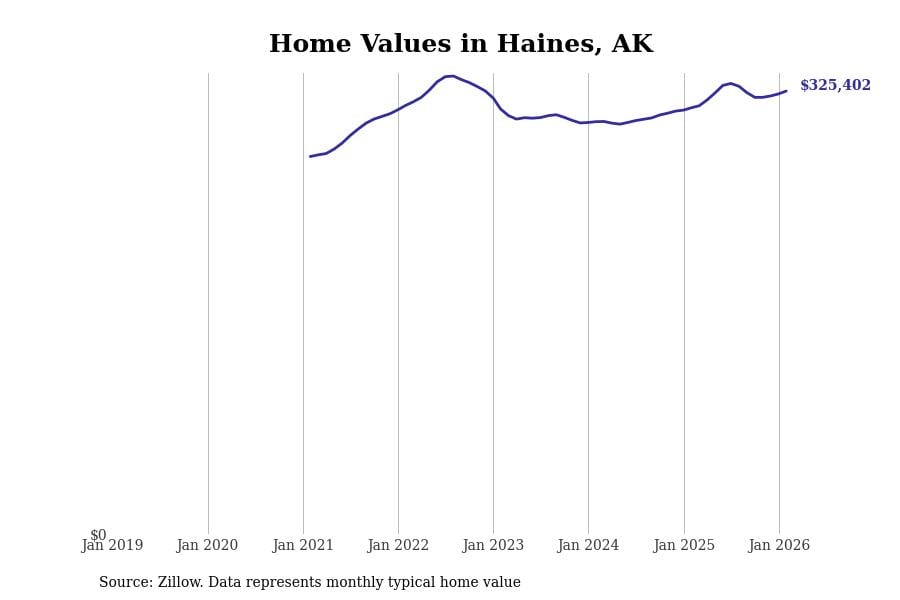 Stacker compiled a list of cities with the most expensive homes in Alaska using data from Zillow. Cities are ranked by the Zillow Home Values Index for all homes as of February 2026. The charts in this story were created automatically using Matplotlib.