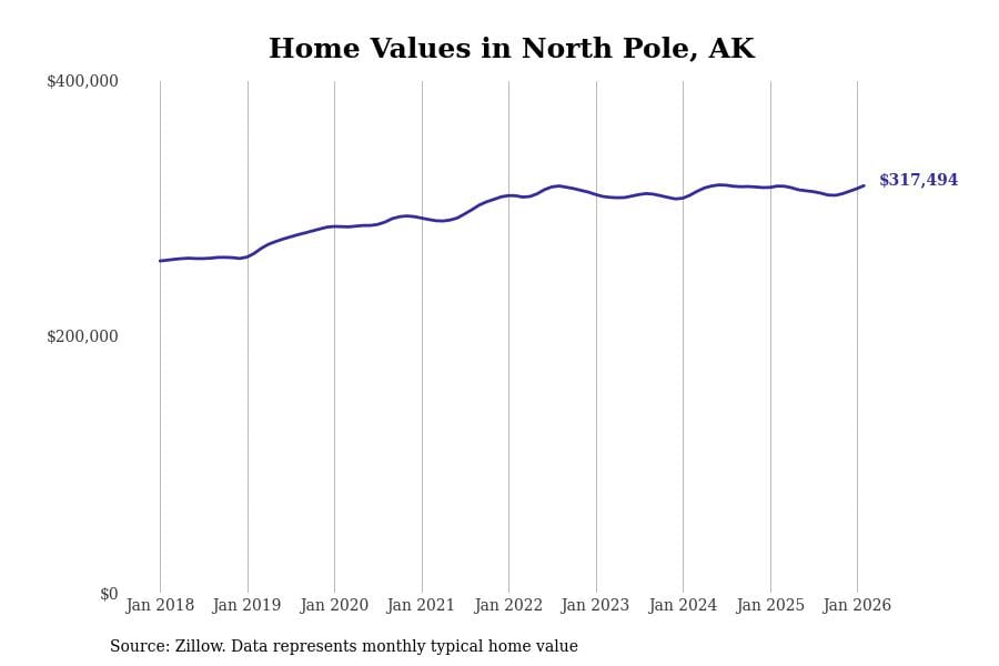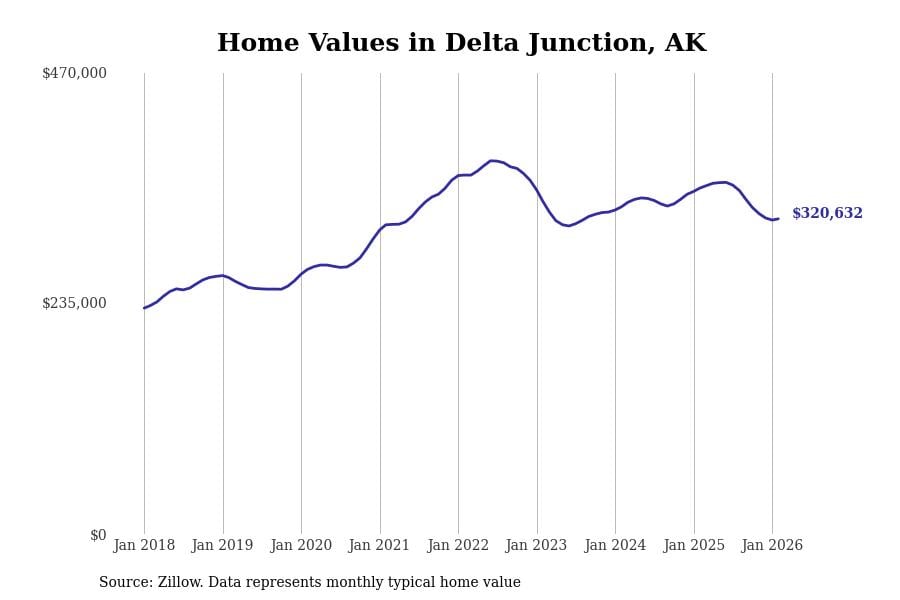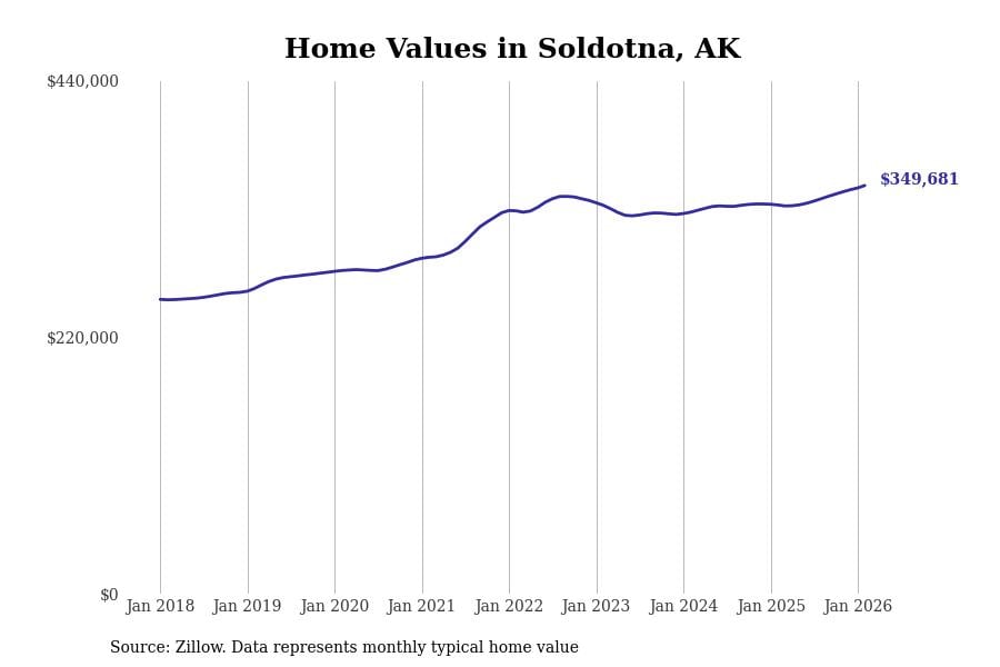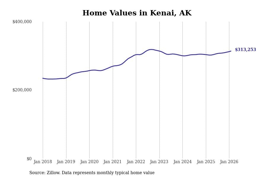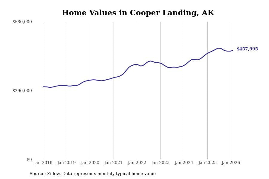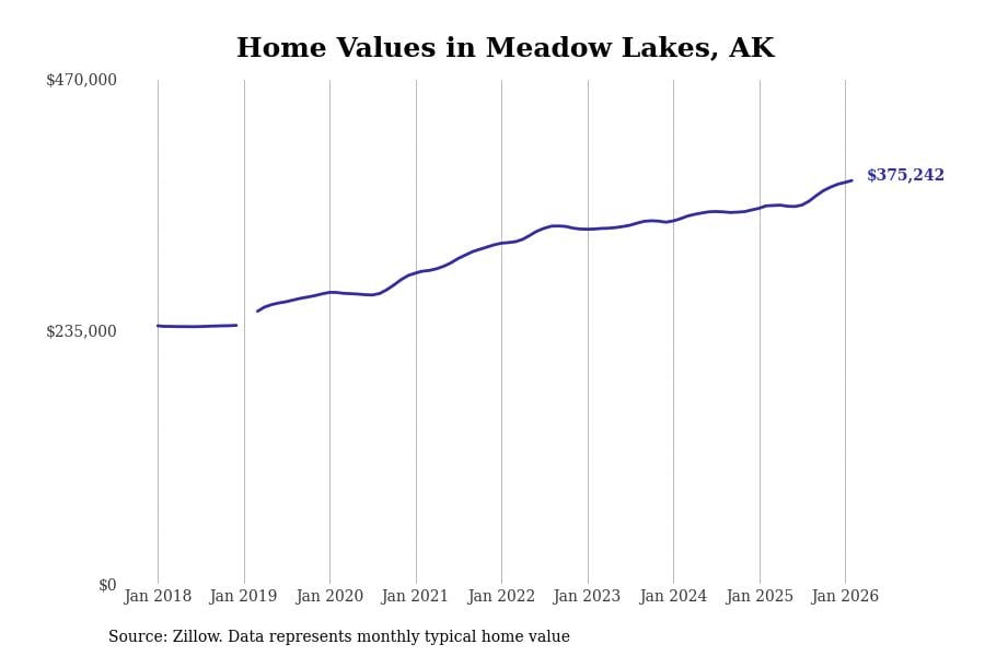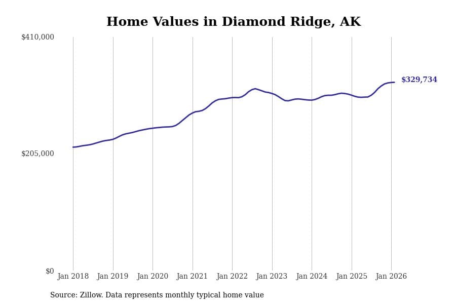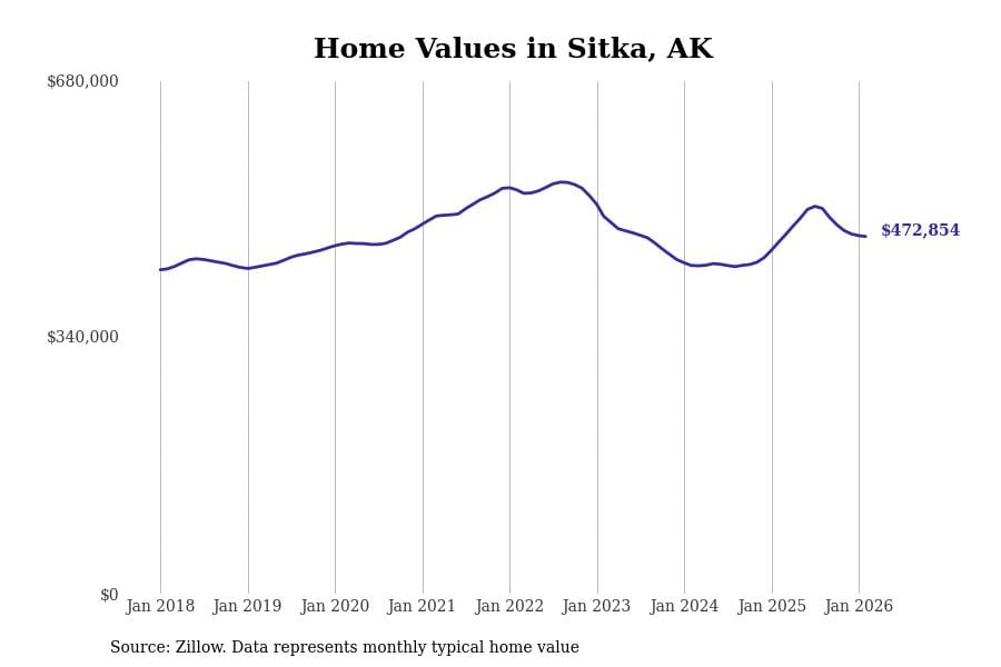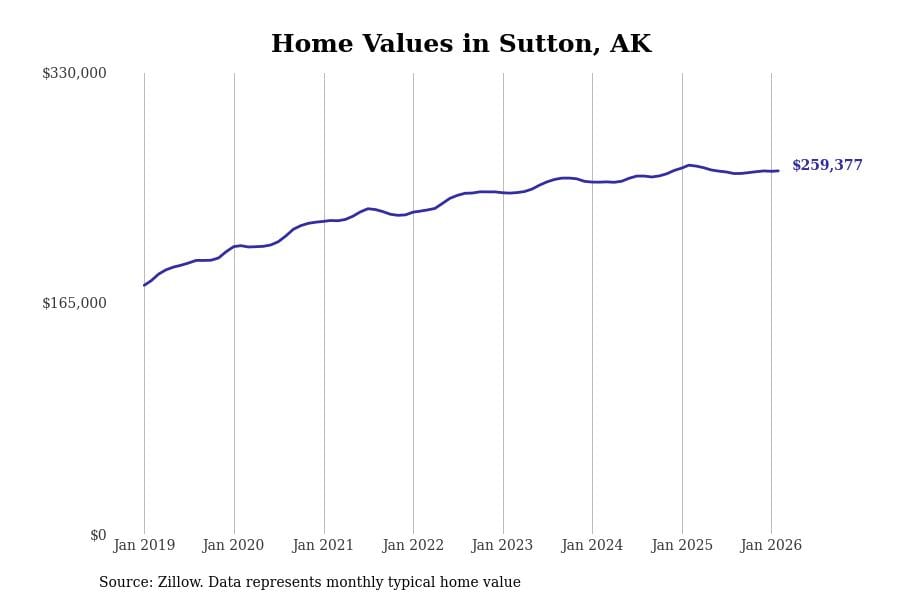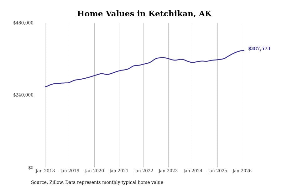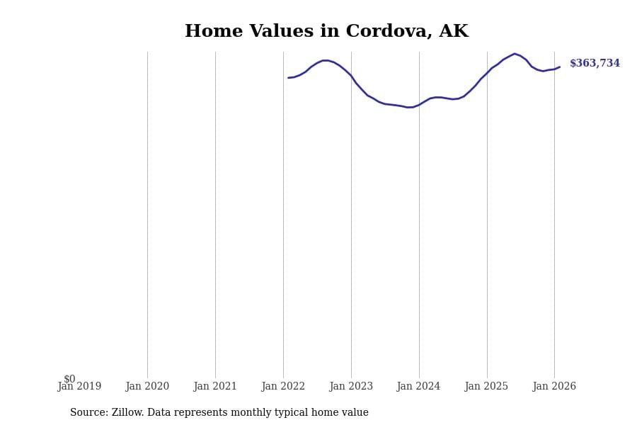 Stacker compiled a list of cities with the most expensive homes in Alaska using data from Zillow. Cities are ranked by the Zillow Home Values Index for all homes as of February 2026. The charts in this story were created automatically using Matplotlib.