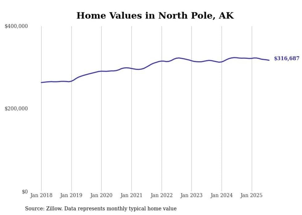 Stacker compiled a list of cities with the most expensive homes in the Fairbanks metro area using data from Zillow. Charts show the monthly typical home value since January 2018. All 3 cities and towns with data available were included in the list.