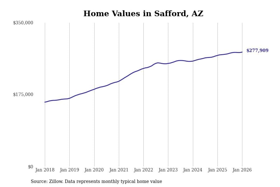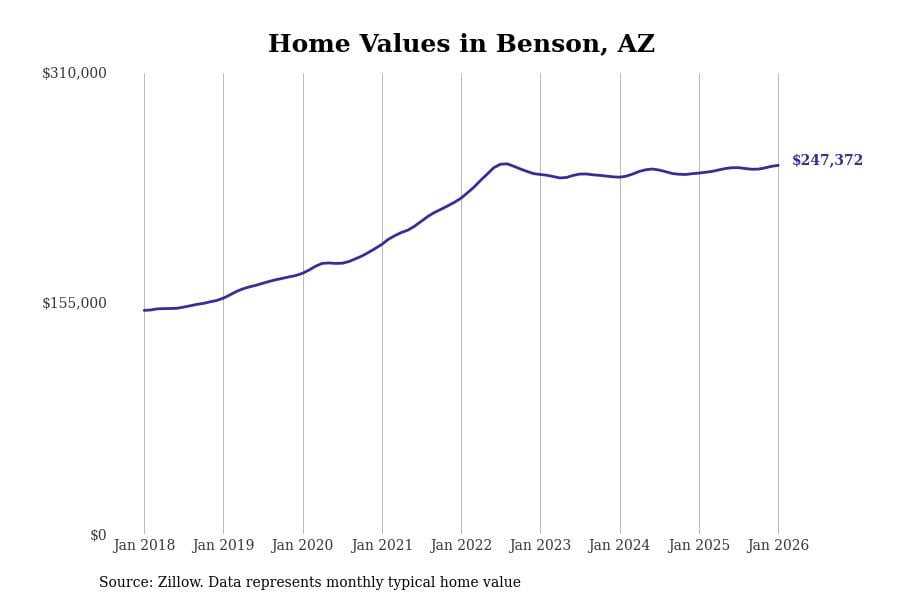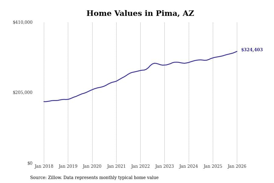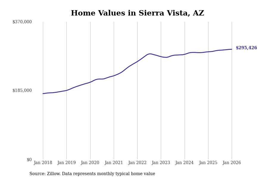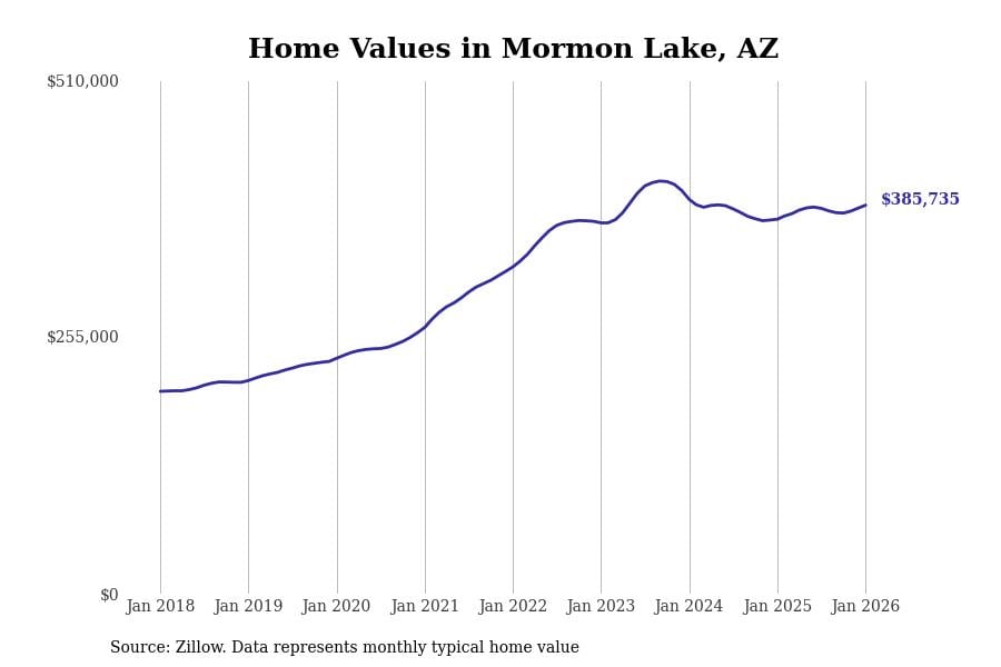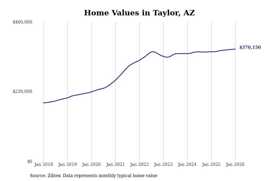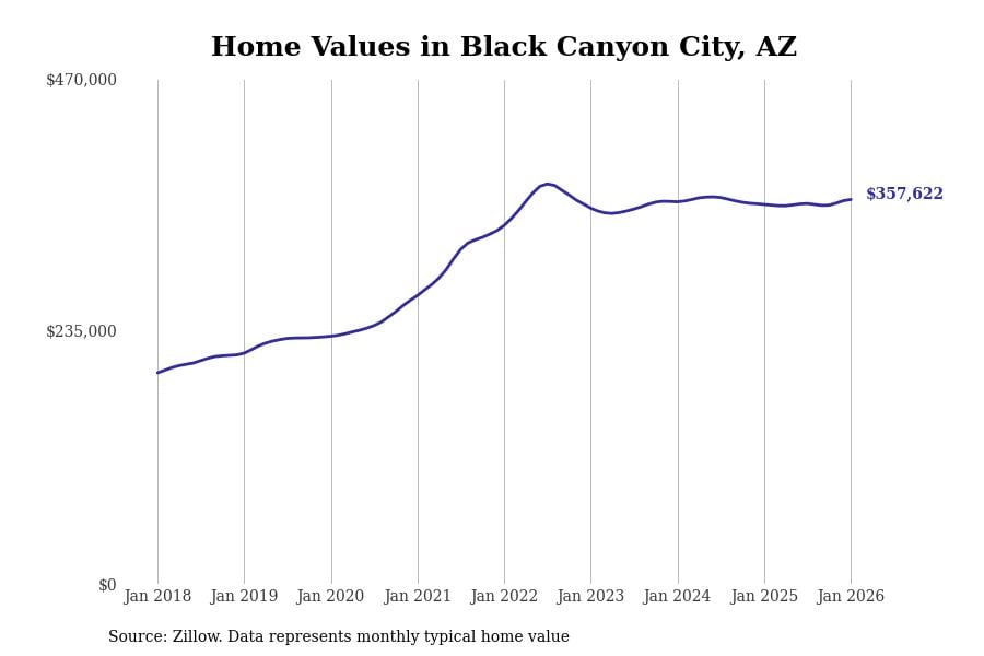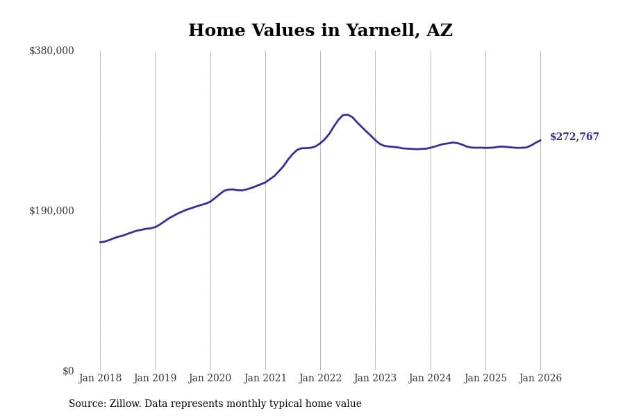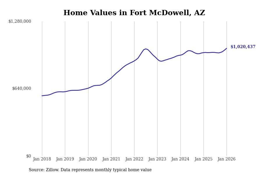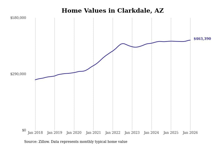 Stacker compiled a list of cities with the fastest-growing home prices in Arizona using data from Zillow. Cities are ranked by the dollar change in the Zillow Home Values Index for all homes from the 12 months ending January 2026. The charts in this story were created automatically using Matplotlib. Data was available for 50 cities and towns in Arizona.