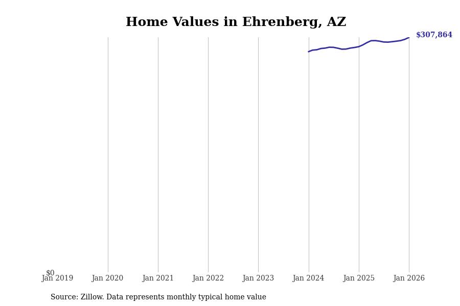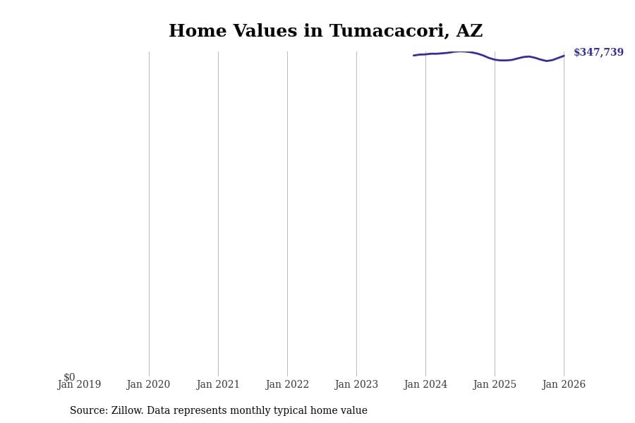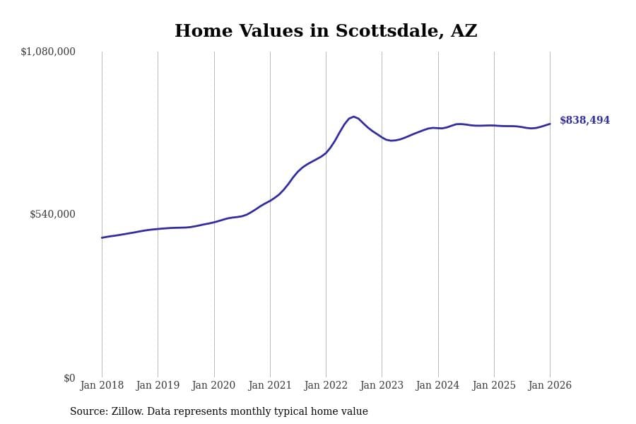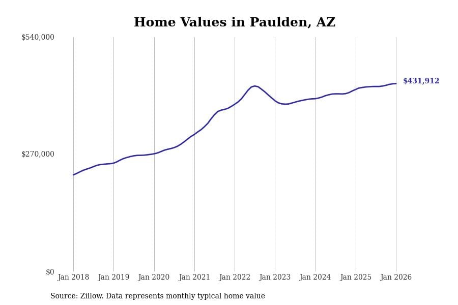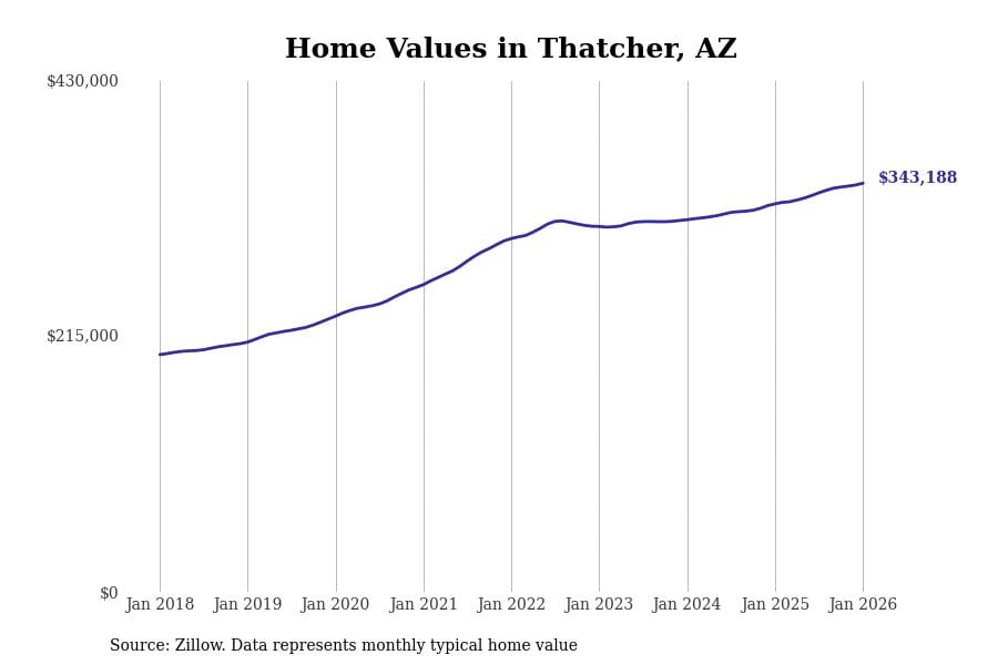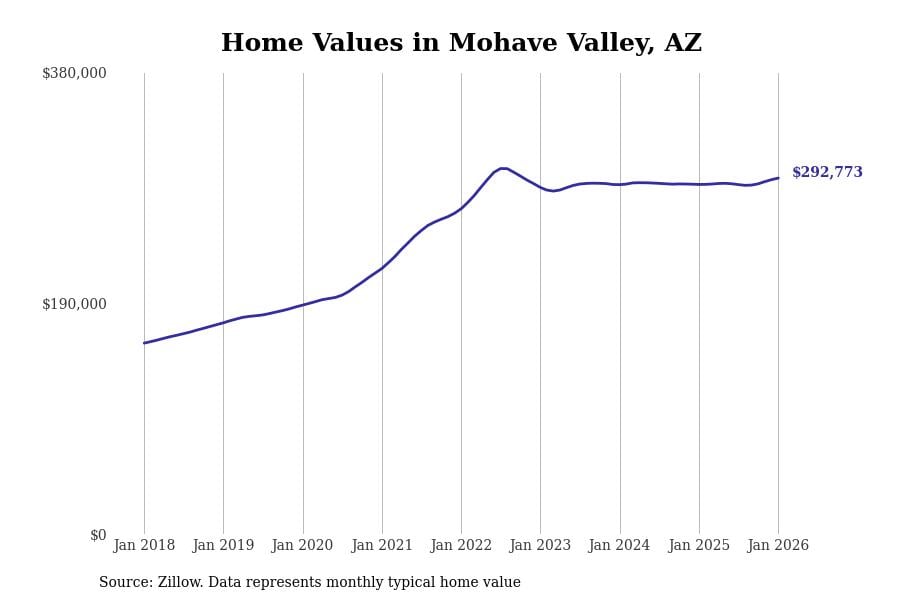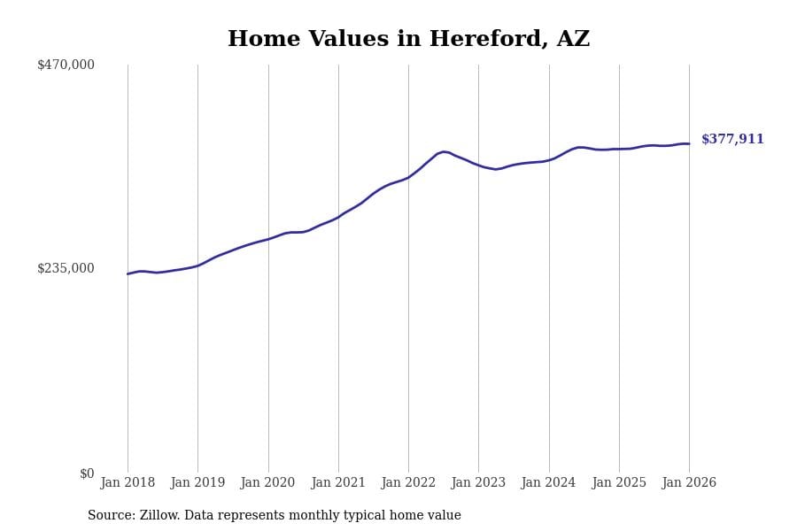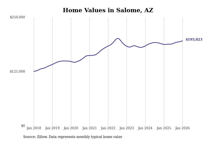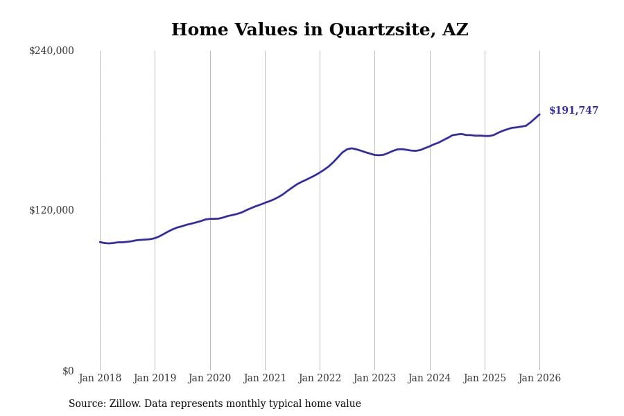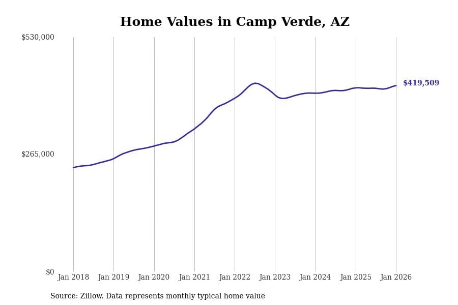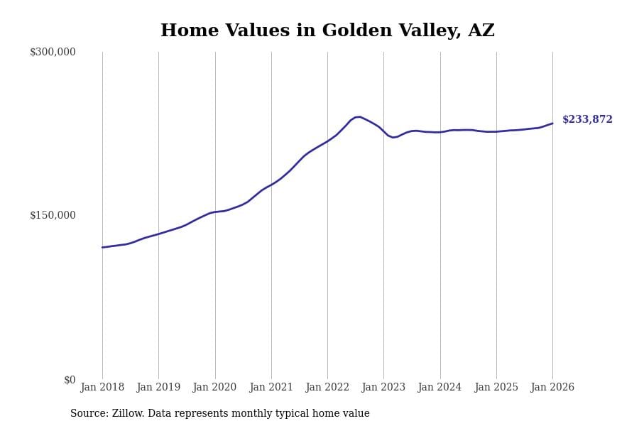 Stacker compiled a list of cities with the fastest-growing home prices in Arizona using data from Zillow. Cities are ranked by the dollar change in the Zillow Home Values Index for all homes from the 12 months ending January 2026. The charts in this story were created automatically using Matplotlib. Data was available for 50 cities and towns in Arizona.