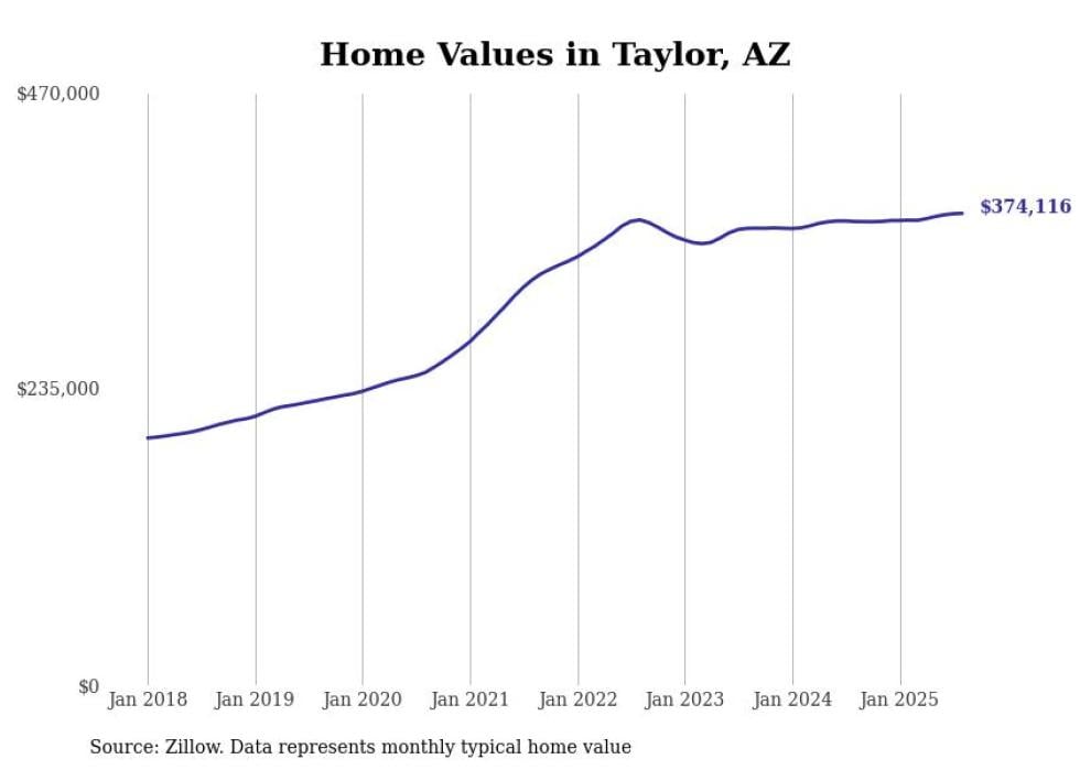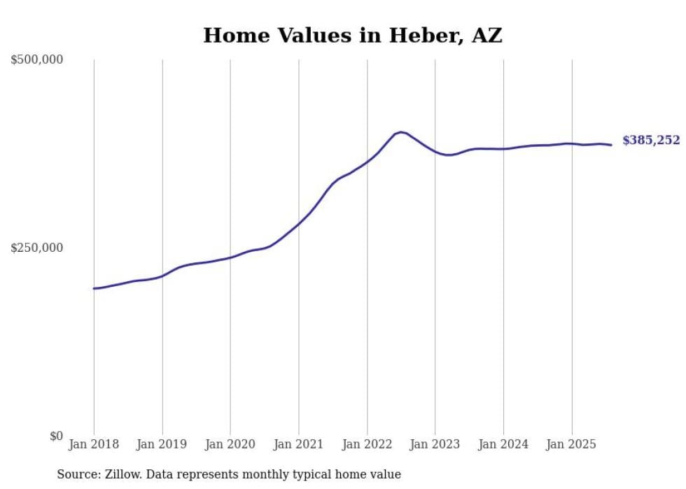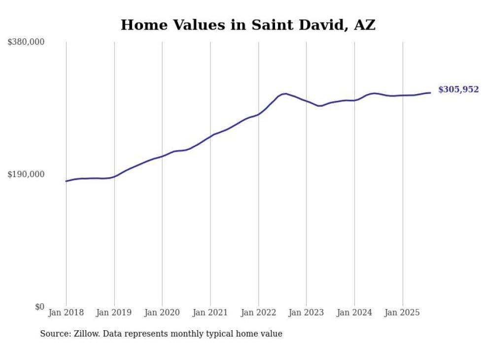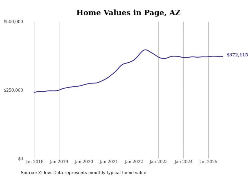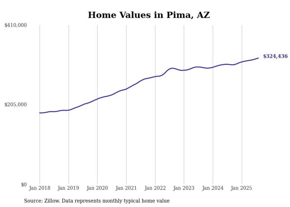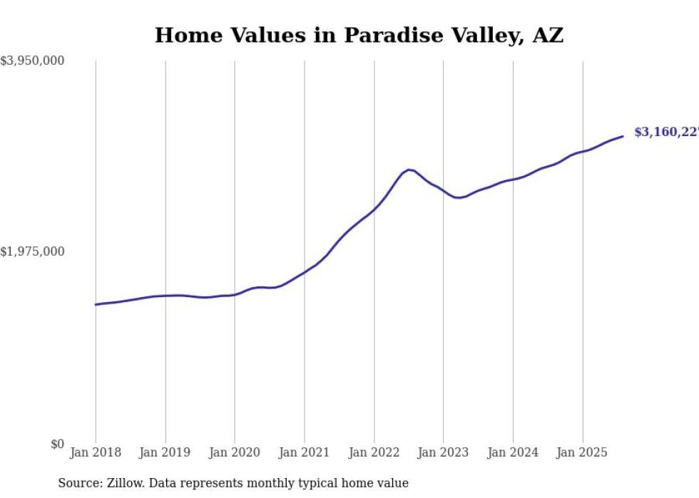 Stacker compiled a list of cities with the fastest-growing home prices in Arizona using data from Zillow. Cities are ranked by the dollar change in the Zillow Home Values Index for all homes from the 12 months ending August 2025. The charts in this story were created automatically using Matplotlib. Data was available for 50 cities and towns in Arizona.