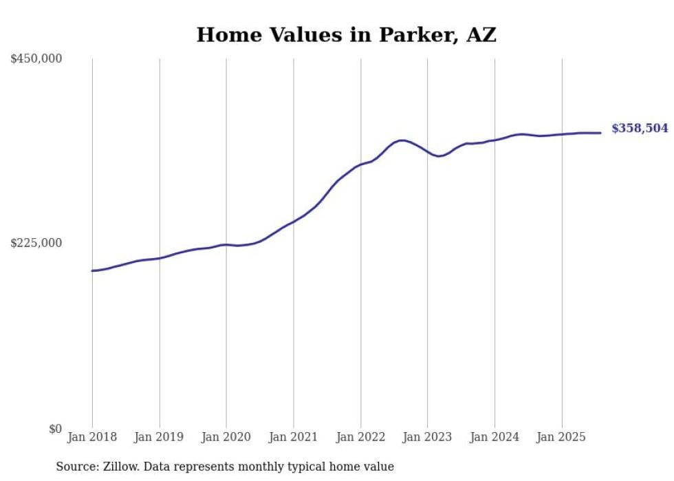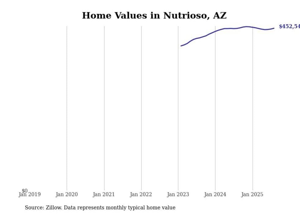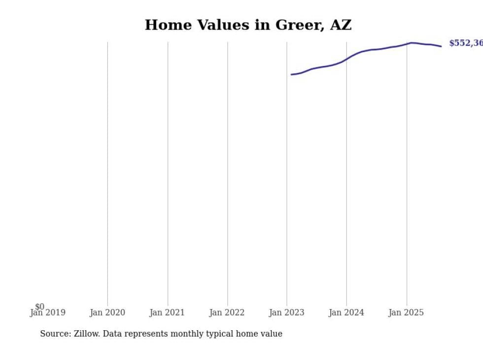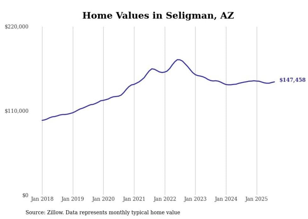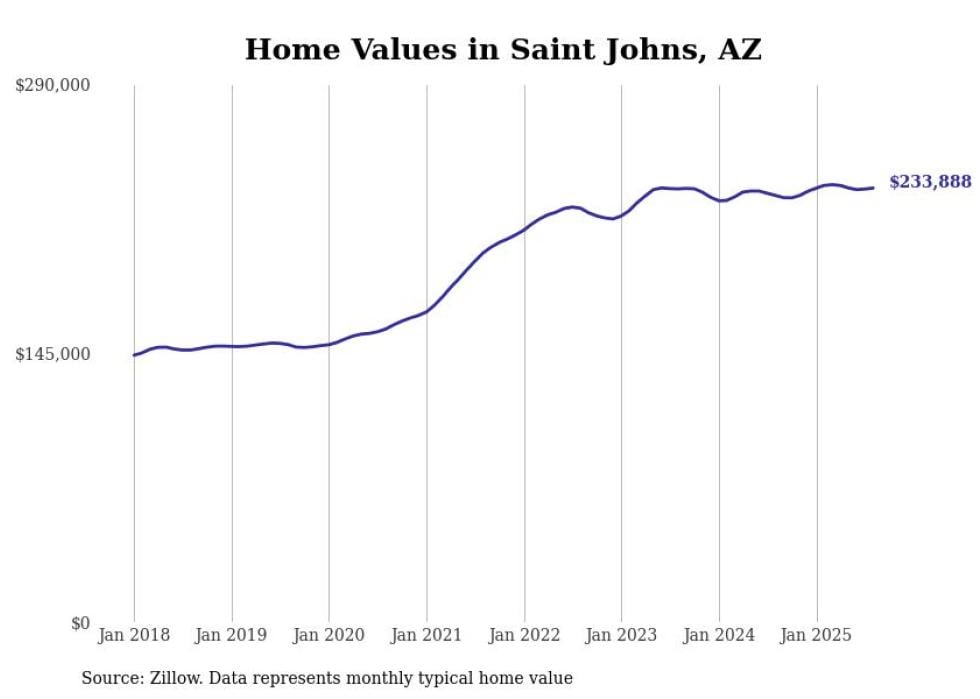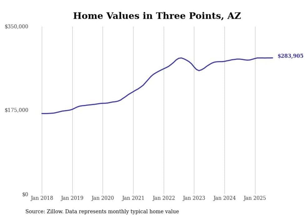 Stacker compiled a list of cities with the fastest-growing home prices in Arizona using data from Zillow. Cities are ranked by the dollar change in the Zillow Home Values Index for all homes from the 12 months ending August 2025. The charts in this story were created automatically using Matplotlib. Data was available for 50 cities and towns in Arizona.
