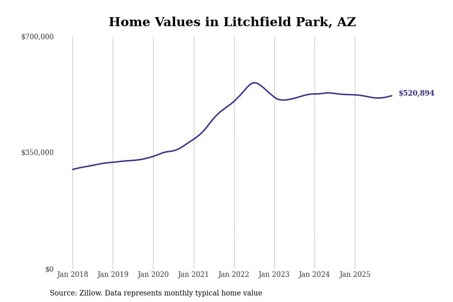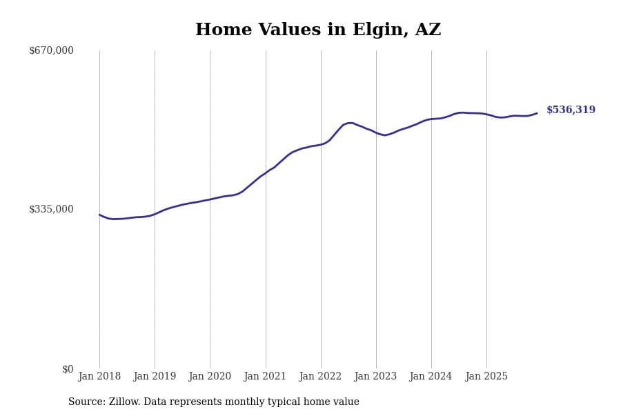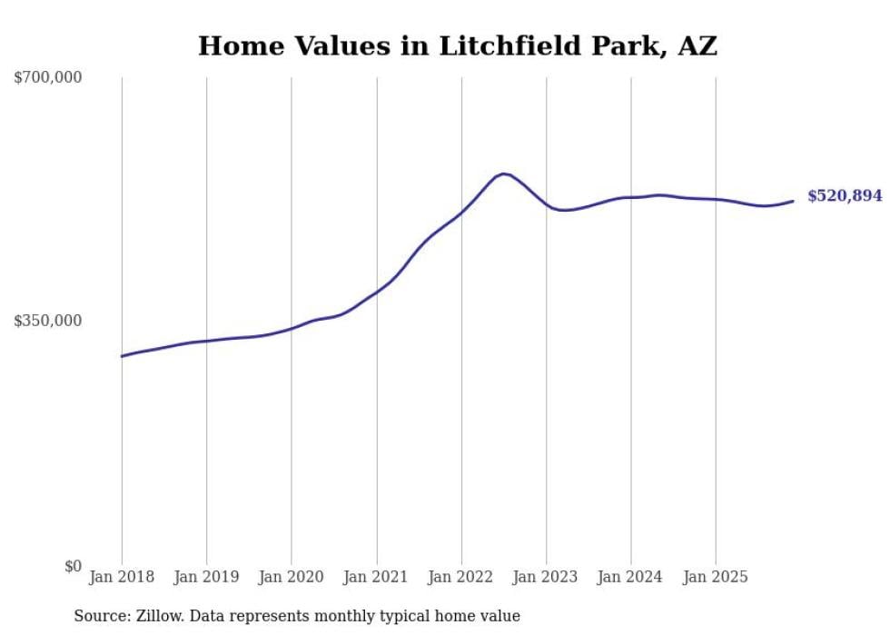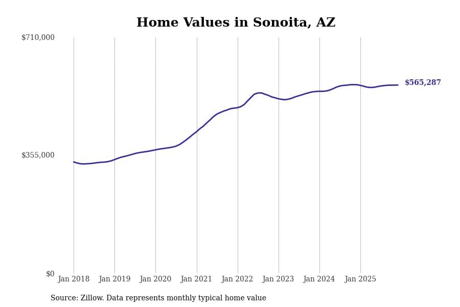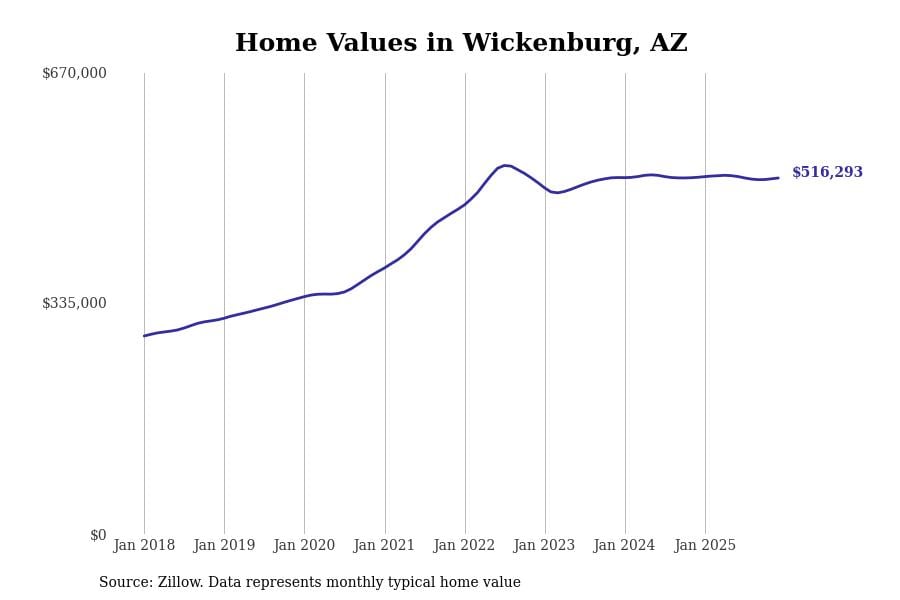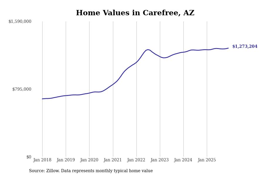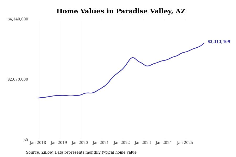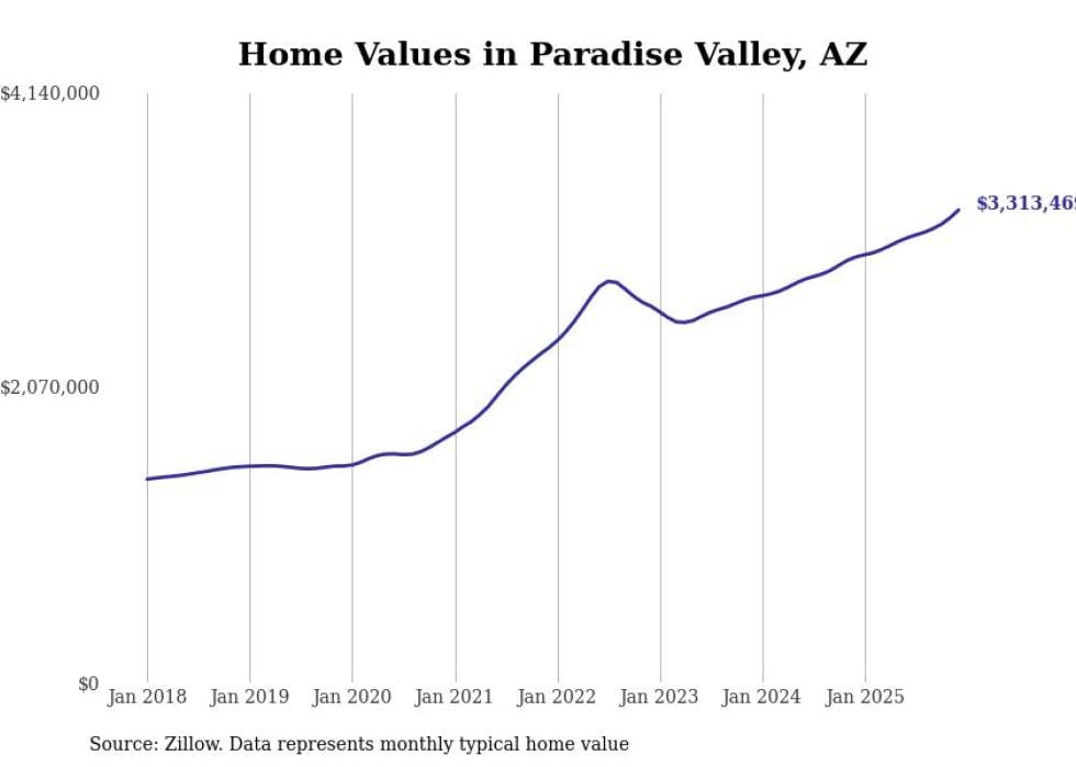 Stacker compiled a list of cities with the most expensive homes in Arizona using data from Zillow. Cities are ranked by the Zillow Home Values Index for all homes as of December 2025. The charts in this story were created automatically using Matplotlib.