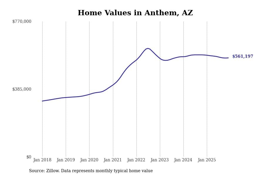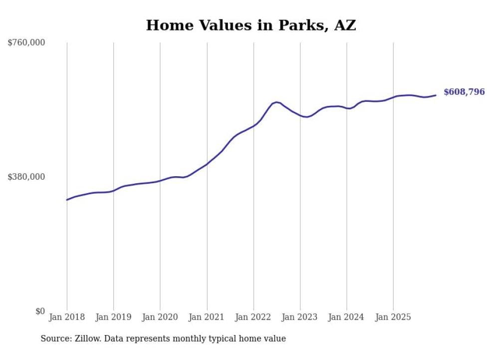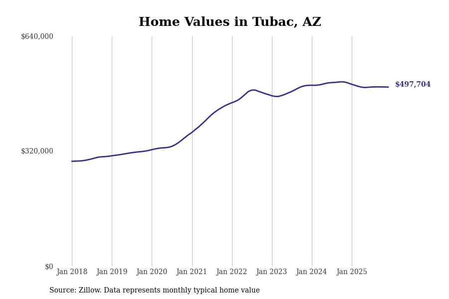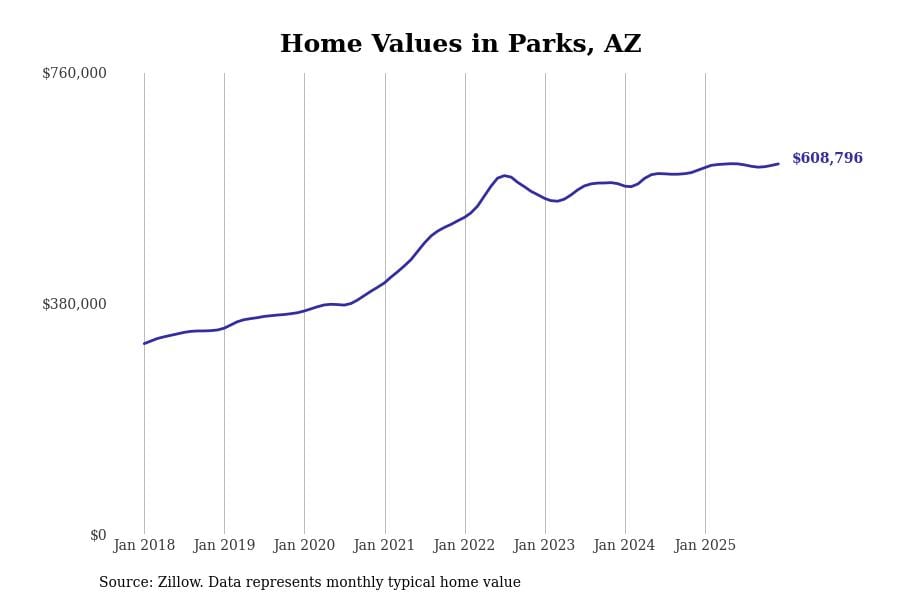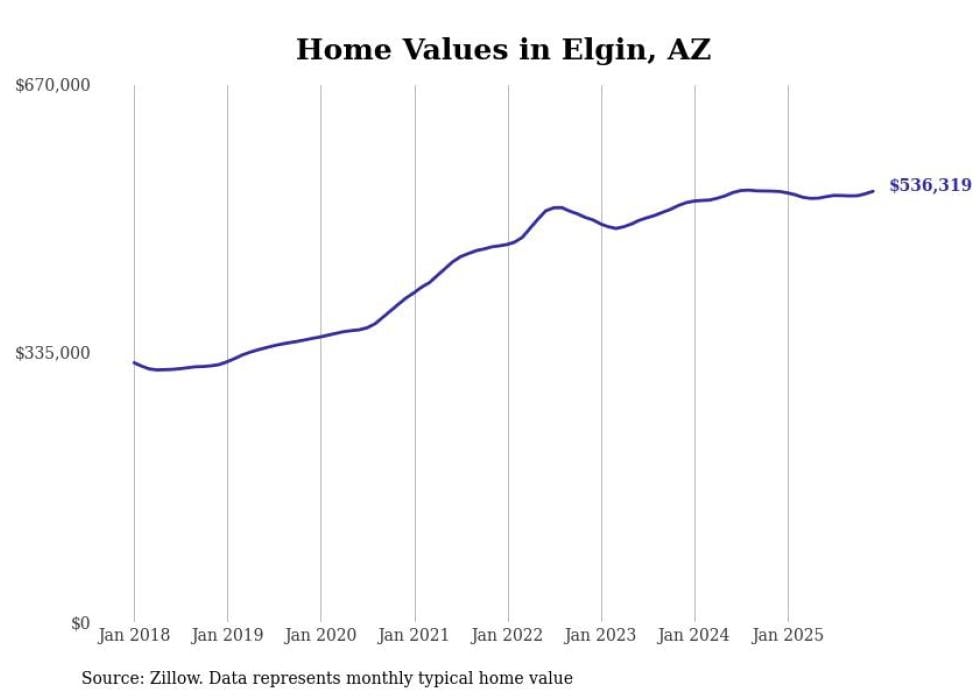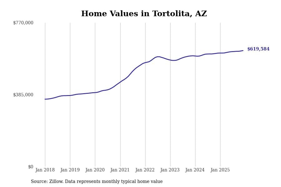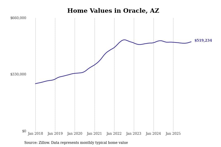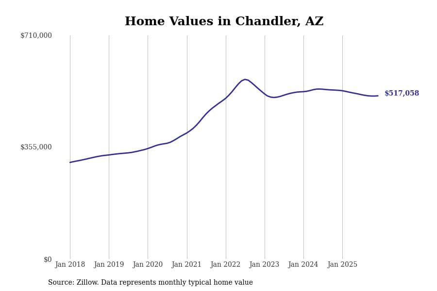 Stacker compiled a list of cities with the most expensive homes in Arizona using data from Zillow. Cities are ranked by the Zillow Home Values Index for all homes as of December 2025. The charts in this story were created automatically using Matplotlib.
