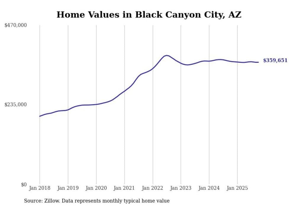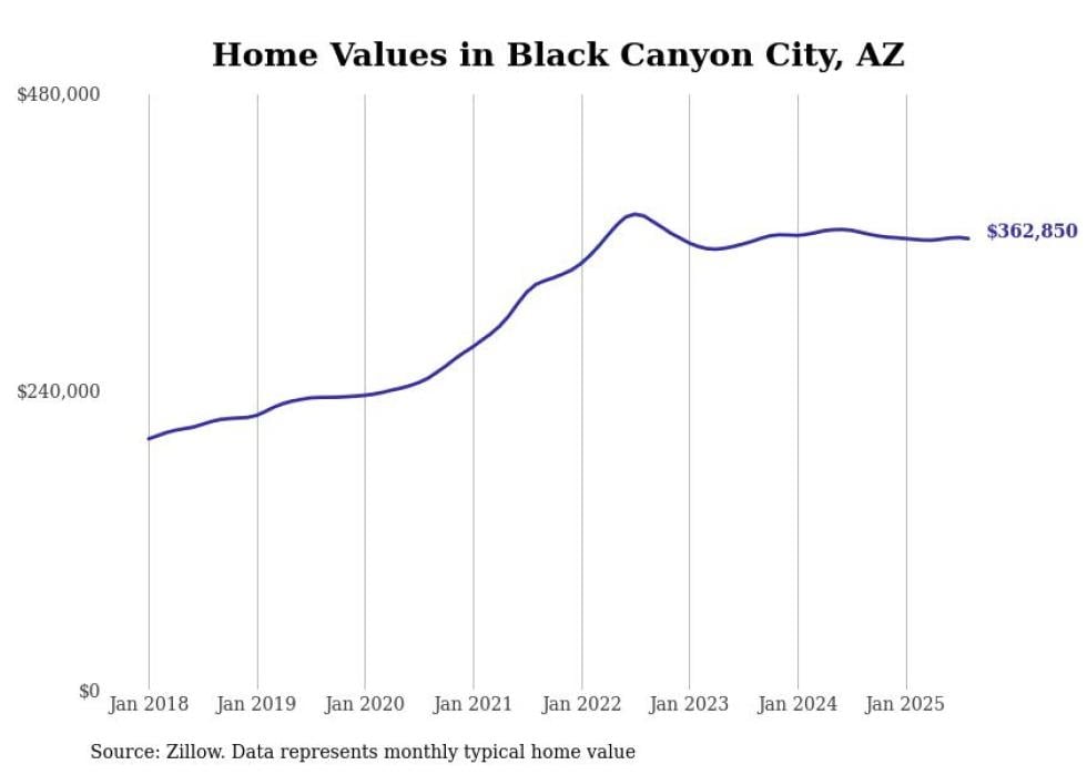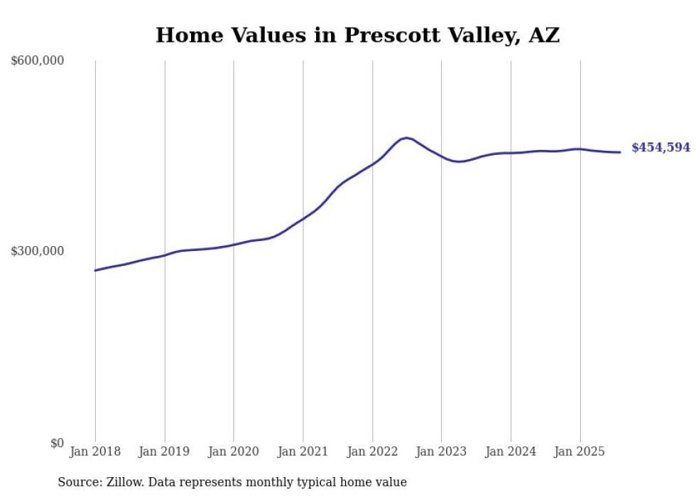 Stacker compiled a list of cities with the most expensive homes in the Prescott Valley-Prescott, AZ metro area using data from Zillow. Charts show the monthly typical home value since January 2018.