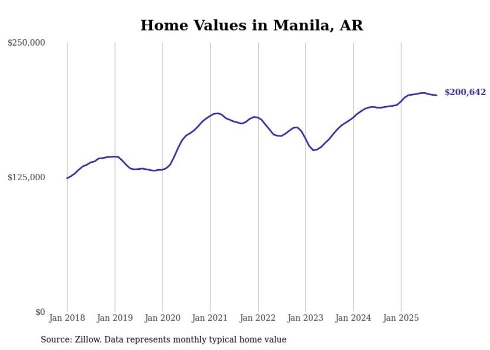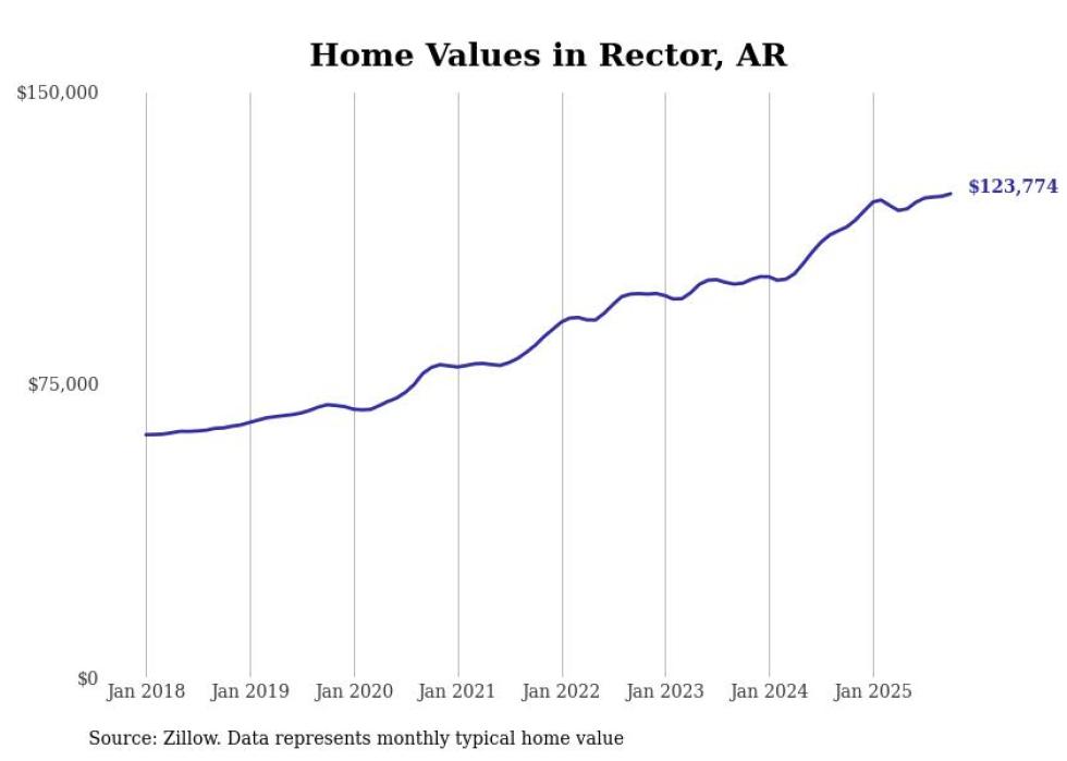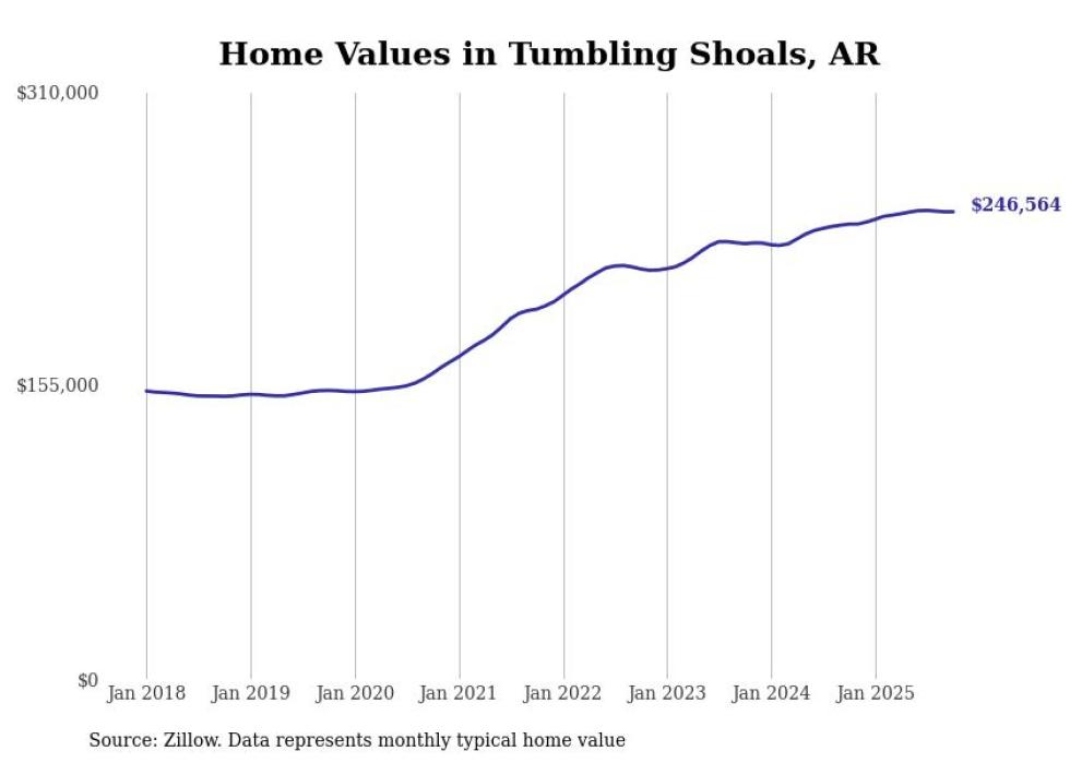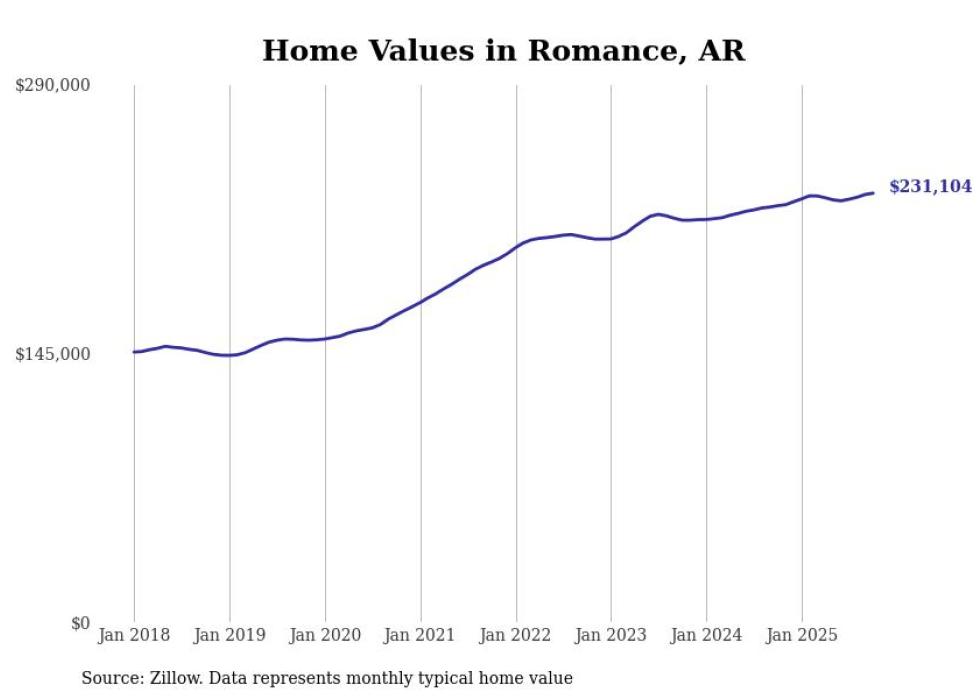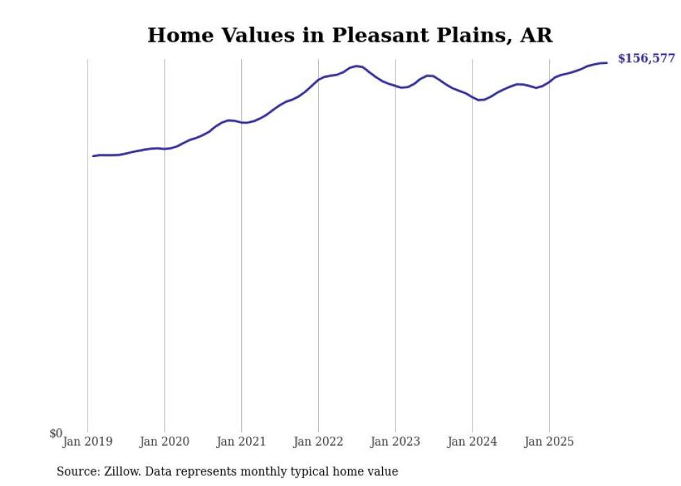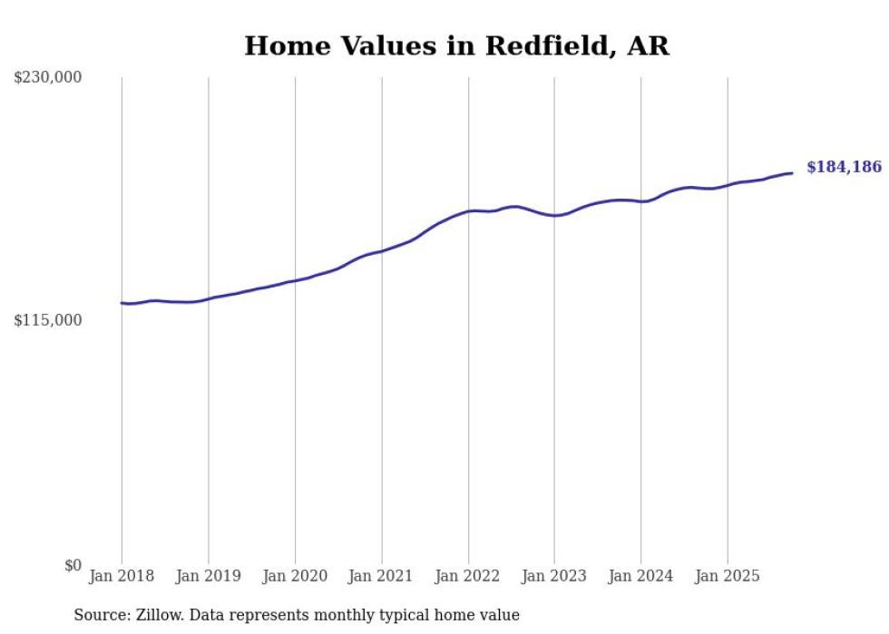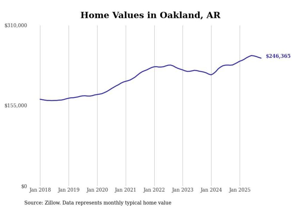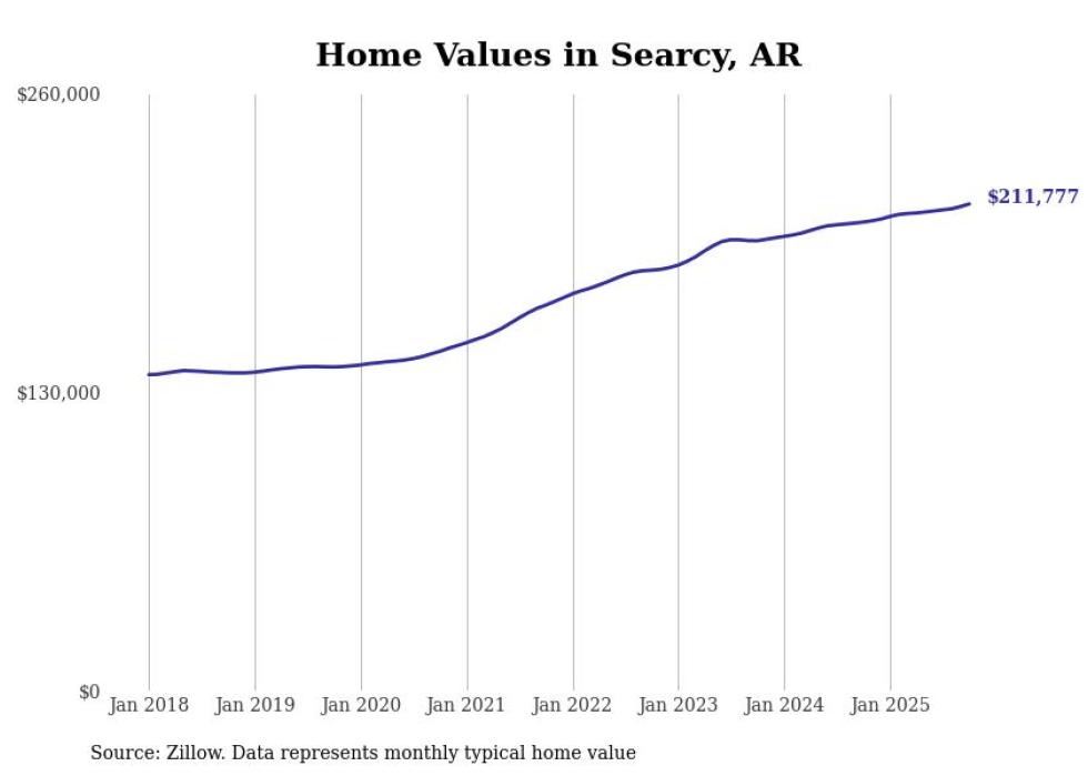Stacker compiled a list of cities with the fastest-growing home prices in Arkansas using data from Zillow. Cities are ranked by the dollar change in the Zillow Home Values Index for all homes from the 12 months ending October 2025. The charts in this story were created automatically using Matplotlib. Data was available for 50 cities and towns in Arkansas.