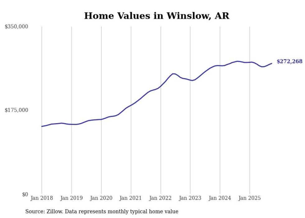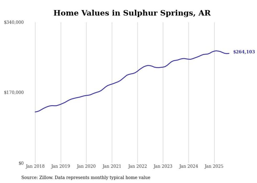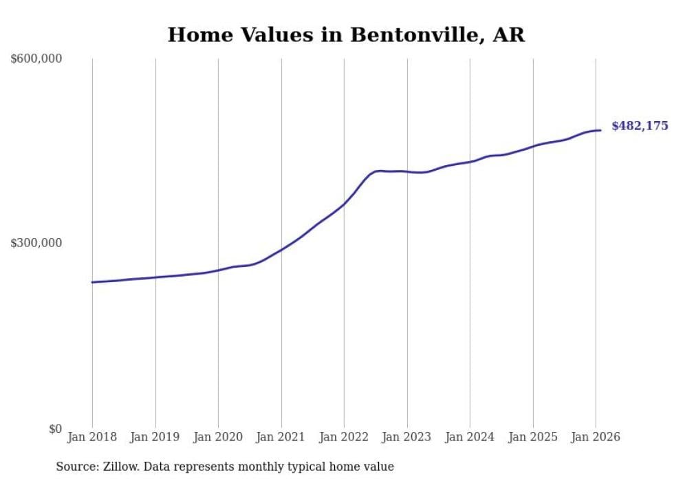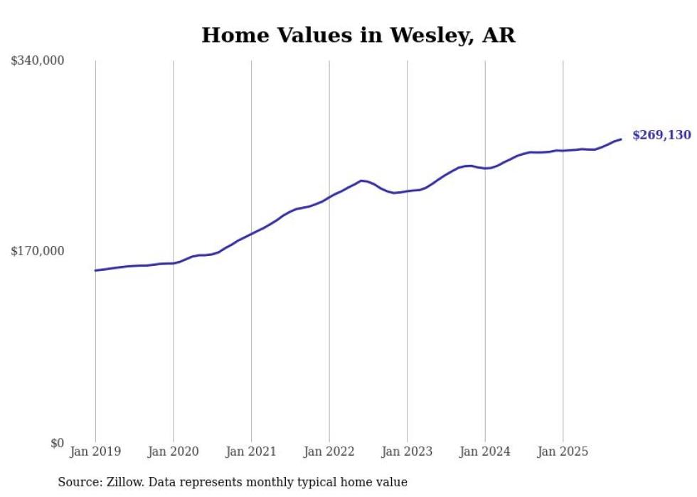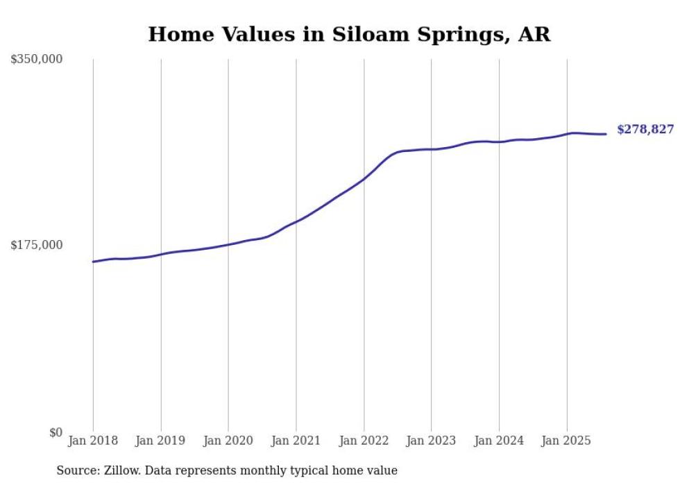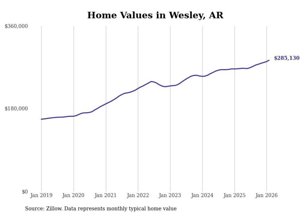 Stacker compiled a list of cities with the most expensive homes in the Fayetteville metro area using data from Zillow. Charts show the monthly typical home value since January 2018. All 29 cities and towns with data available were included in the list.