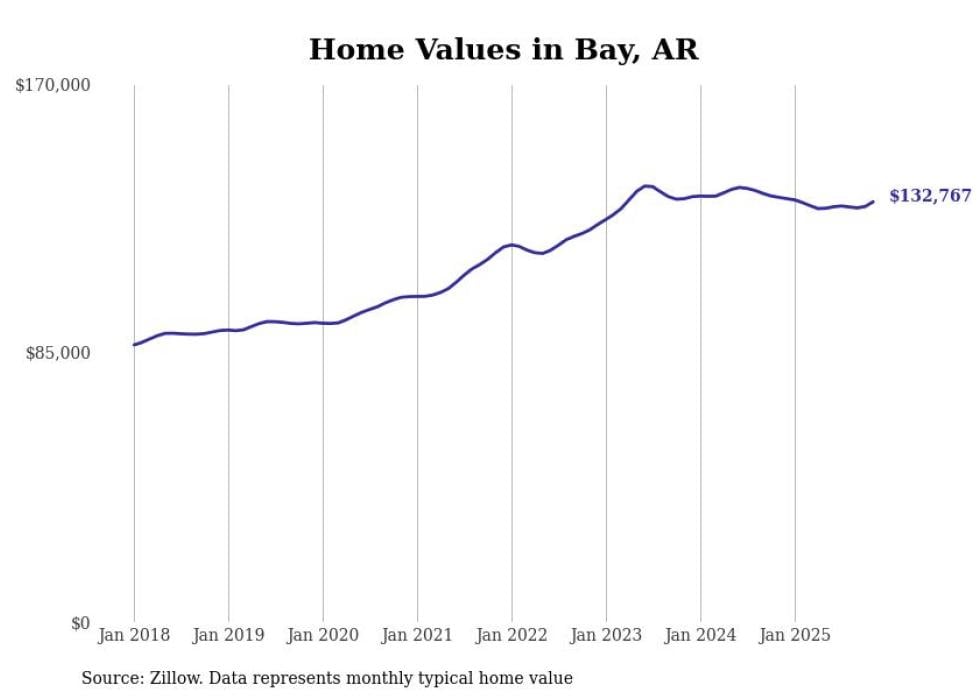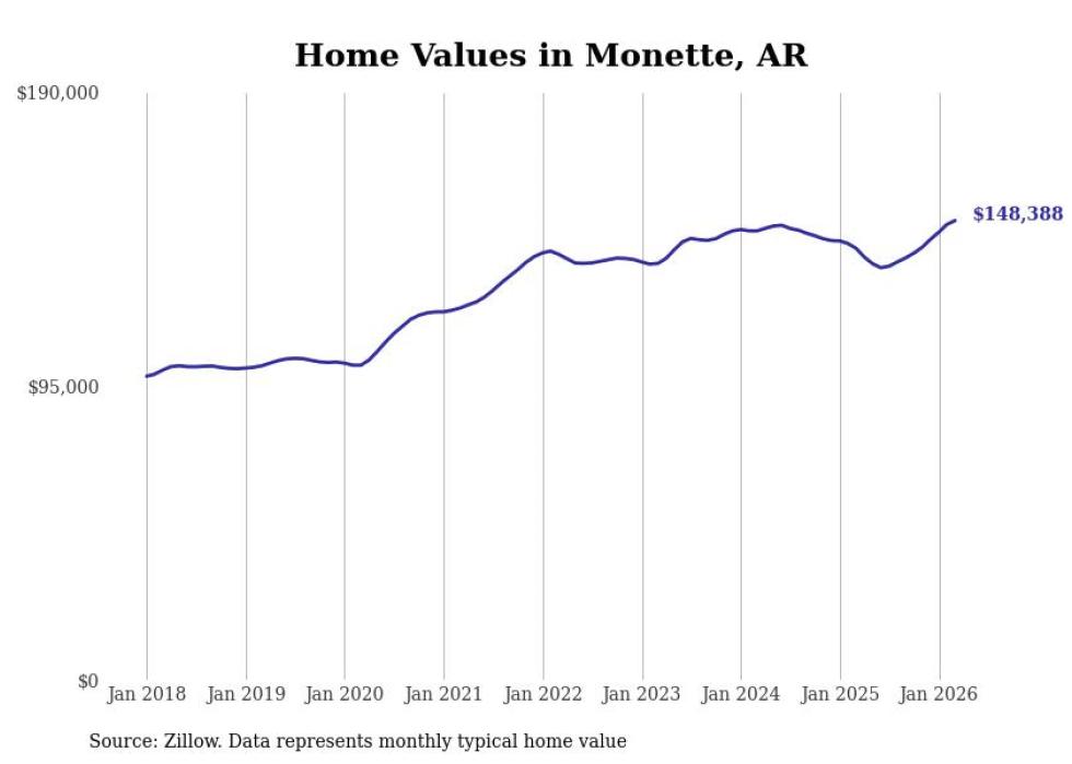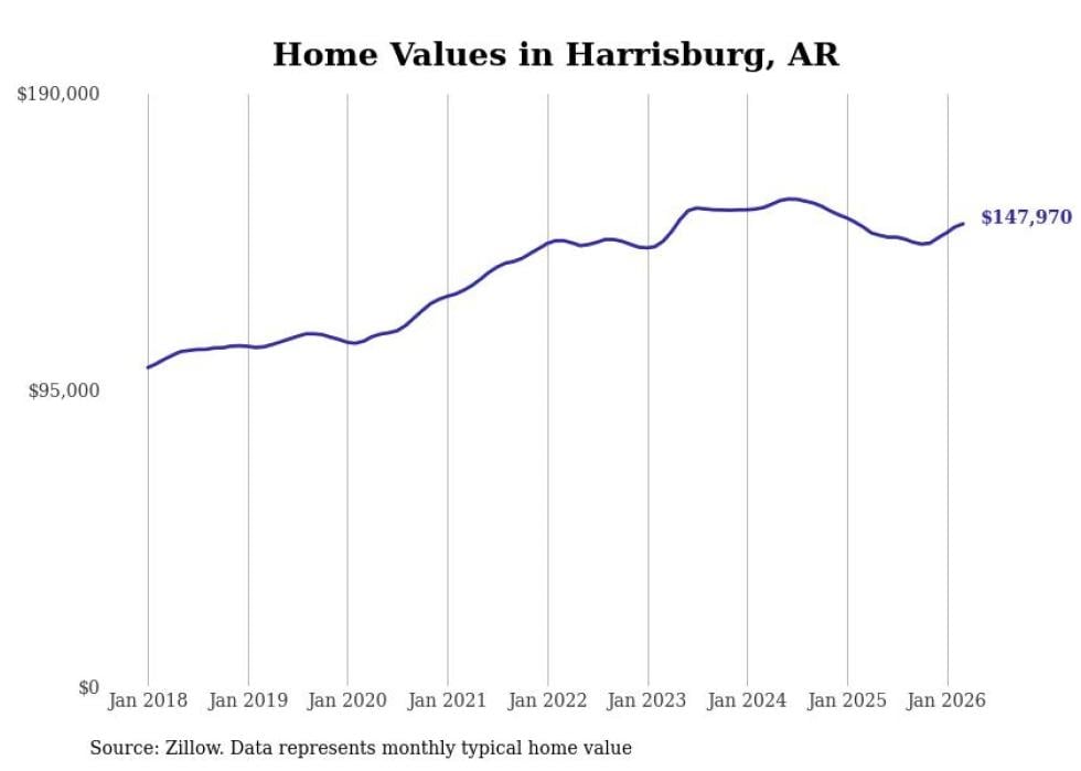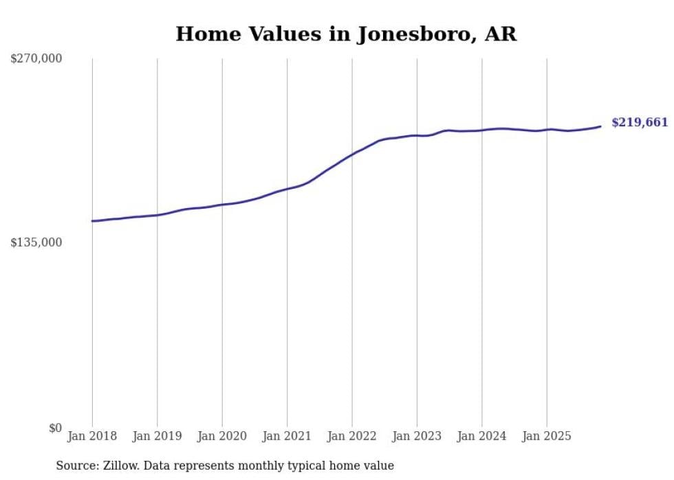 Stacker compiled a list of cities with the most expensive homes in the Jonesboro metro area using data from Zillow. Charts show the monthly typical home value since January 2018. All 9 cities and towns with data available were included in the list.