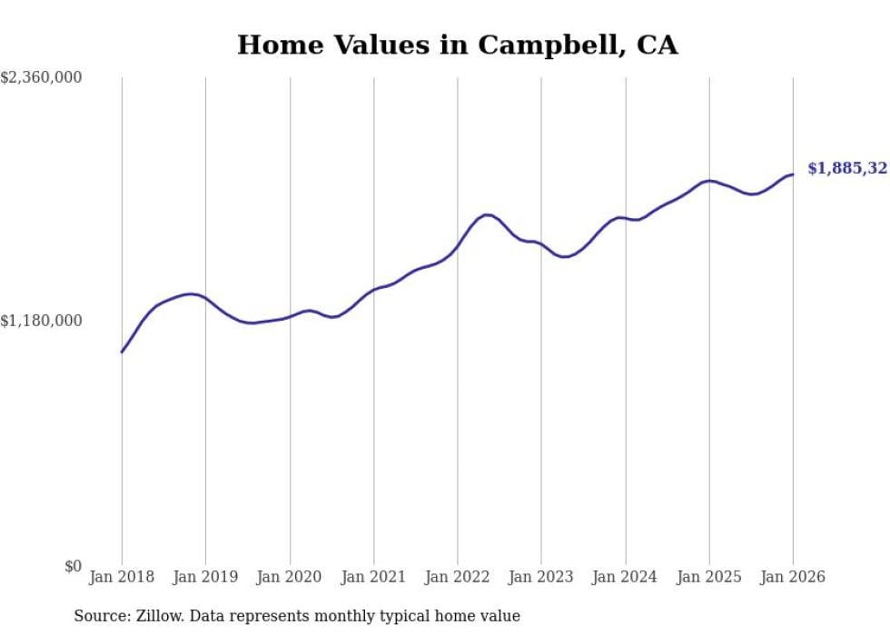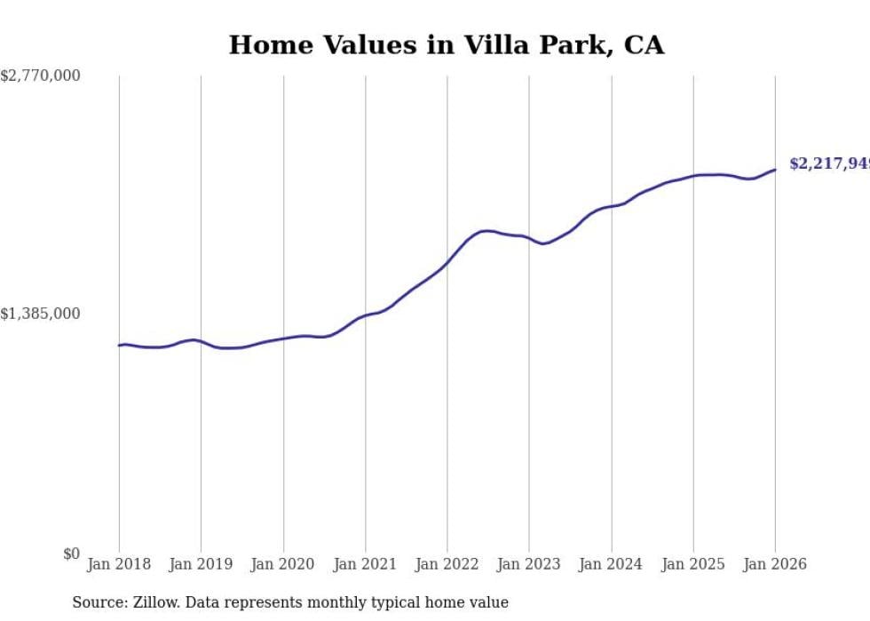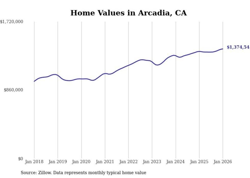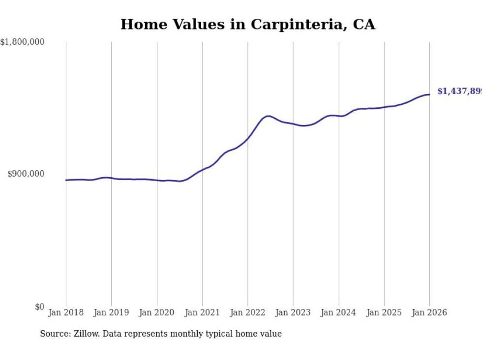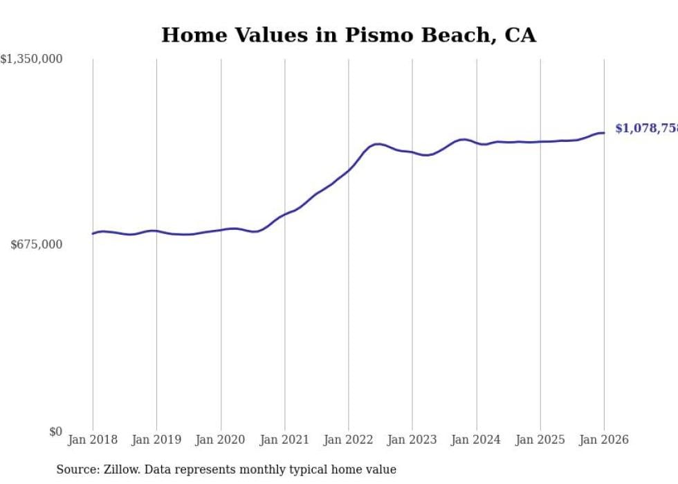 Stacker compiled a list of cities with the fastest-growing home prices in California using data from Zillow. Cities are ranked by the dollar change in the Zillow Home Values Index for all homes from the 12 months ending January 2026. The charts in this story were created automatically using Matplotlib. Data was available for 50 cities and towns in California.