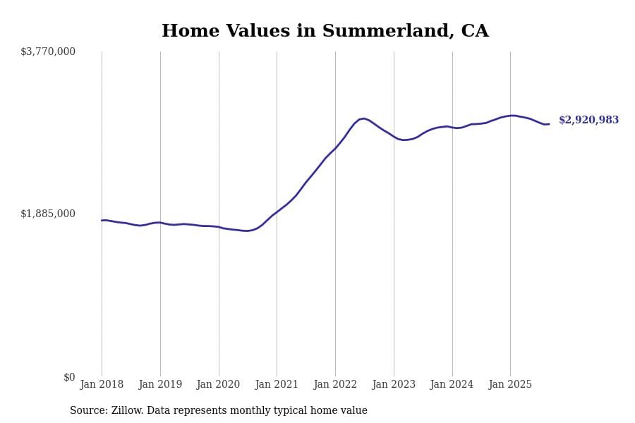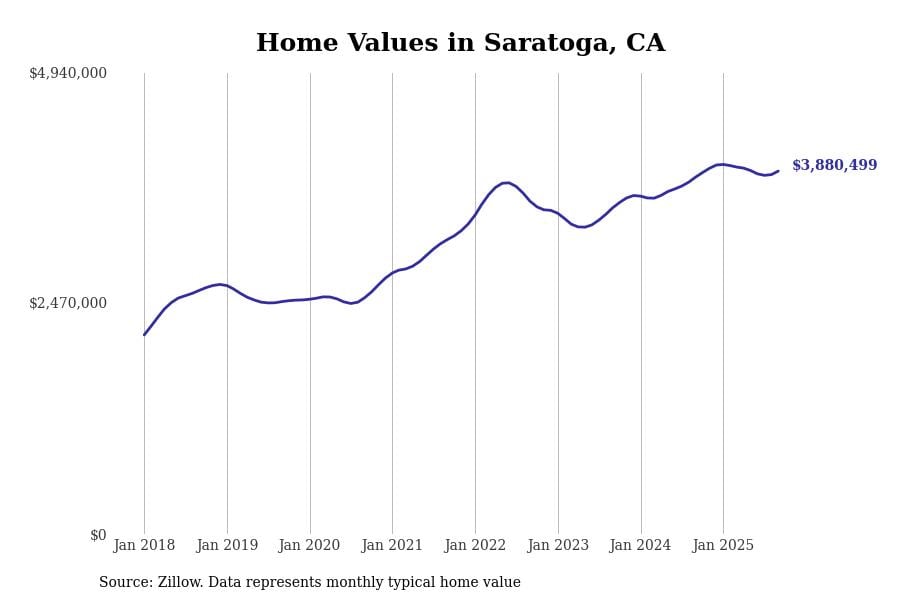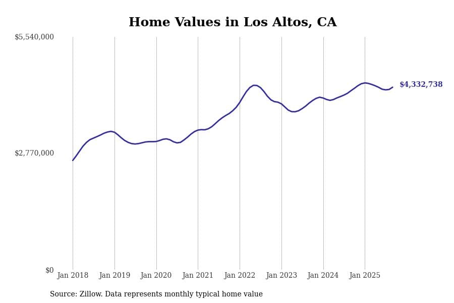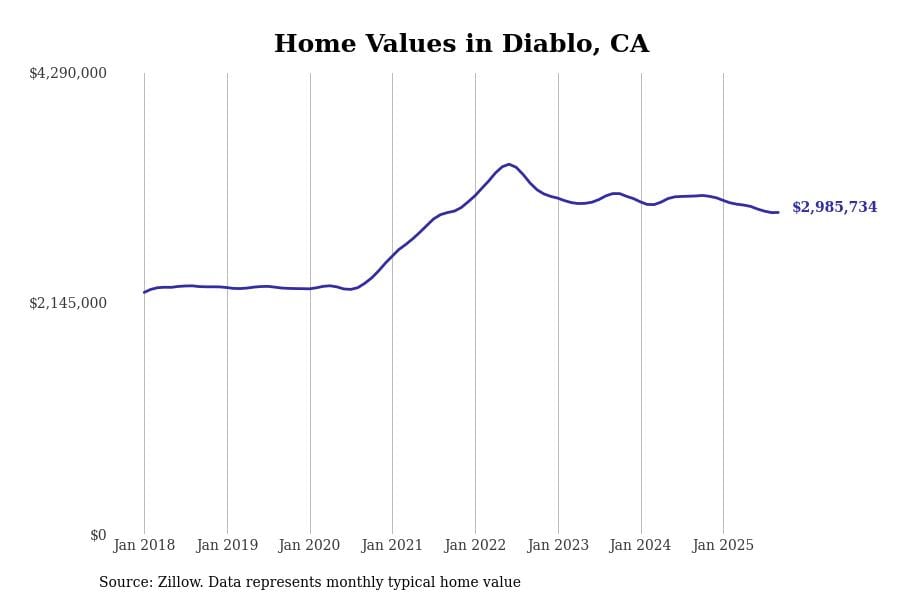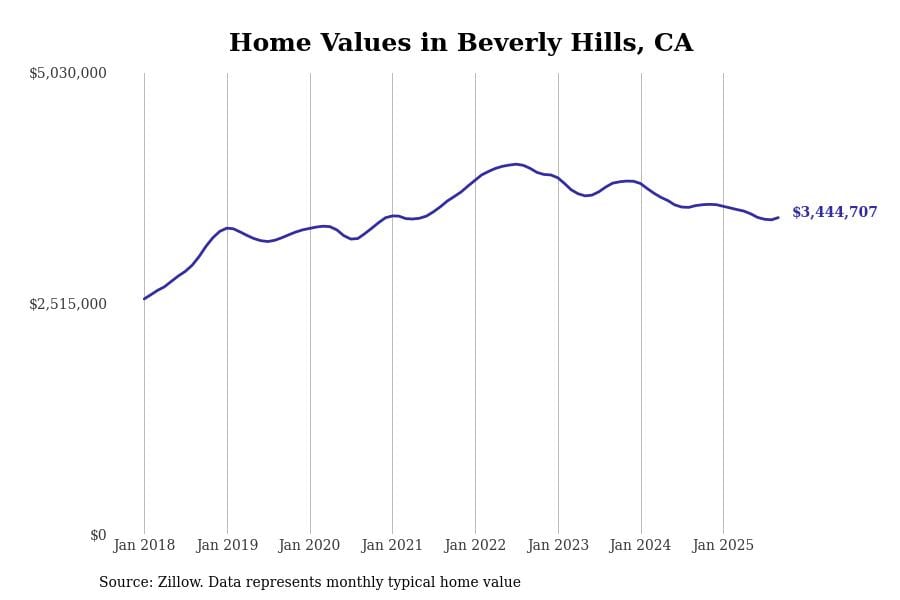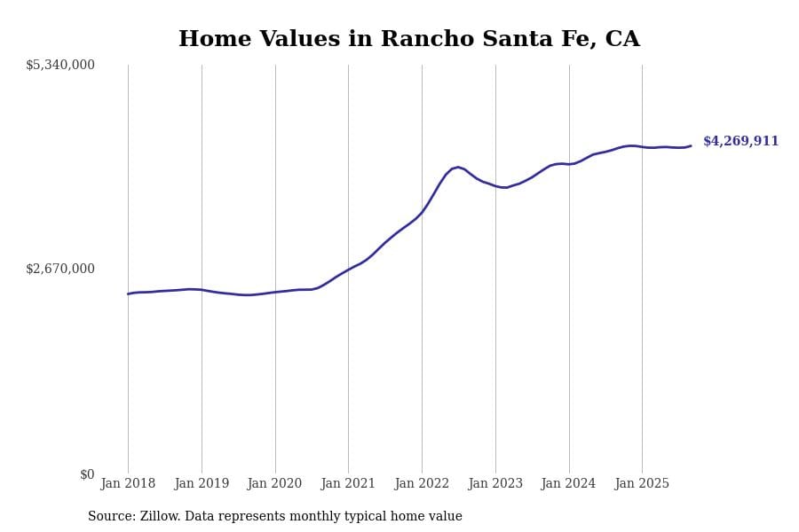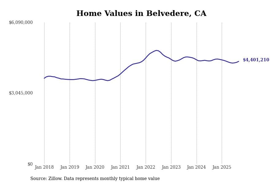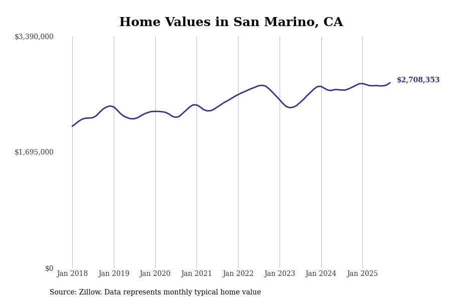 Stacker compiled a list of cities with the most expensive homes in California using data from Zillow. Cities are ranked by the Zillow Home Values Index for all homes as of September 2025. The charts in this story were created automatically using Matplotlib.