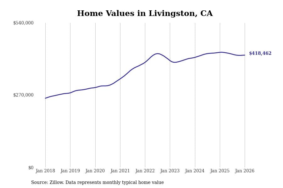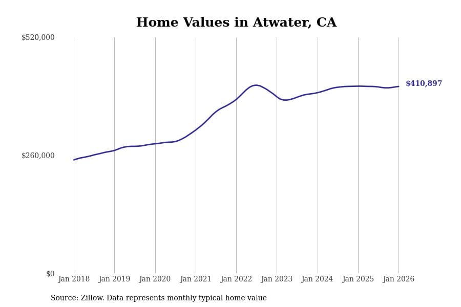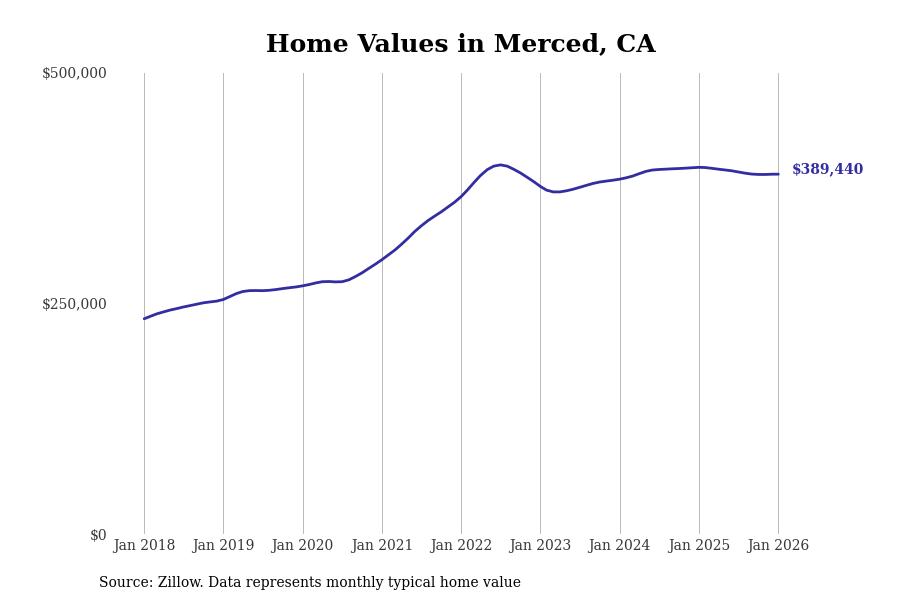 Stacker compiled a list of cities with the most expensive homes in the Merced metro area using data from Zillow. Charts show the monthly typical home value since January 2018. All 14 cities and towns with data available were included in the list.