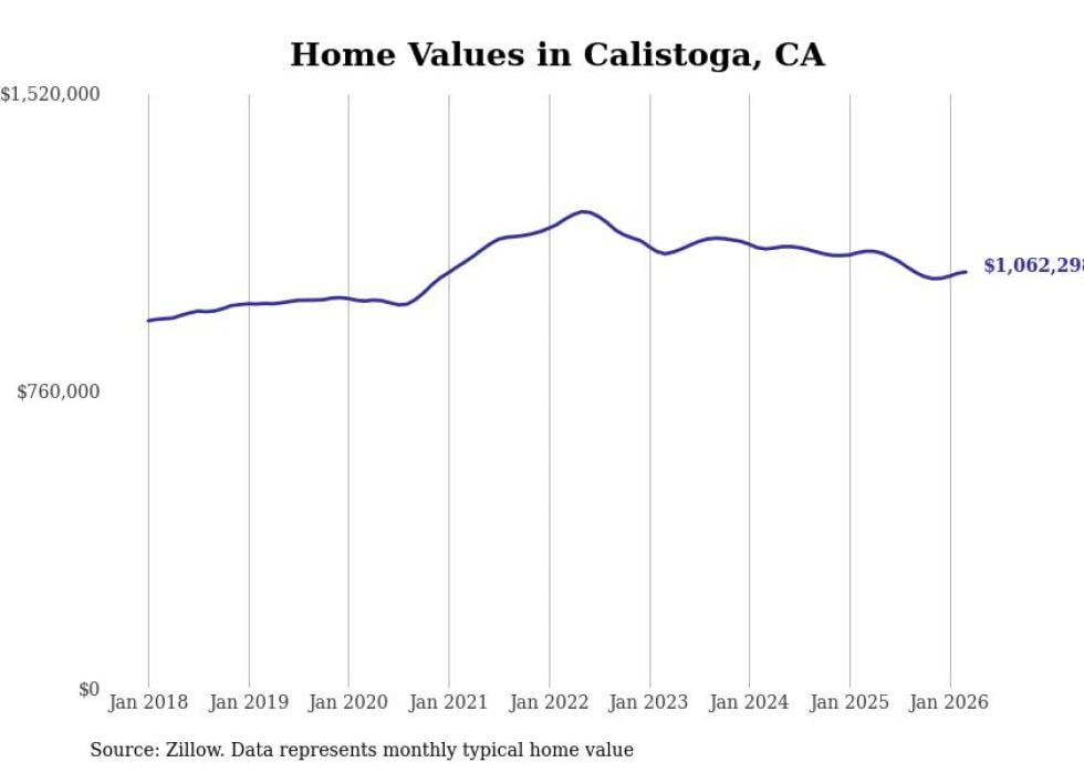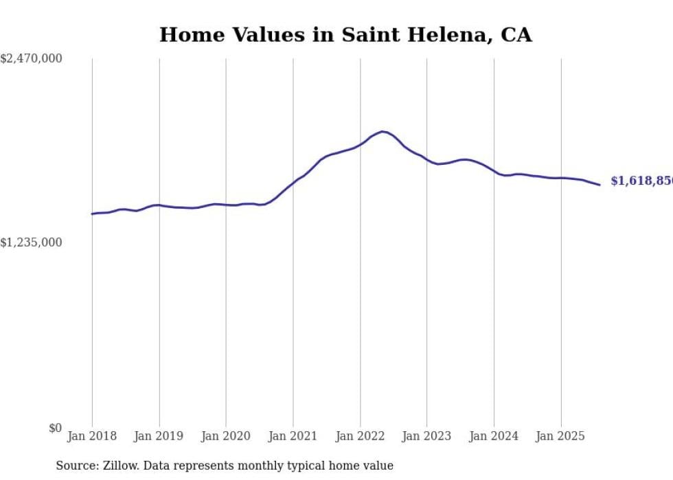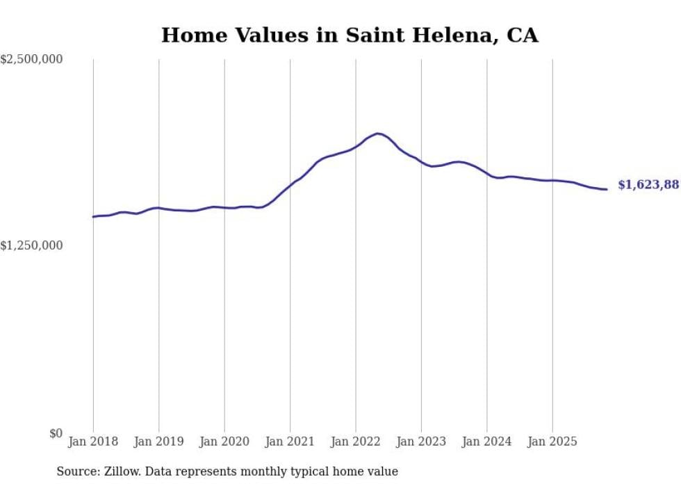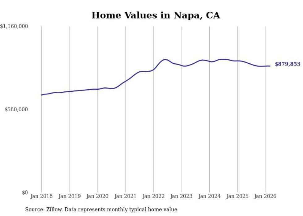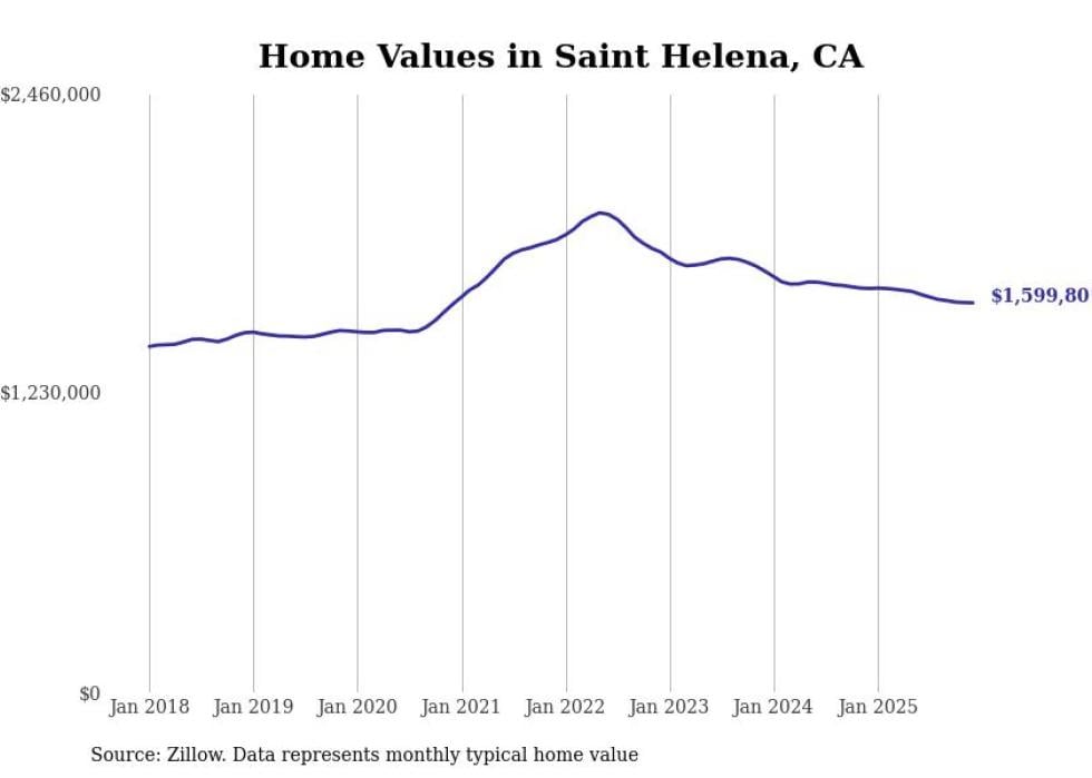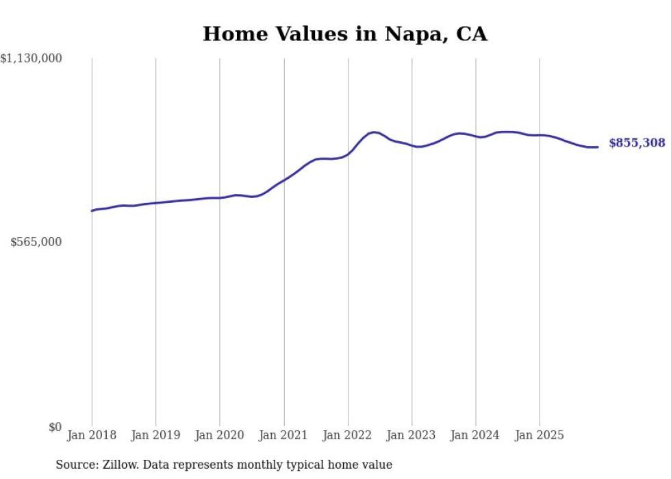 Stacker compiled a list of cities with the most expensive homes in the Napa metro area using data from Zillow. Charts show the monthly typical home value since January 2018. All 7 cities and towns with data available were included in the list.