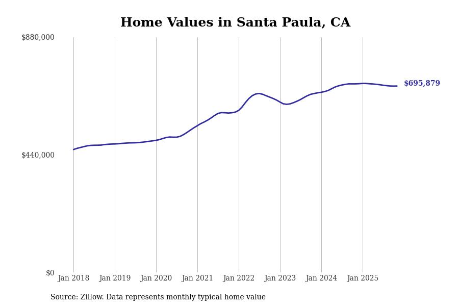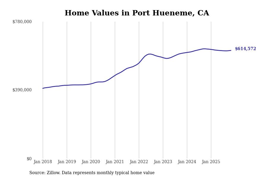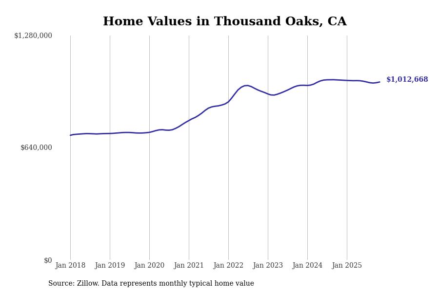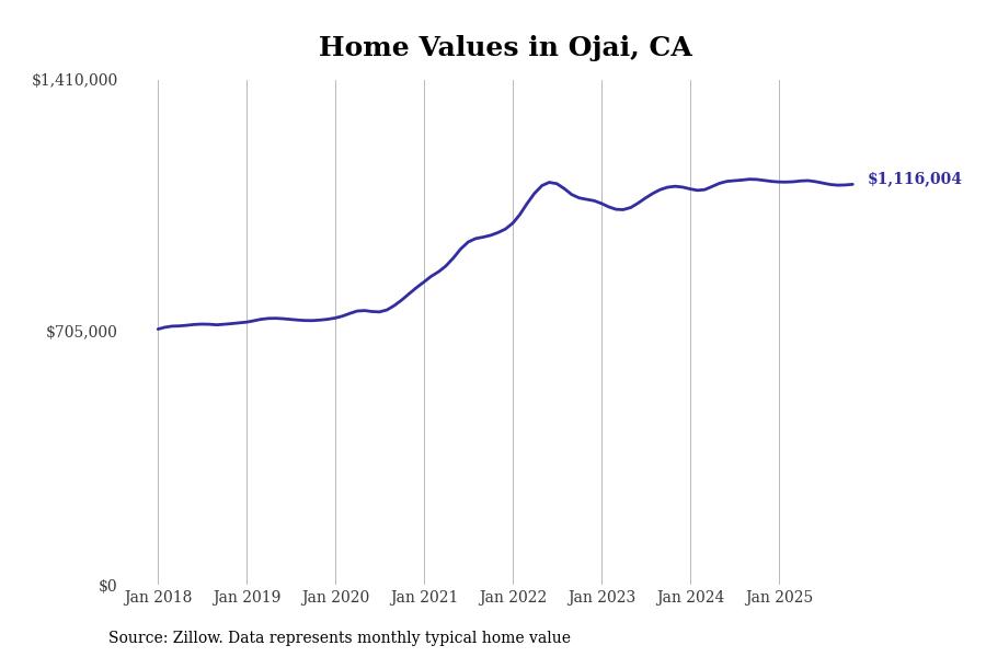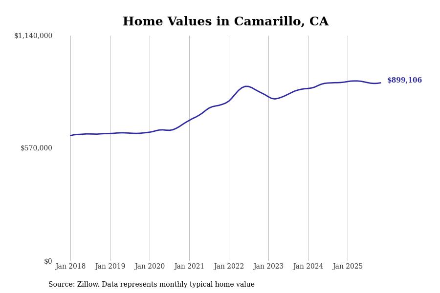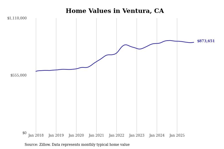 Stacker compiled a list of cities with the most expensive homes in the Oxnard-Thousand Oaks-Ventura, CA metro area using data from Zillow. Charts show the monthly typical home value since January 2018.