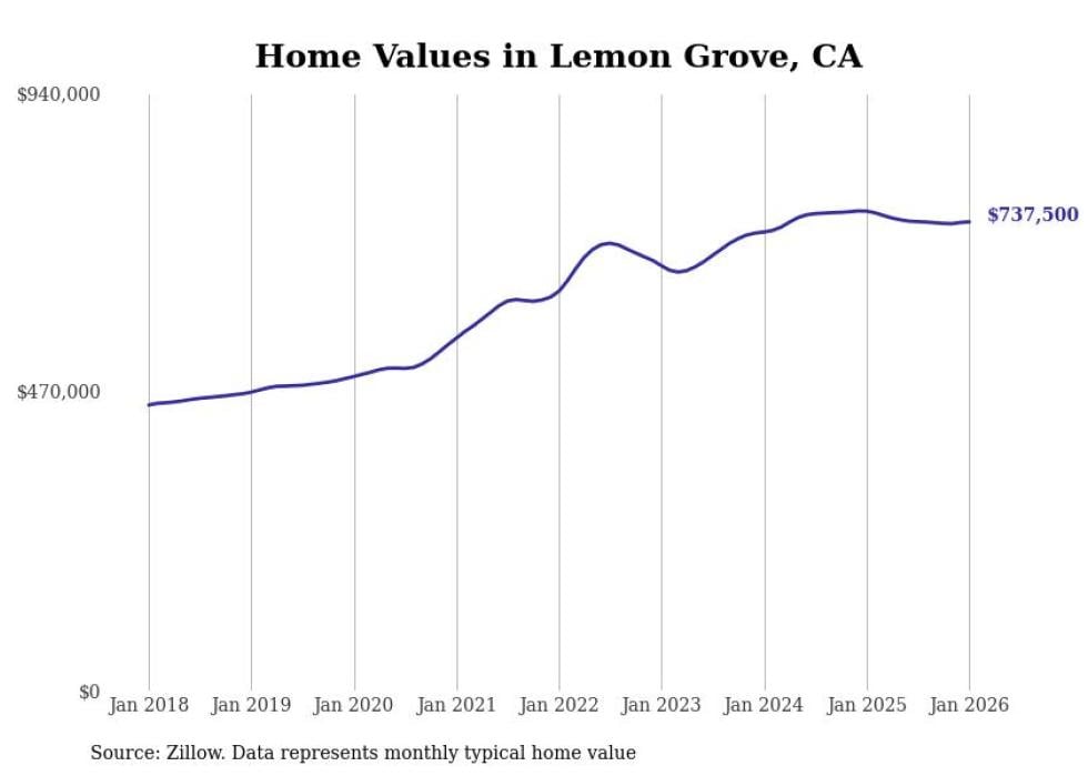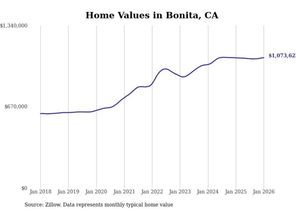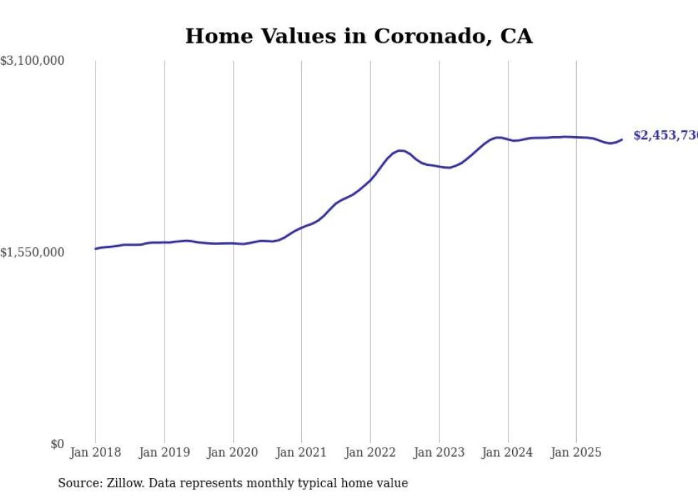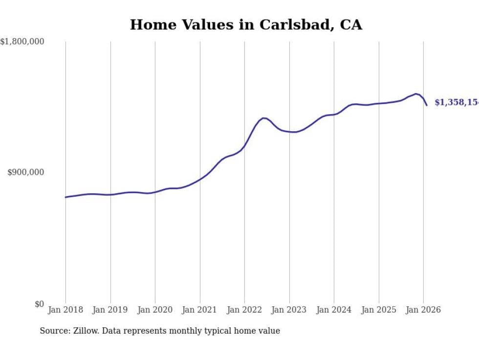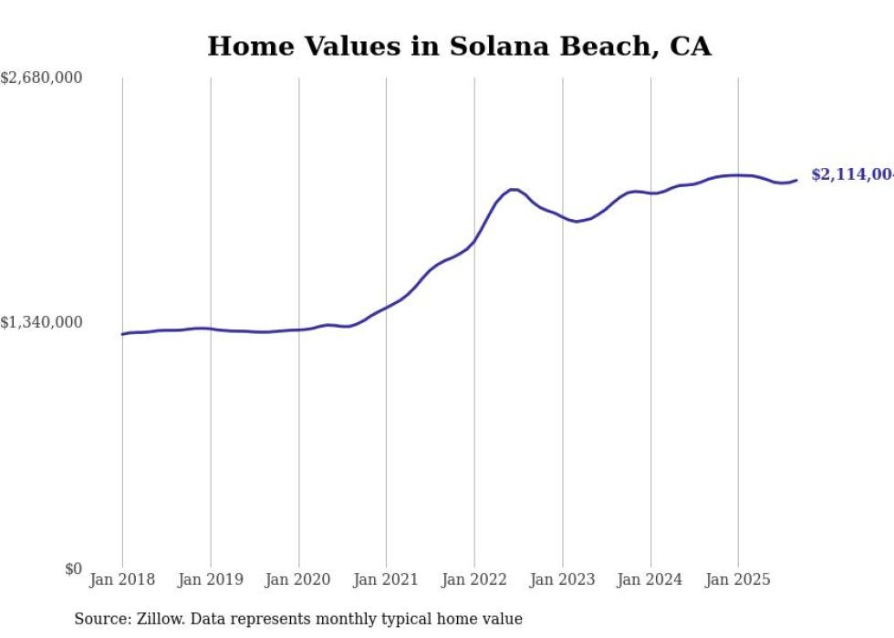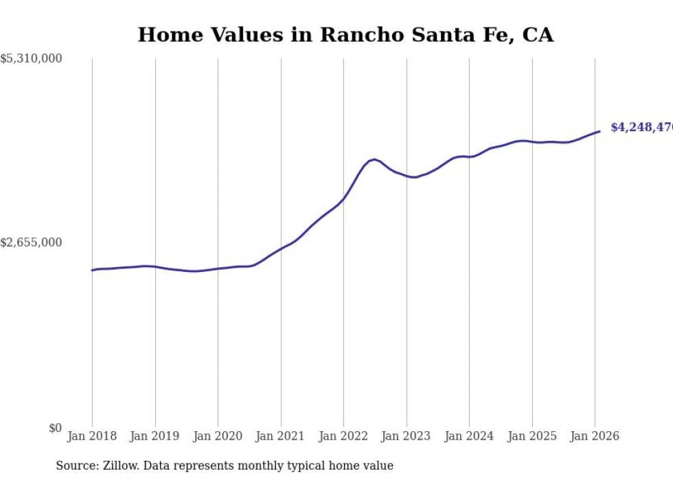 Stacker compiled a list of cities with the most expensive homes in the San Diego-Chula Vista-Carlsbad, CA metro area using data from Zillow. Charts show the monthly typical home value since January 2018.