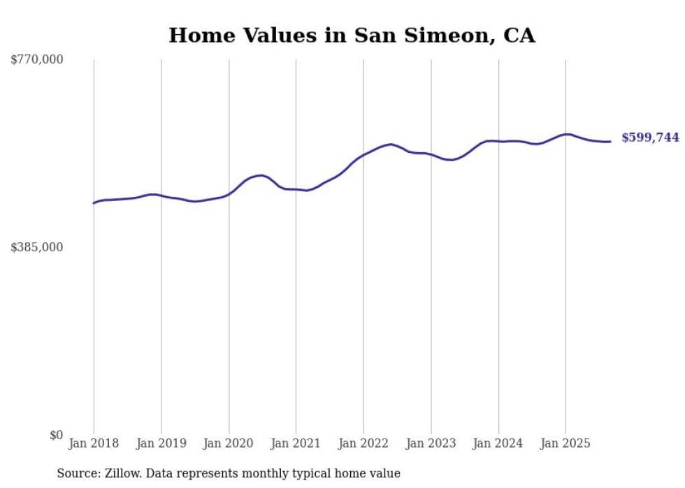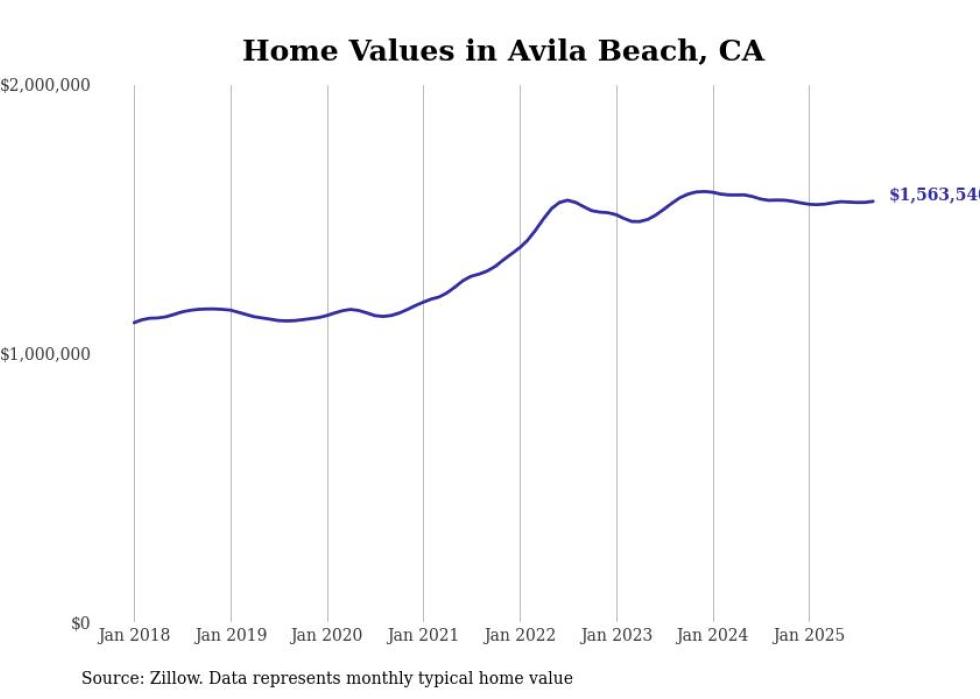 Stacker compiled a list of cities with the most expensive homes in the San Luis Obispo metro area using data from Zillow. Charts show the monthly typical home value since January 2018. All 17 cities and towns with data available were included in the list.
