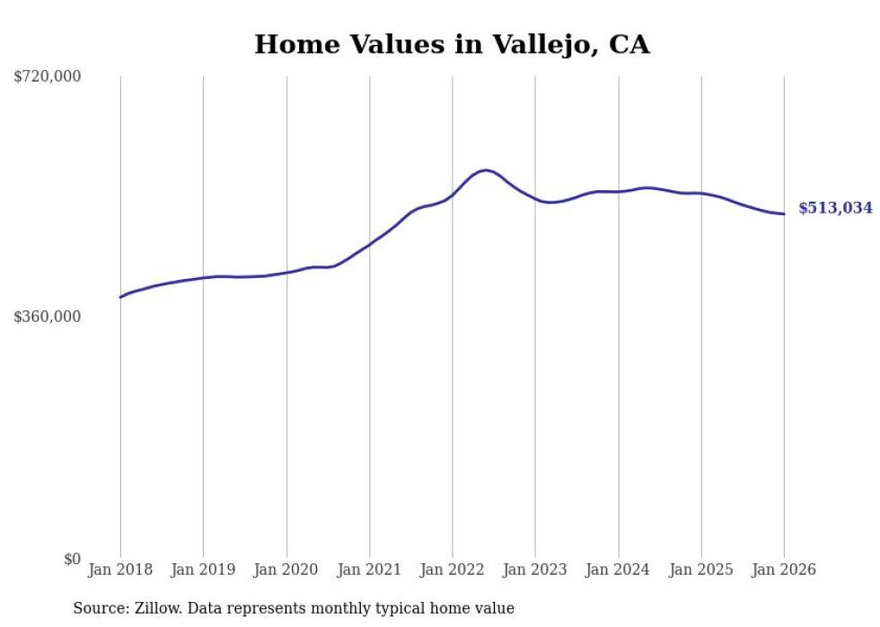 Stacker compiled a list of cities with the most expensive homes in the Vallejo, CA metro area using data from Zillow. Charts show the monthly typical home value since January 2018.