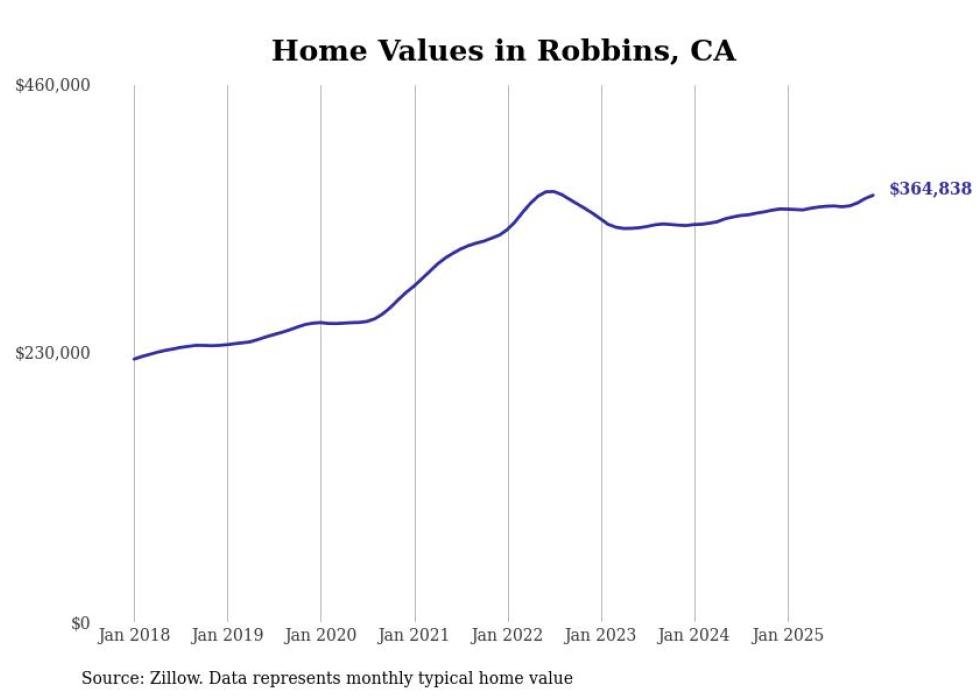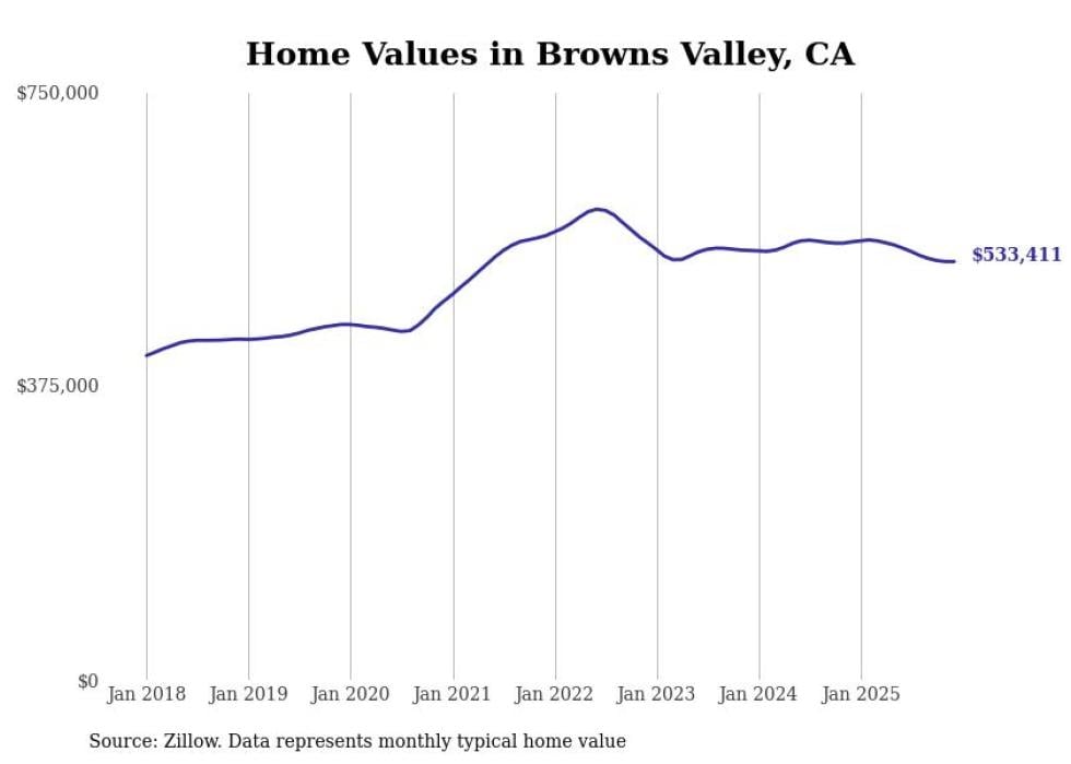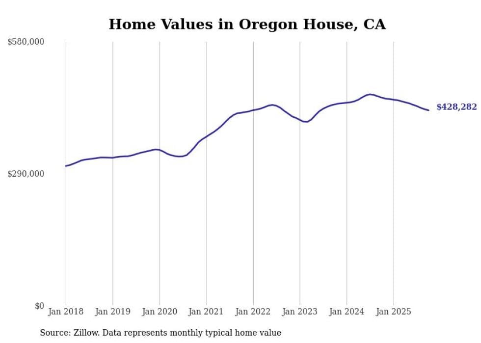 Stacker compiled a list of cities with the most expensive homes in the Yuba City metro area using data from Zillow. Charts show the monthly typical home value since January 2018. All 21 cities and towns with data available were included in the list.