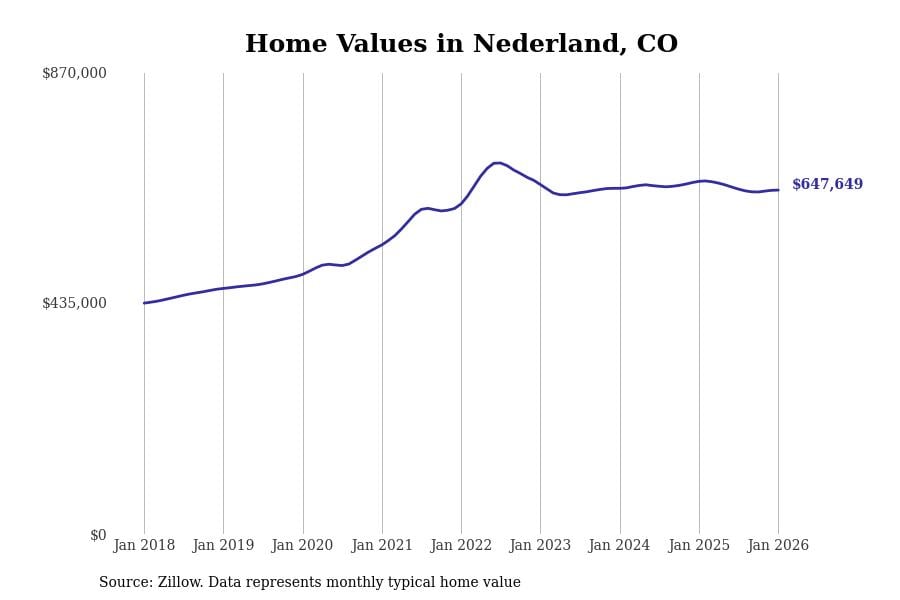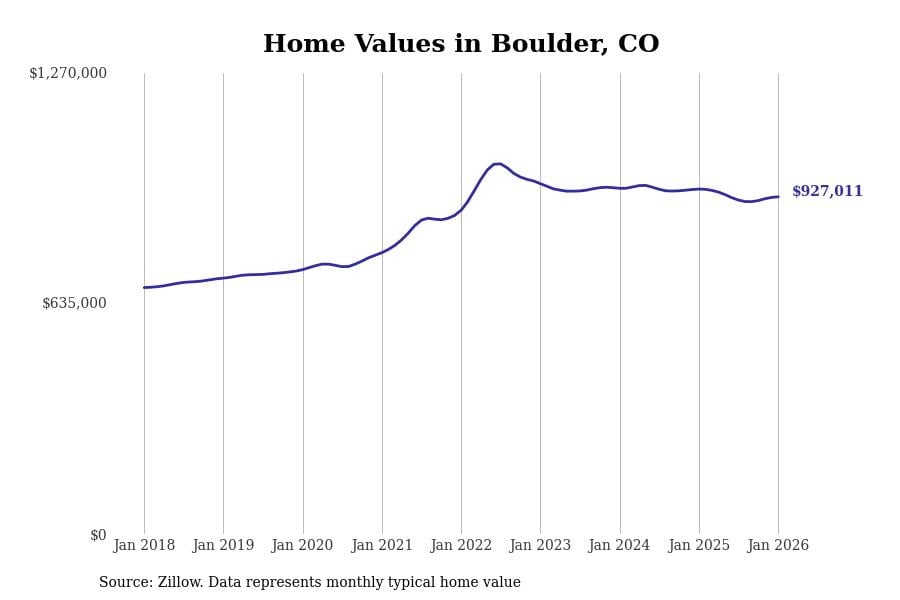Stacker compiled a list of cities with the most expensive homes in the Boulder metro area using data from Zillow. Charts show the monthly typical home value since January 2018. All 12 cities and towns with data available were included in the list.