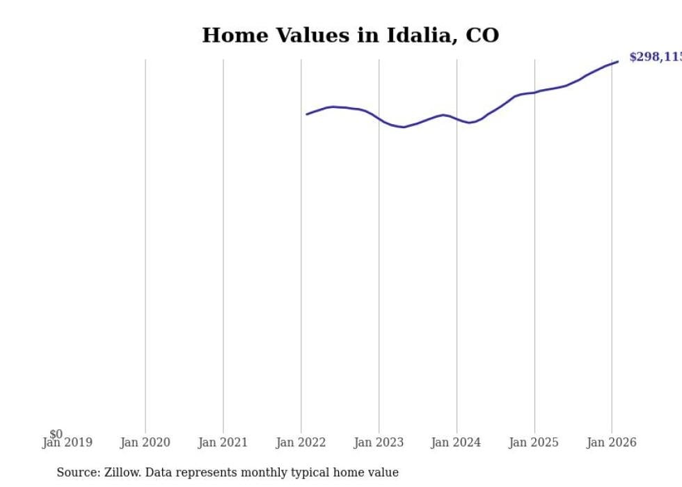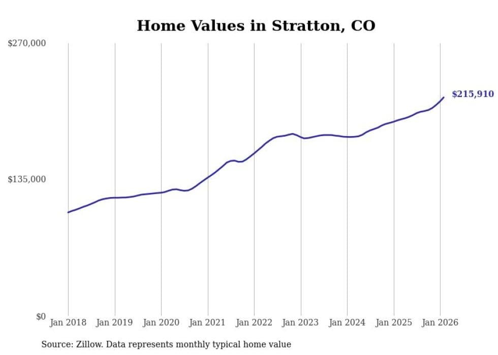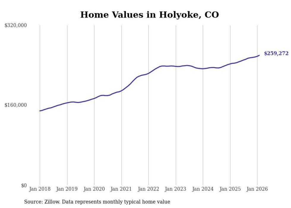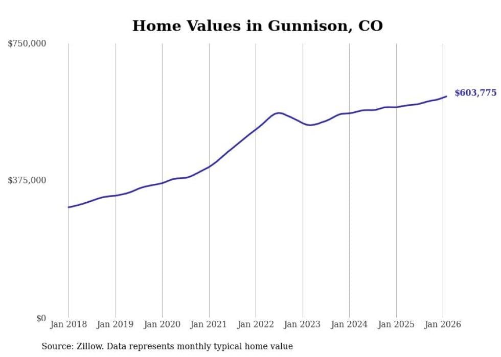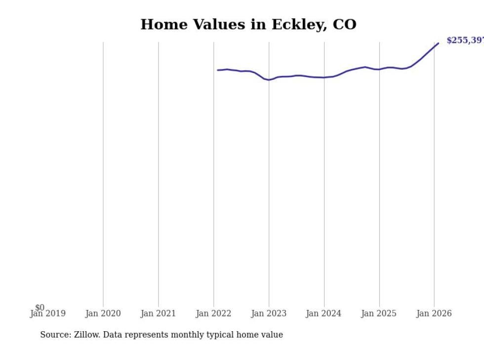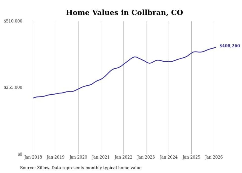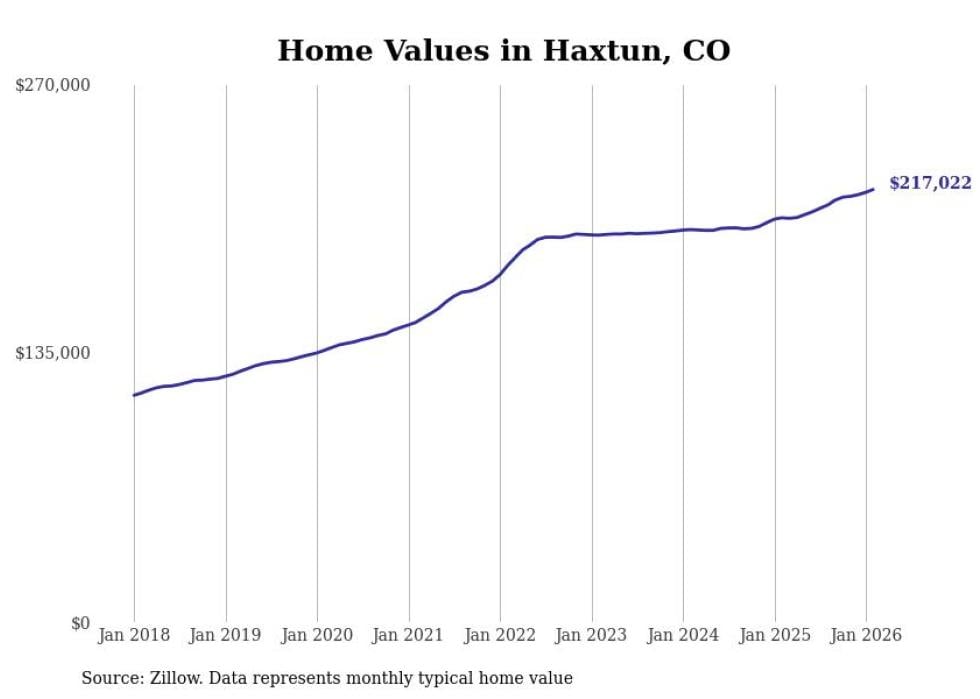 Stacker compiled a list of cities with the fastest-growing home prices in Colorado using data from Zillow. Cities are ranked by the dollar change in the Zillow Home Values Index for all homes from the 12 months ending February 2026. The charts in this story were created automatically using Matplotlib. Data was available for 50 cities and towns in Colorado.