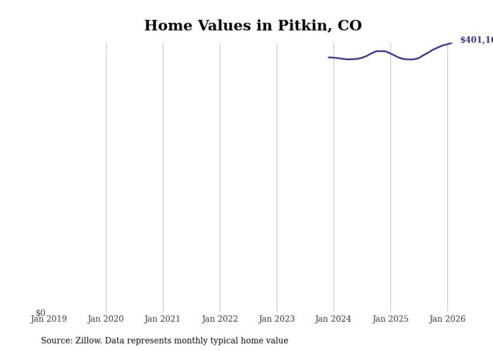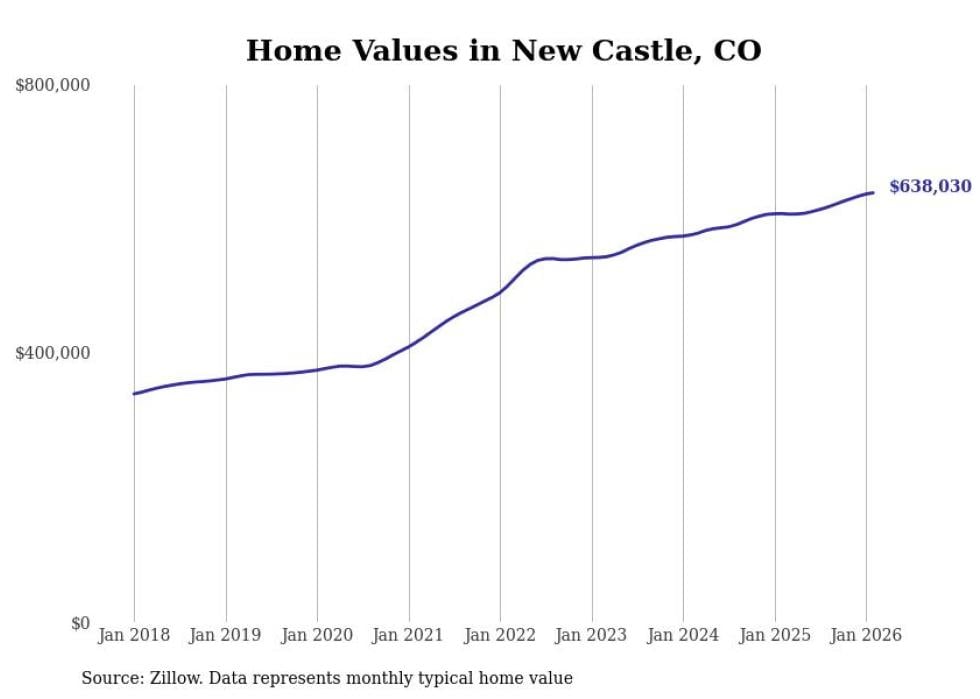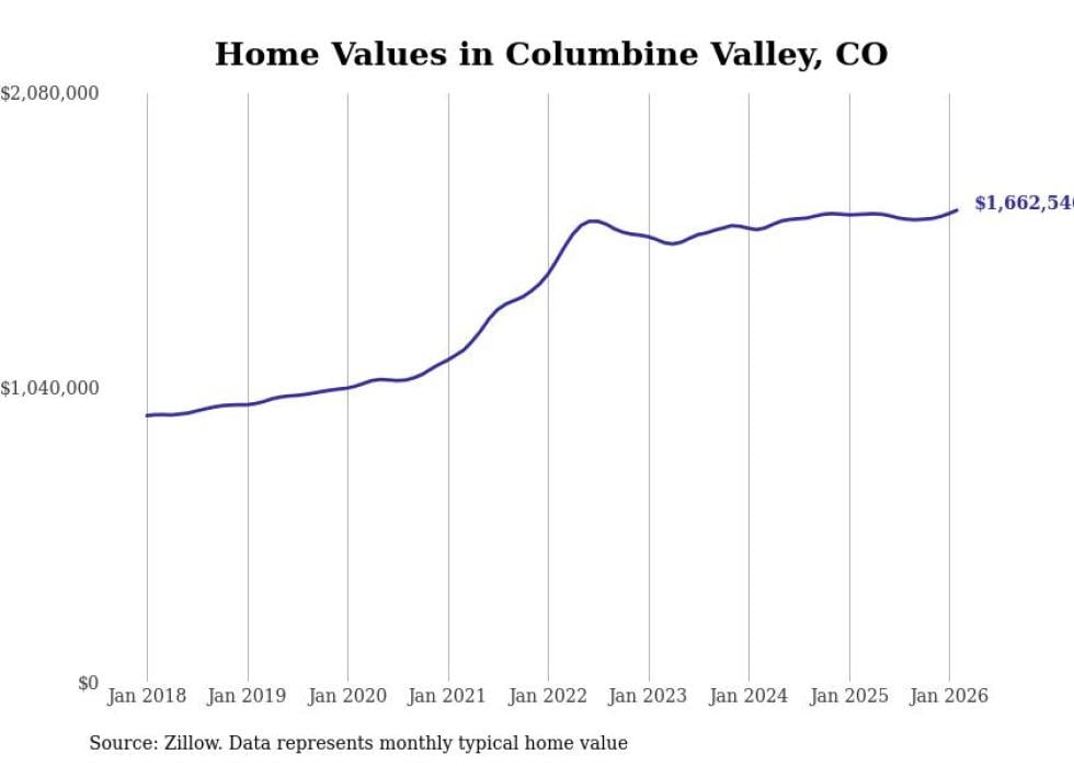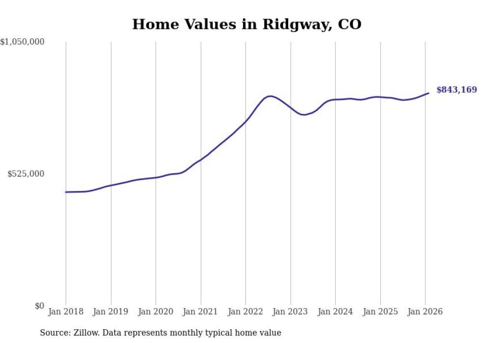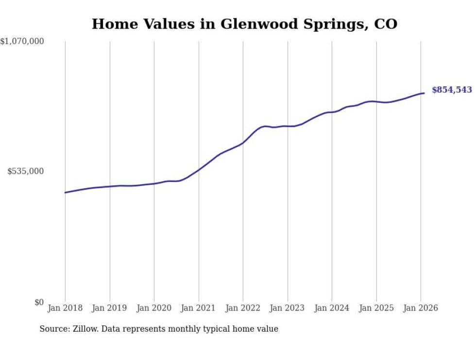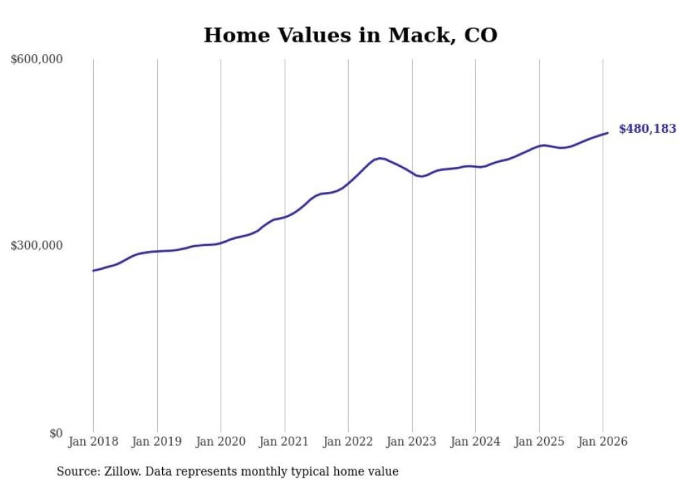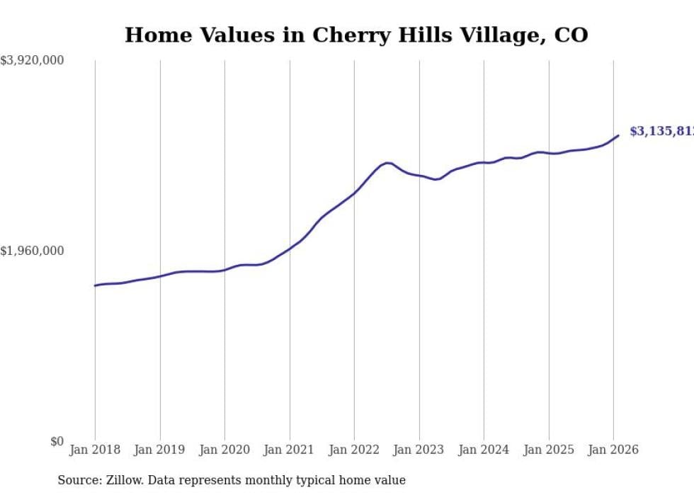 Stacker compiled a list of cities with the fastest-growing home prices in Colorado using data from Zillow. Cities are ranked by the dollar change in the Zillow Home Values Index for all homes from the 12 months ending February 2026. The charts in this story were created automatically using Matplotlib. Data was available for 50 cities and towns in Colorado.