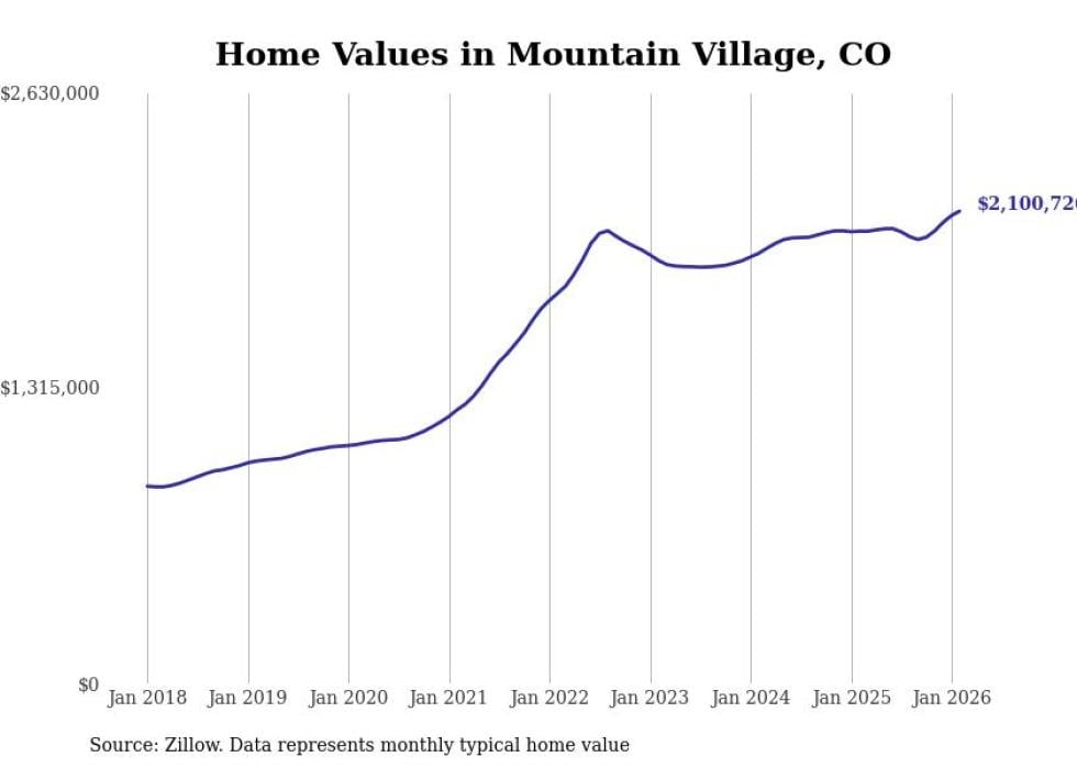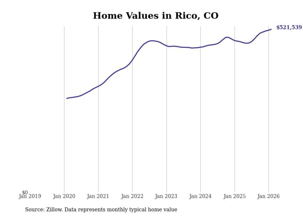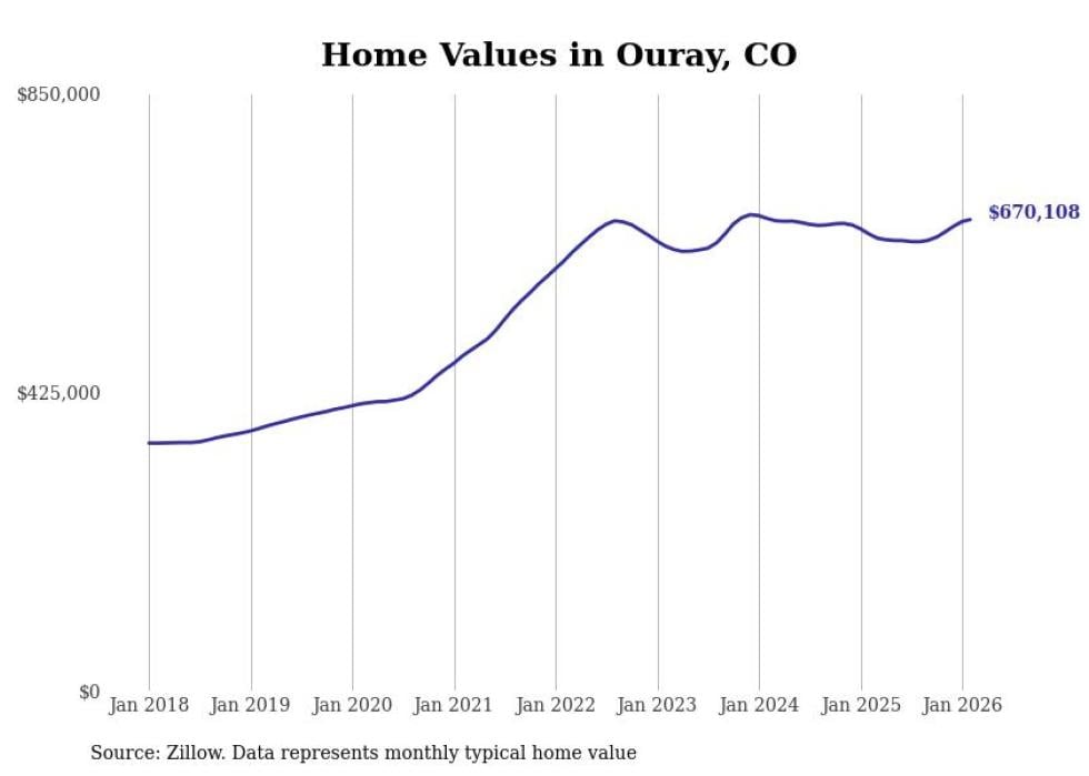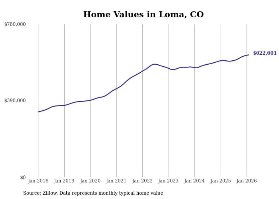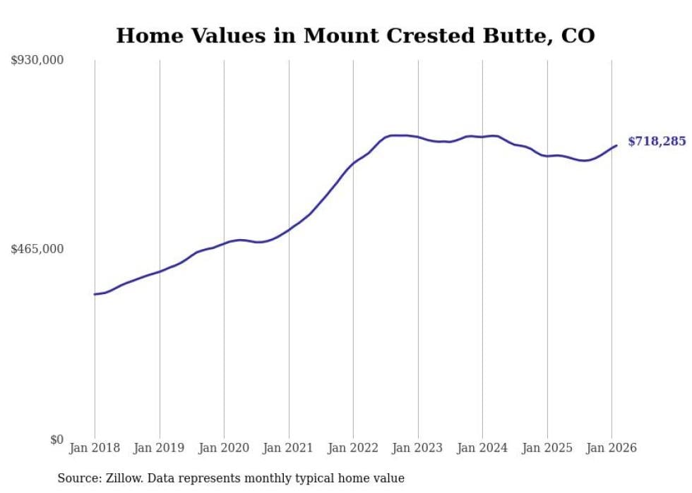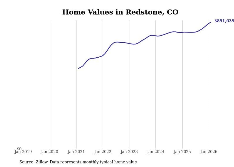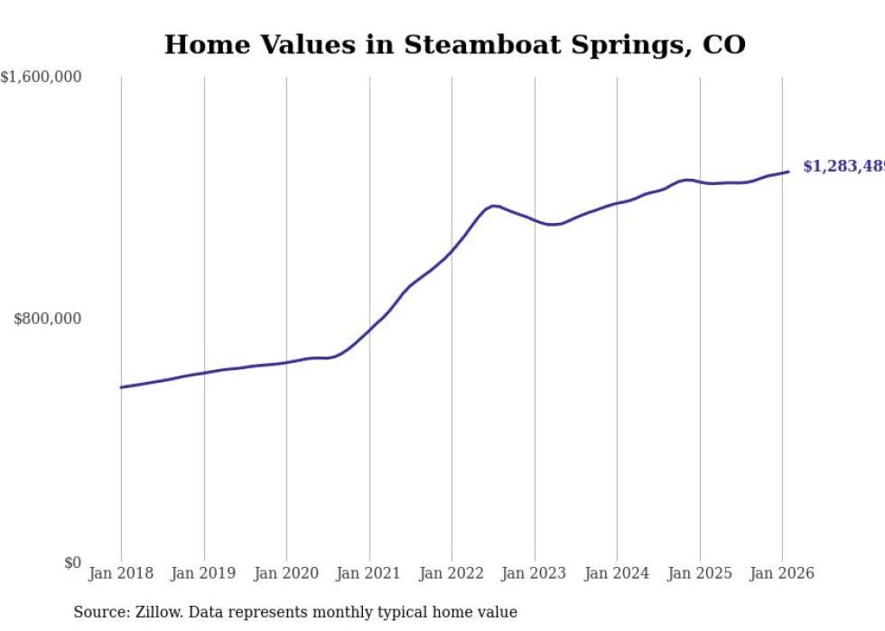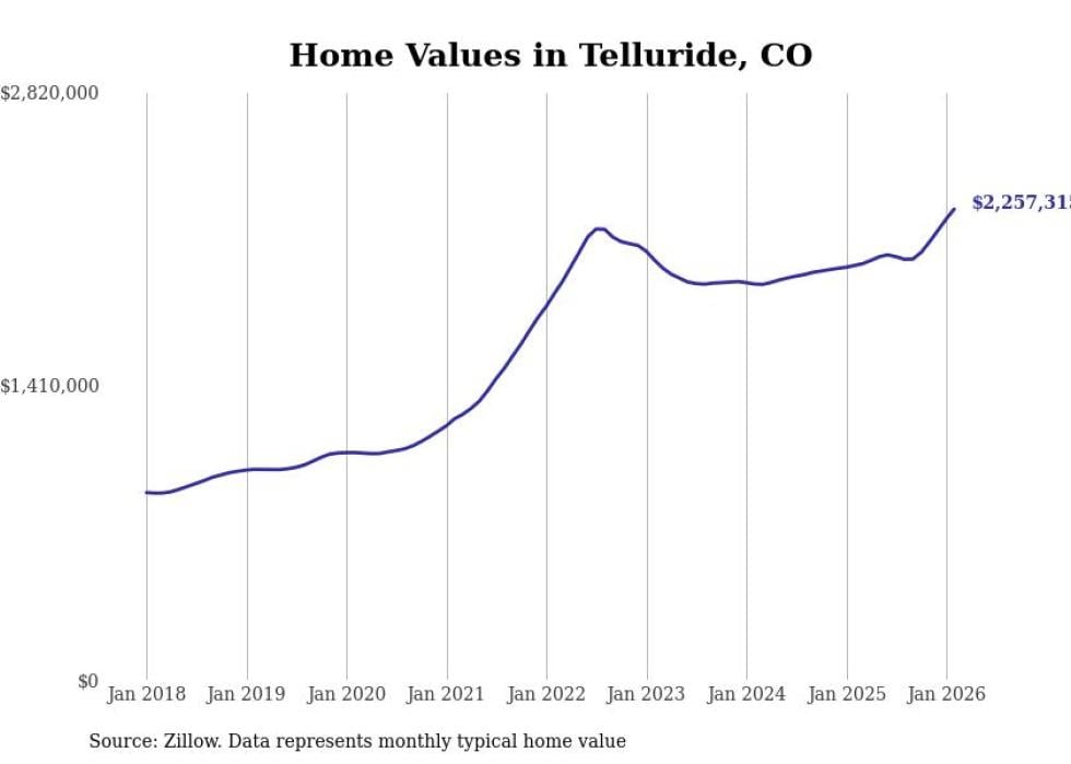 Stacker compiled a list of cities with the fastest-growing home prices in Colorado using data from Zillow. Cities are ranked by the dollar change in the Zillow Home Values Index for all homes from the 12 months ending February 2026. The charts in this story were created automatically using Matplotlib. Data was available for 50 cities and towns in Colorado.