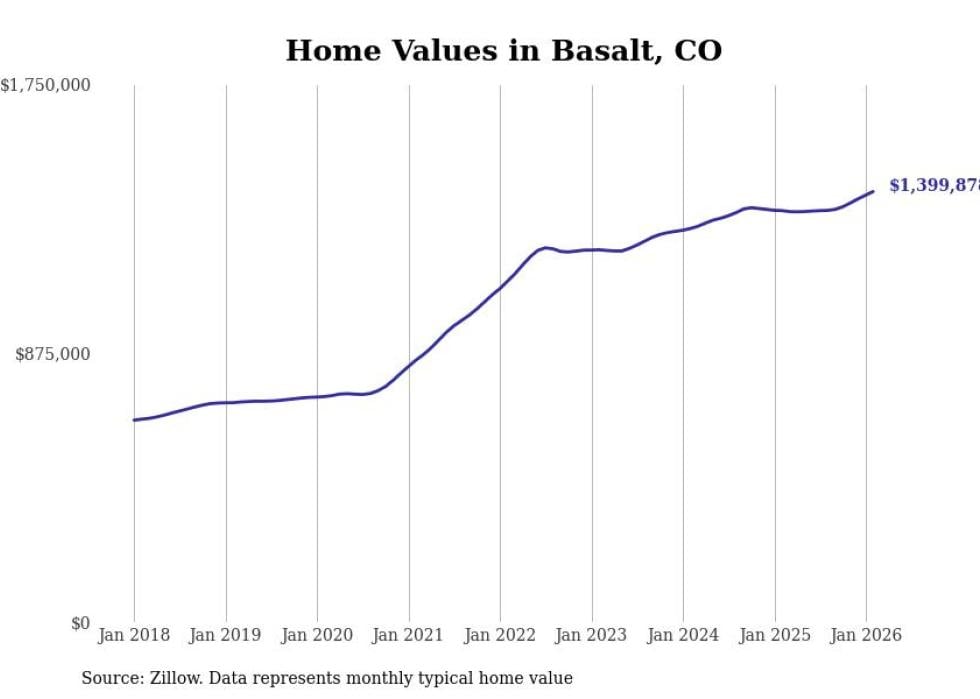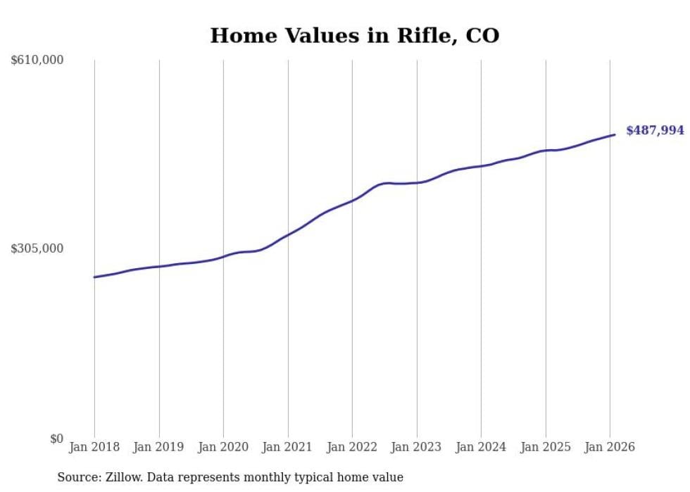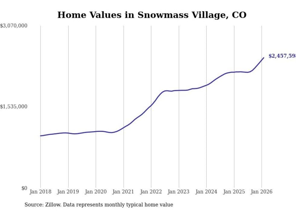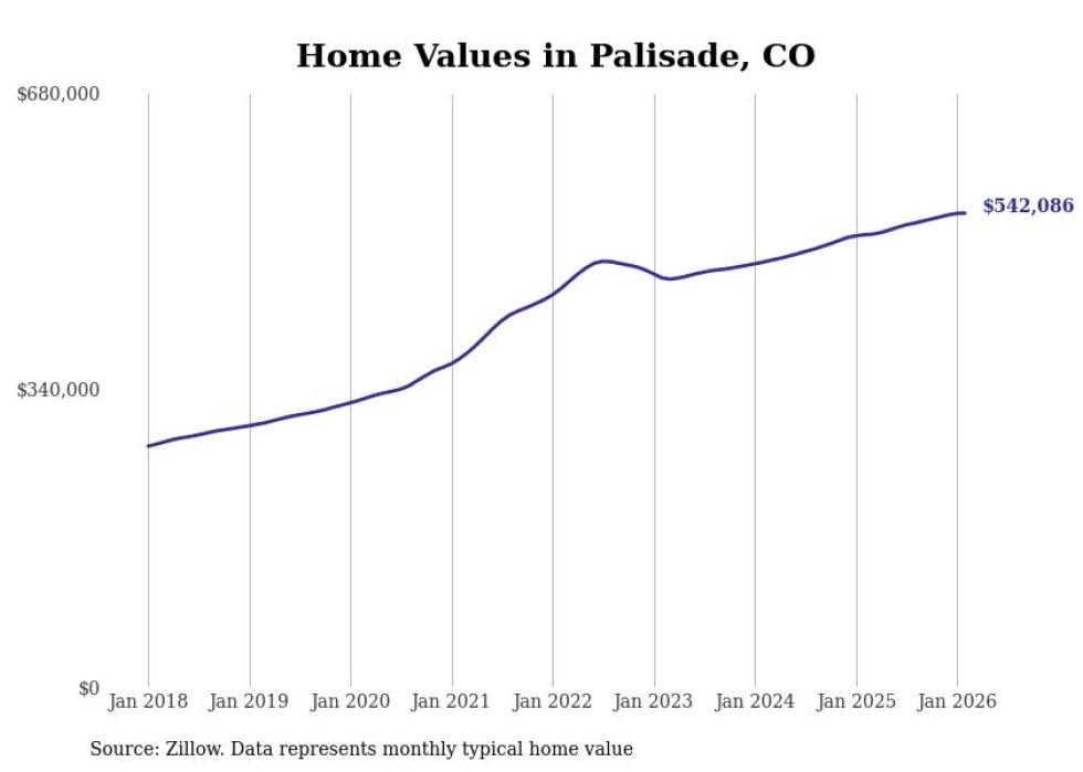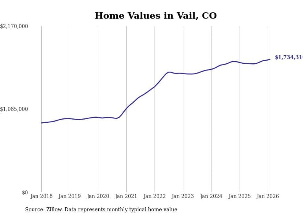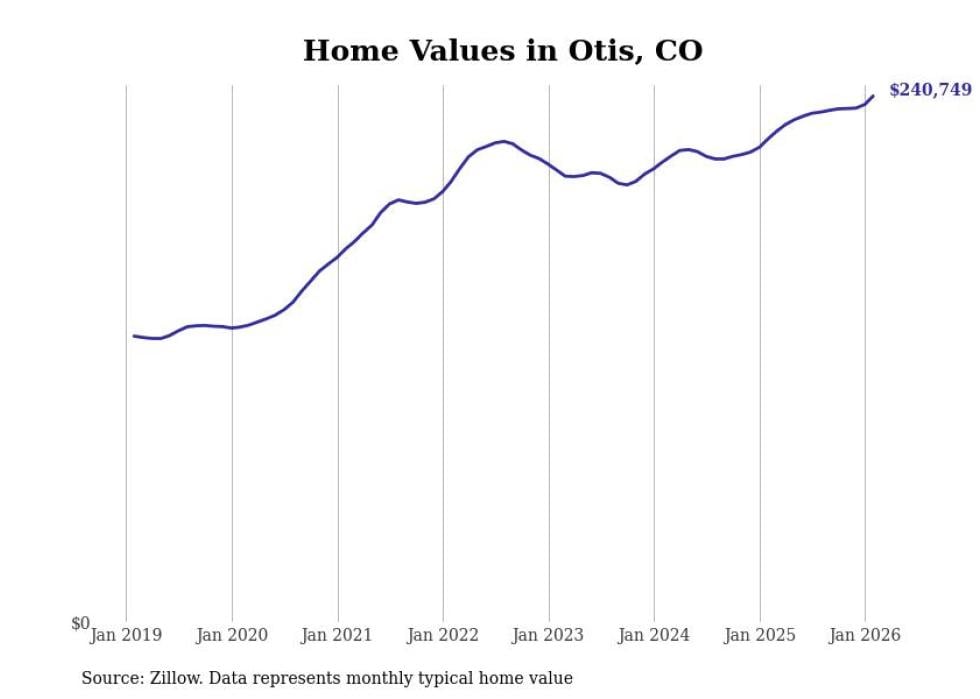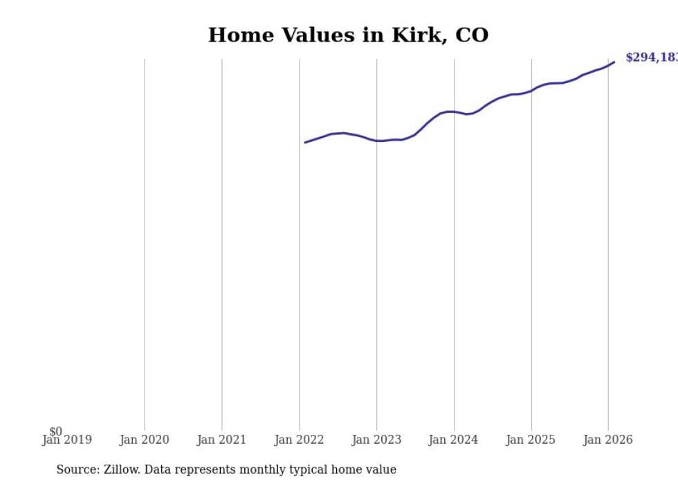 Stacker compiled a list of cities with the fastest-growing home prices in Colorado using data from Zillow. Cities are ranked by the dollar change in the Zillow Home Values Index for all homes from the 12 months ending February 2026. The charts in this story were created automatically using Matplotlib. Data was available for 50 cities and towns in Colorado.