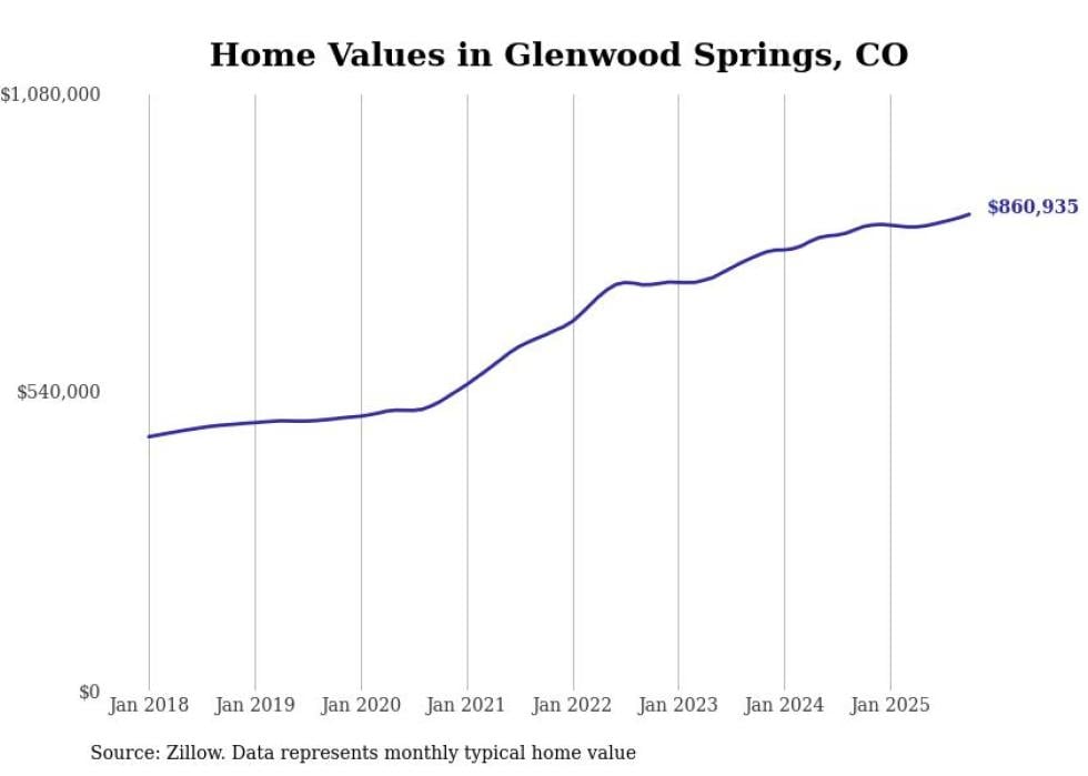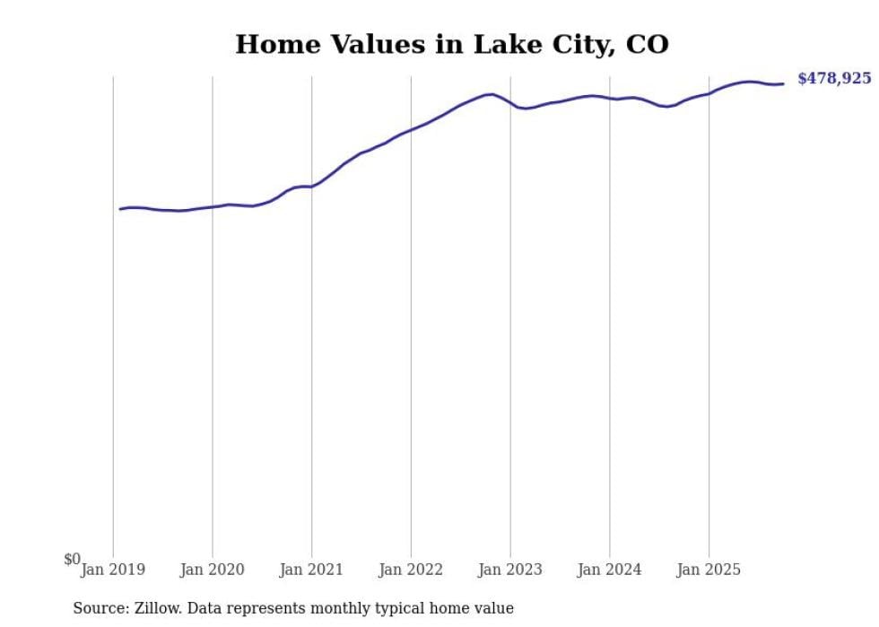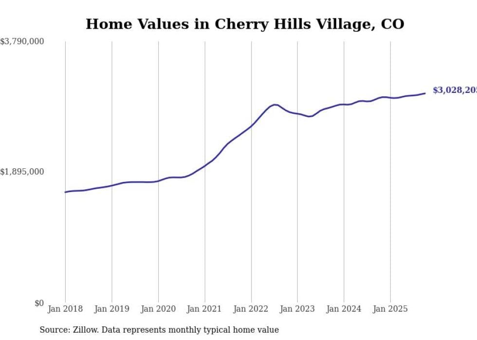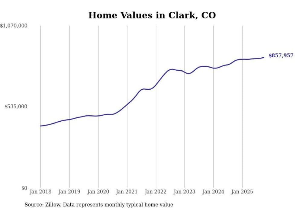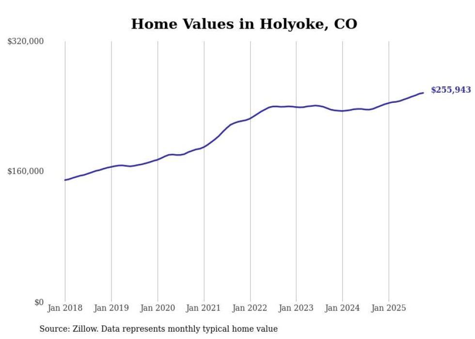 Stacker compiled a list of cities with the fastest-growing home prices in Colorado using data from Zillow. Cities are ranked by the dollar change in the Zillow Home Values Index for all homes from the 12 months ending October 2025. The charts in this story were created automatically using Matplotlib. Data was available for 50 cities and towns in Colorado.