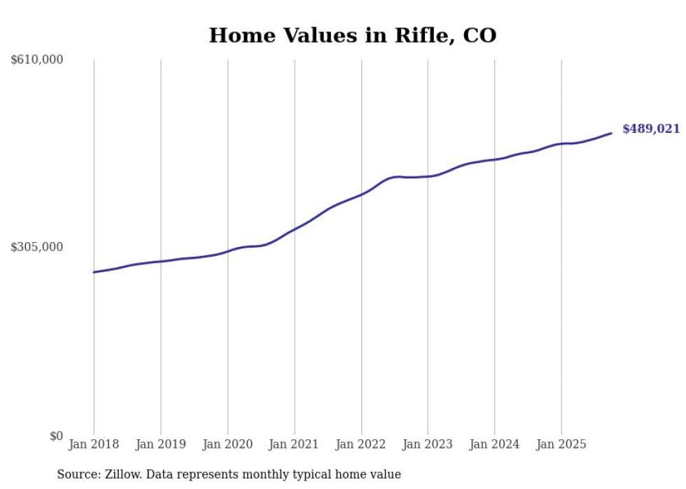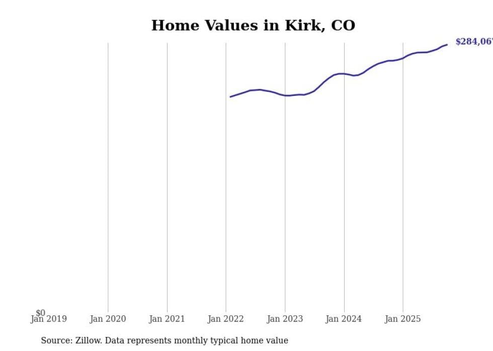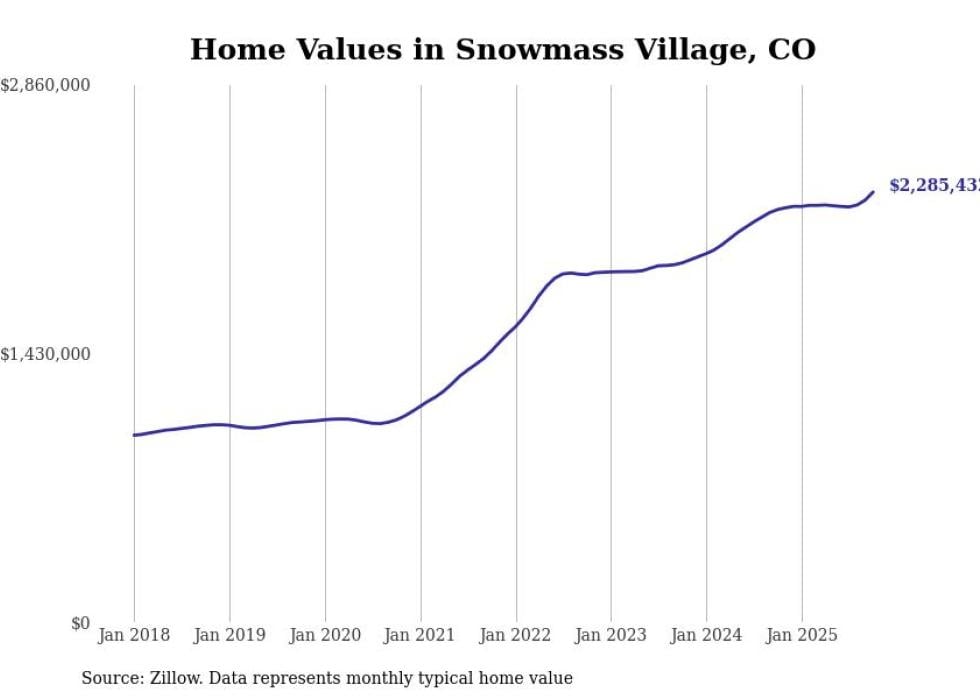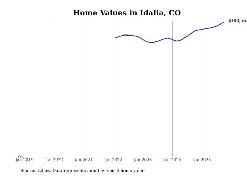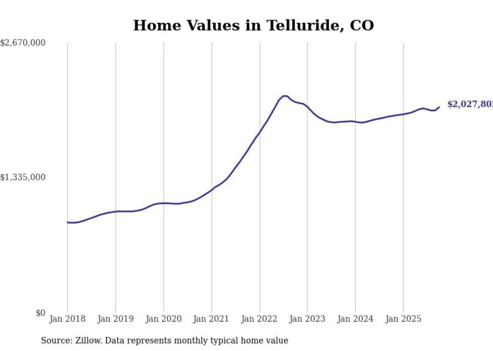 Stacker compiled a list of cities with the fastest-growing home prices in Colorado using data from Zillow. Cities are ranked by the dollar change in the Zillow Home Values Index for all homes from the 12 months ending October 2025. The charts in this story were created automatically using Matplotlib. Data was available for 50 cities and towns in Colorado.