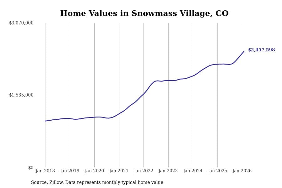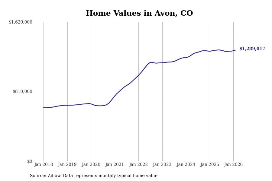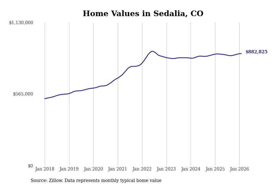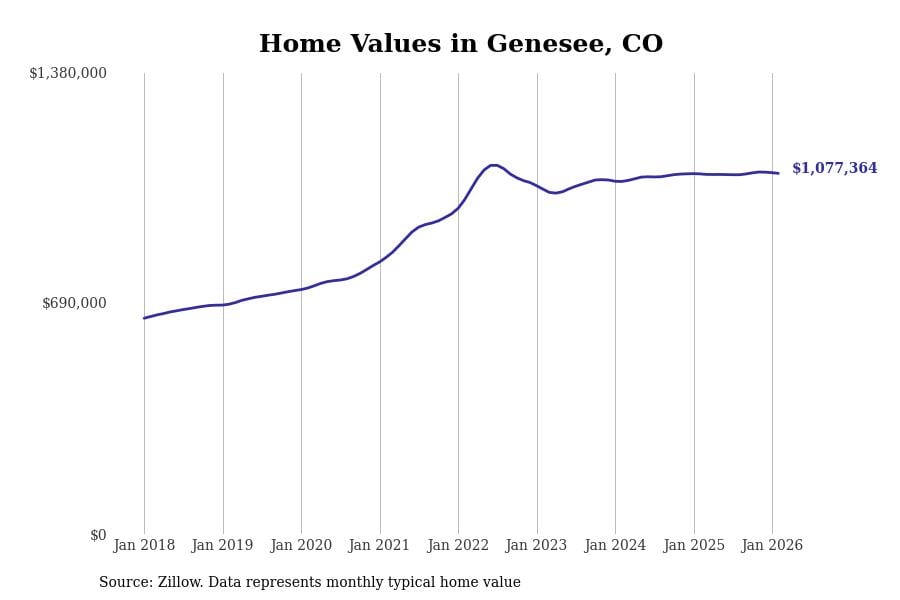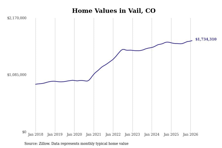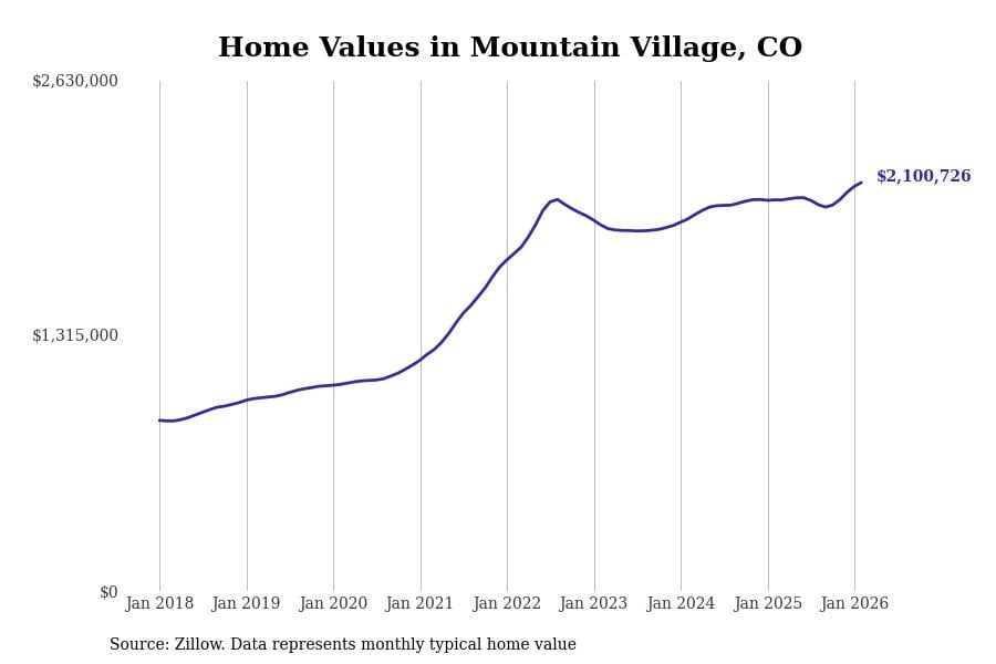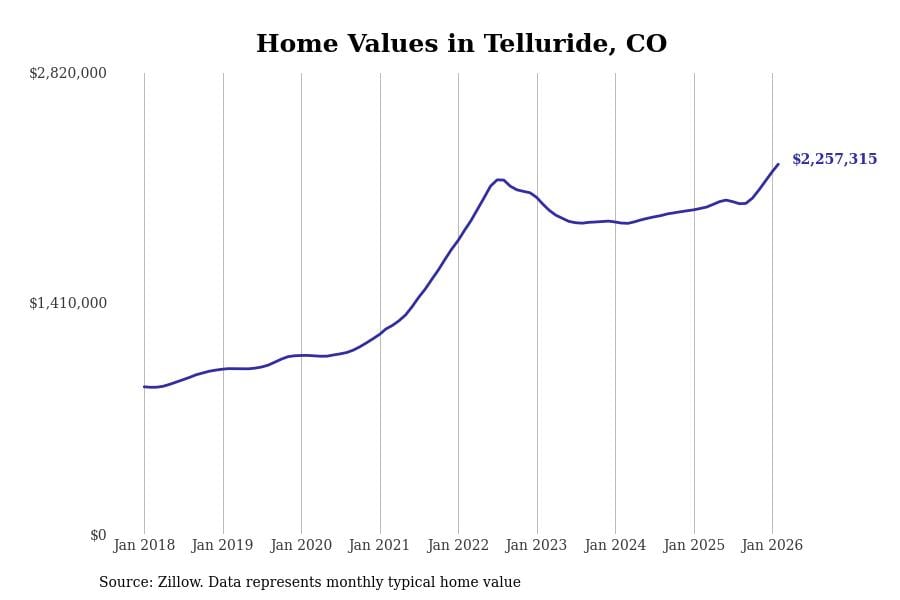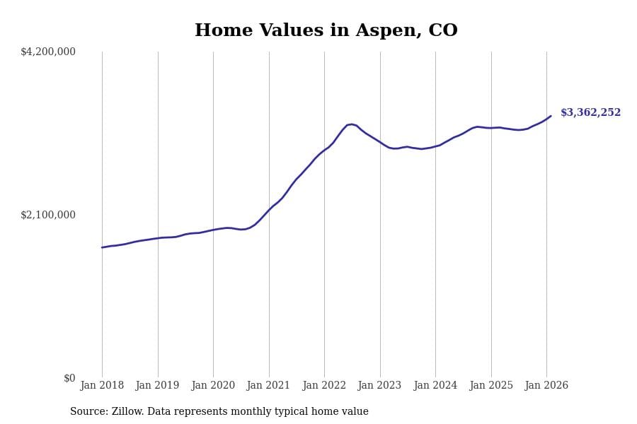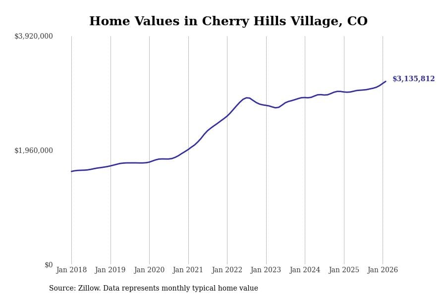 Stacker compiled a list of cities with the most expensive homes in Colorado using data from Zillow. Cities are ranked by the Zillow Home Values Index for all homes as of February 2026. The charts in this story were created automatically using Matplotlib.