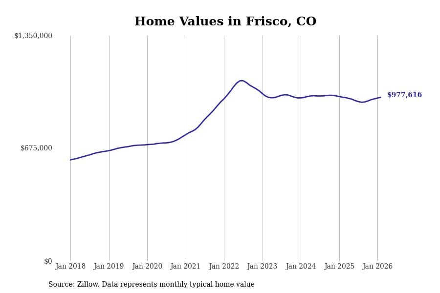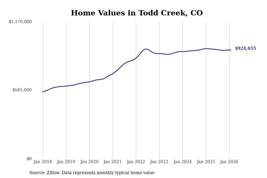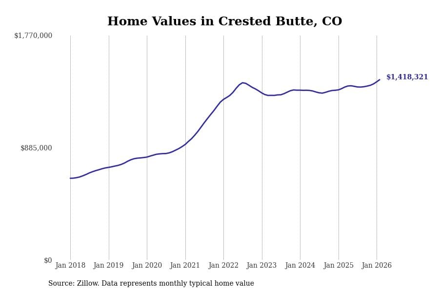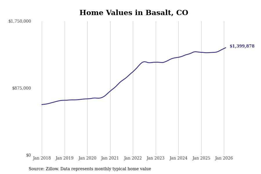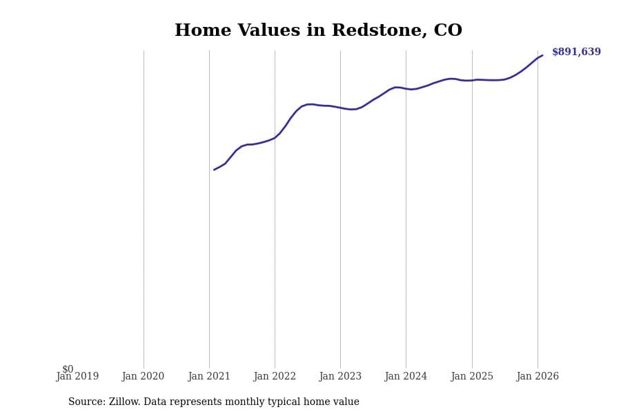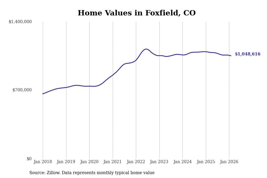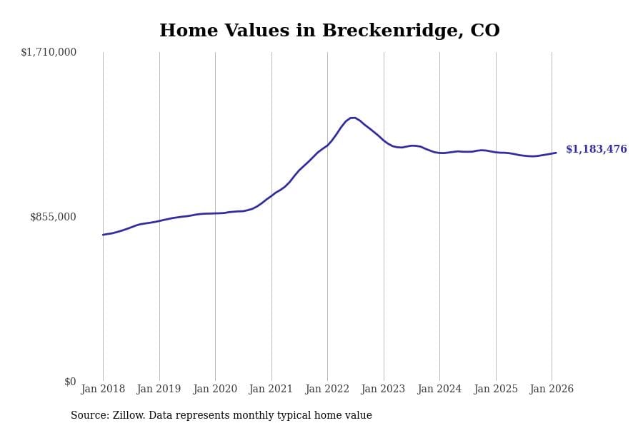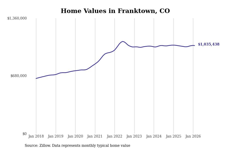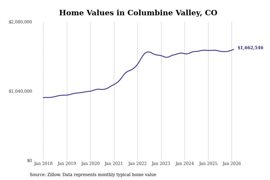Stacker compiled a list of cities with the most expensive homes in Colorado using data from Zillow. Cities are ranked by the Zillow Home Values Index for all homes as of February 2026. The charts in this story were created automatically using Matplotlib.