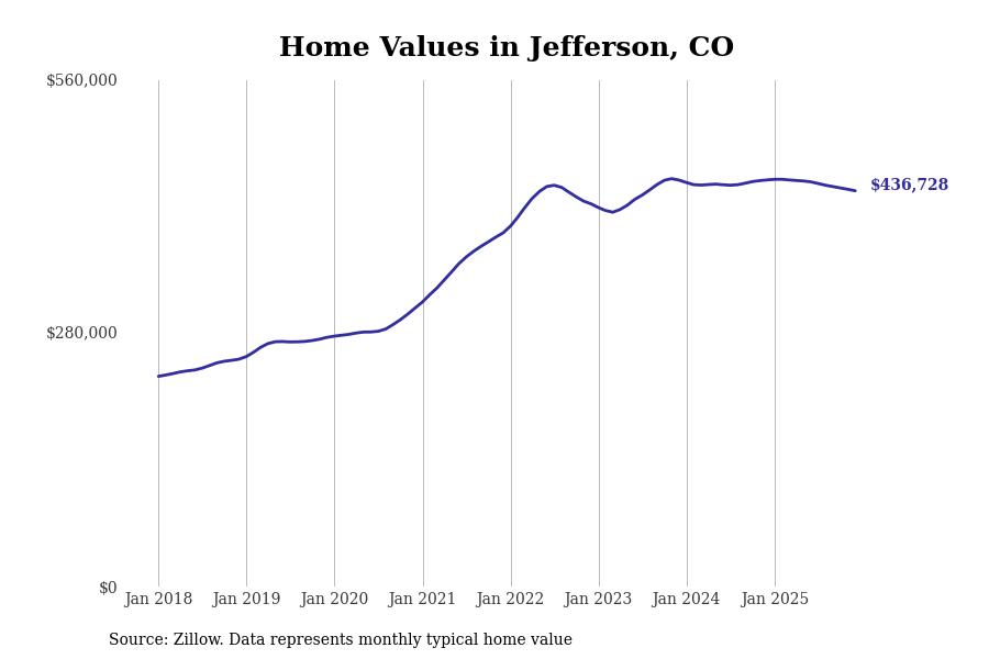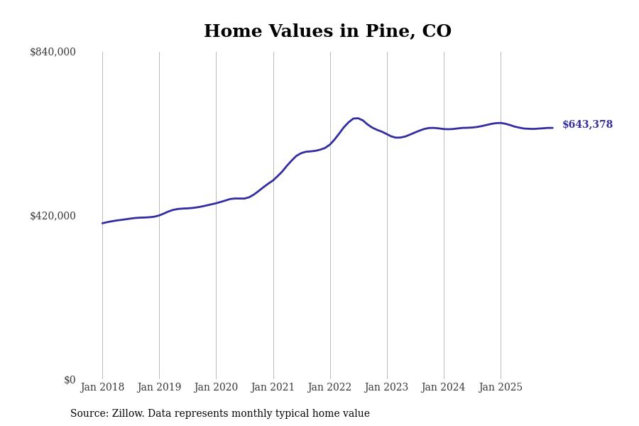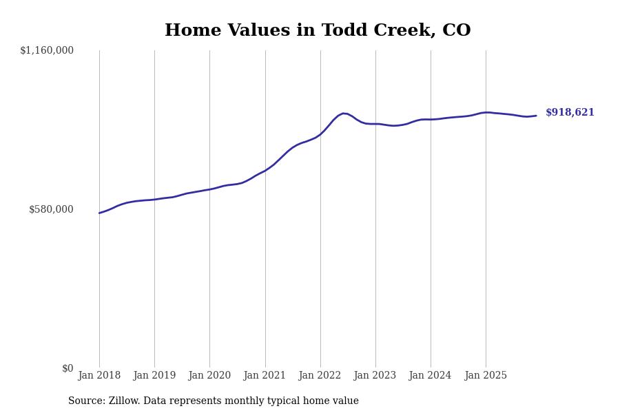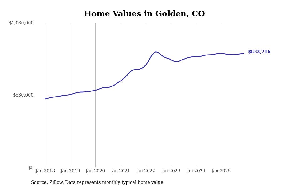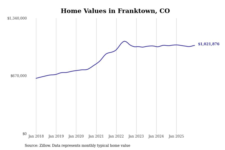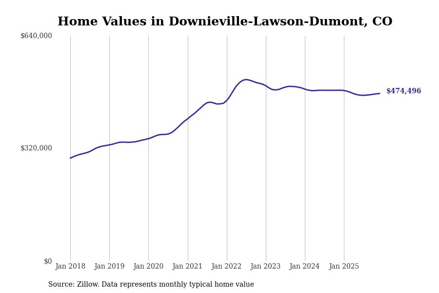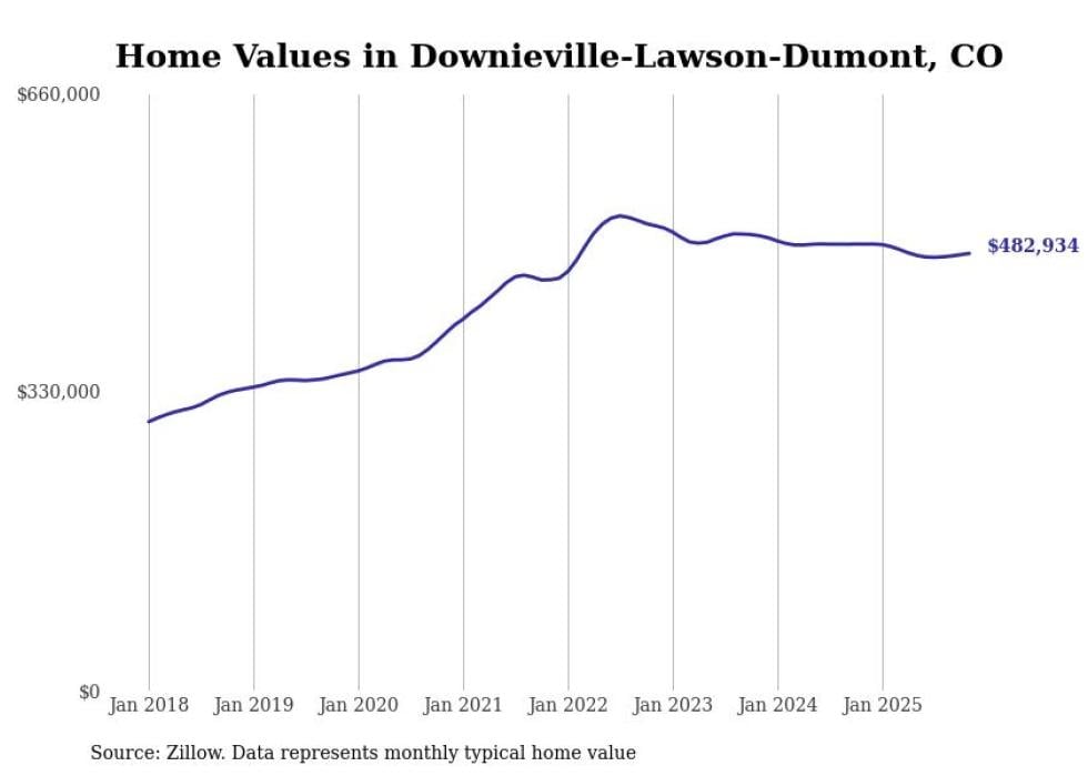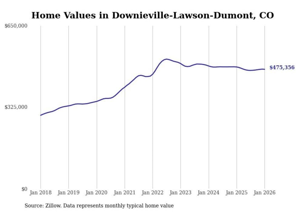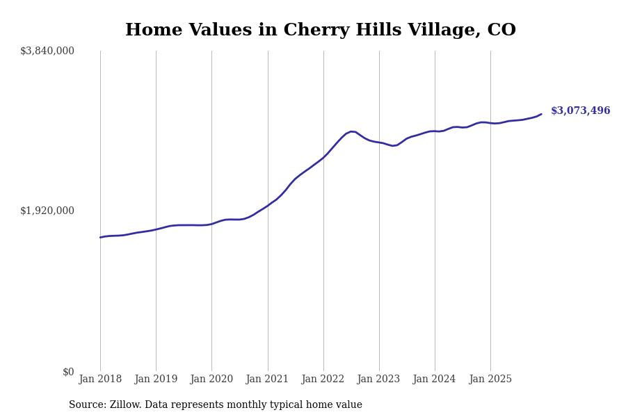 Stacker compiled a list of cities with the most expensive homes in the Denver-Aurora-Lakewood, CO metro area using data from Zillow. Charts show the monthly typical home value since January 2018.