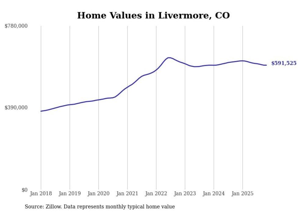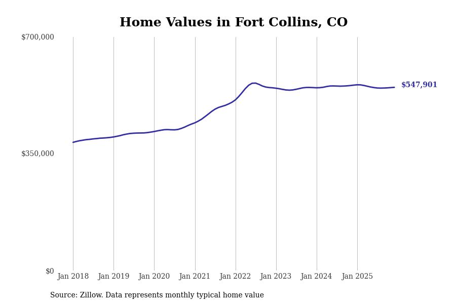 Stacker compiled a list of cities with the most expensive homes in the Fort Collins metro area using data from Zillow. Charts show the monthly typical home value since January 2018. All 11 cities and towns with data available were included in the list.