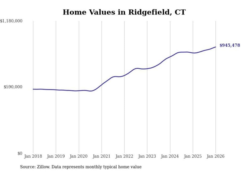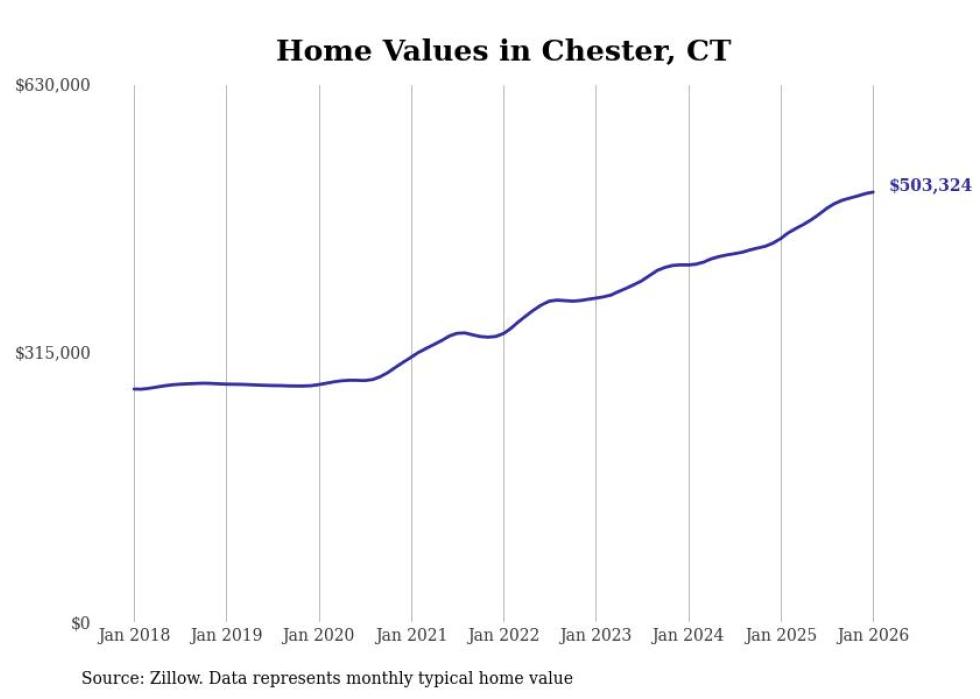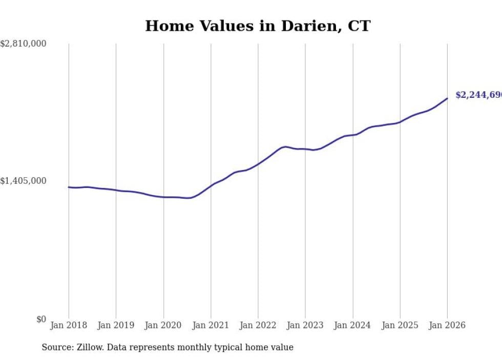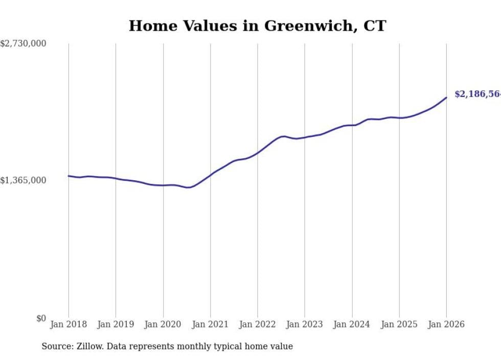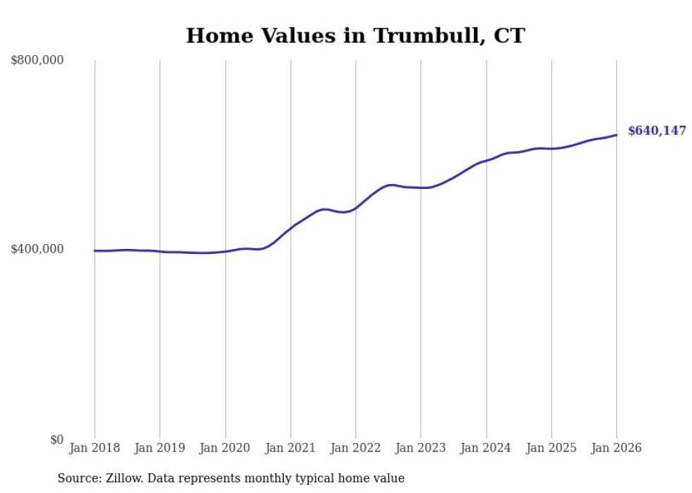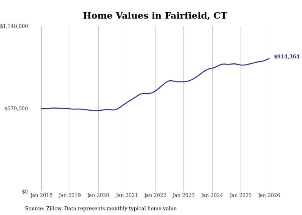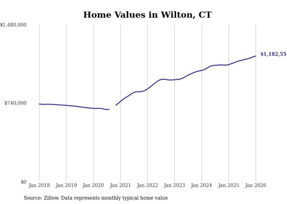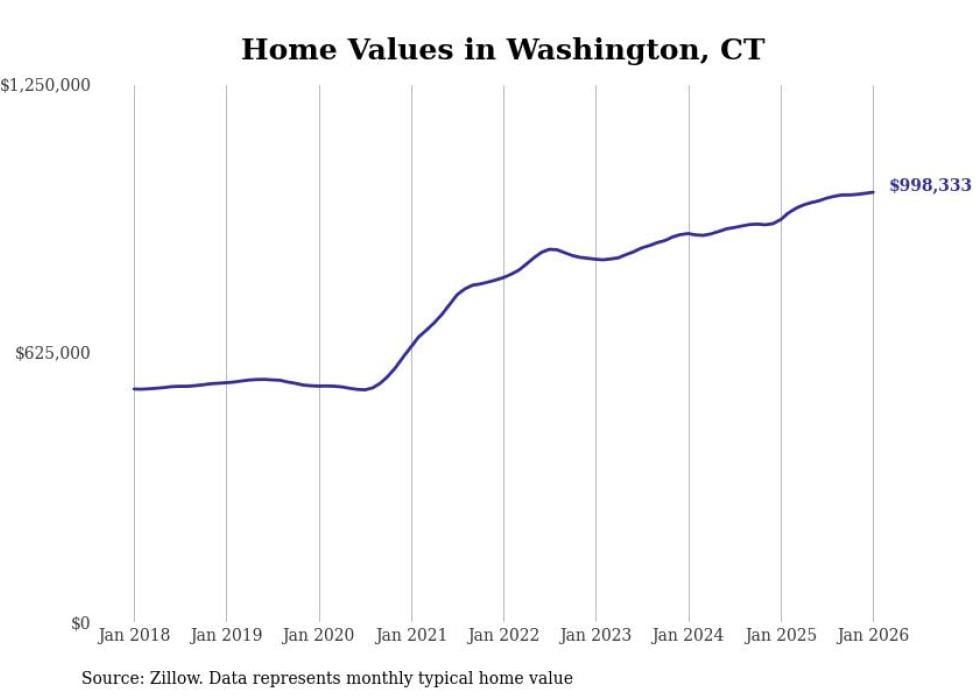Stacker compiled a list of cities with the fastest-growing home prices in Connecticut using data from Zillow. Cities are ranked by the dollar change in the Zillow Home Values Index for all homes from the 12 months ending January 2026. The charts in this story were created automatically using Matplotlib. Data was available for 50 cities and towns in Connecticut.