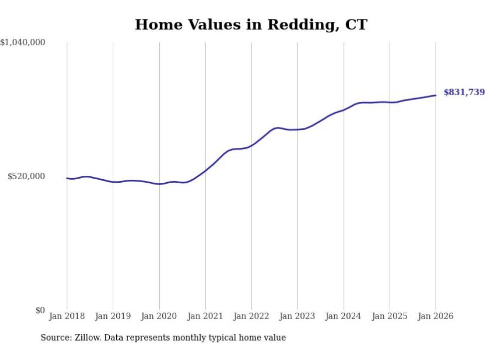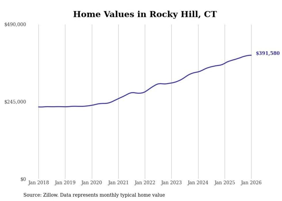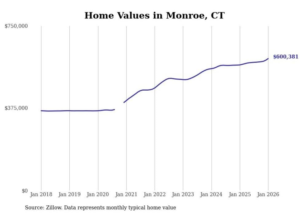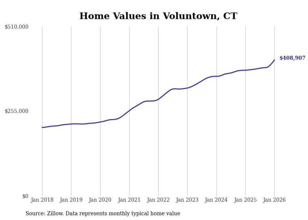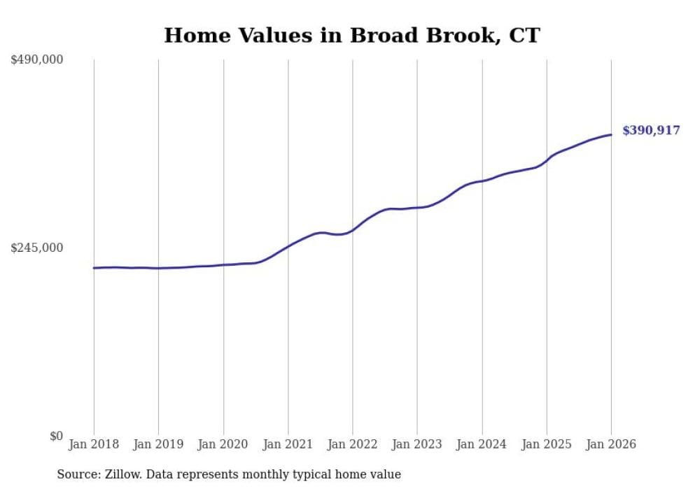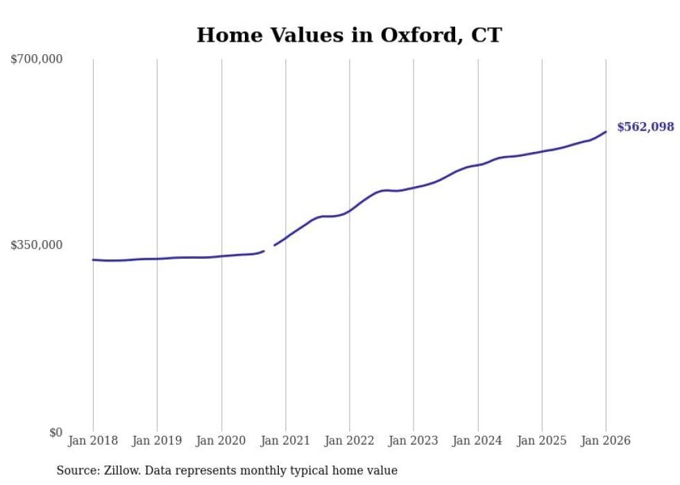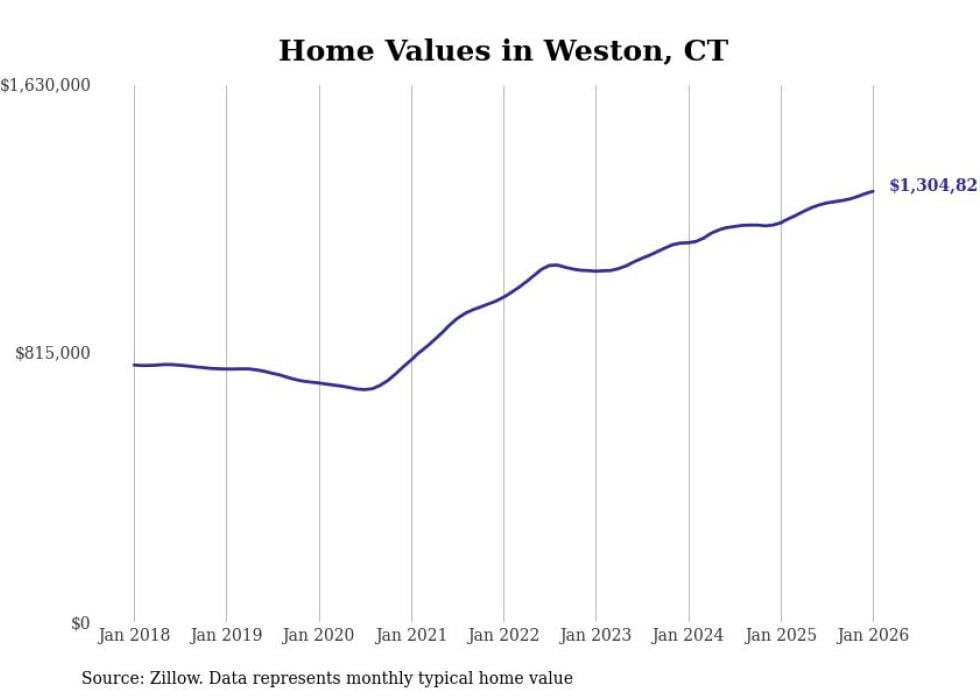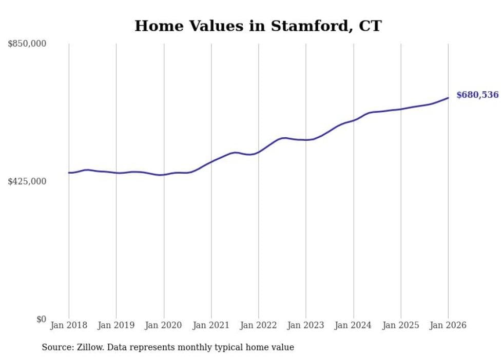 Stacker compiled a list of cities with the fastest-growing home prices in Connecticut using data from Zillow. Cities are ranked by the dollar change in the Zillow Home Values Index for all homes from the 12 months ending January 2026. The charts in this story were created automatically using Matplotlib. Data was available for 50 cities and towns in Connecticut.