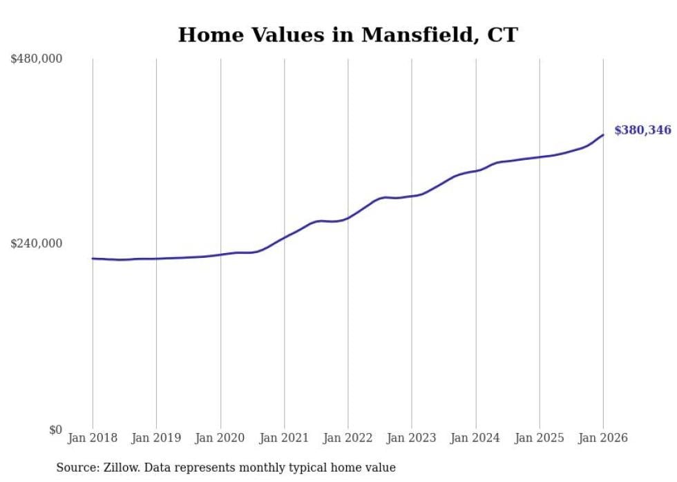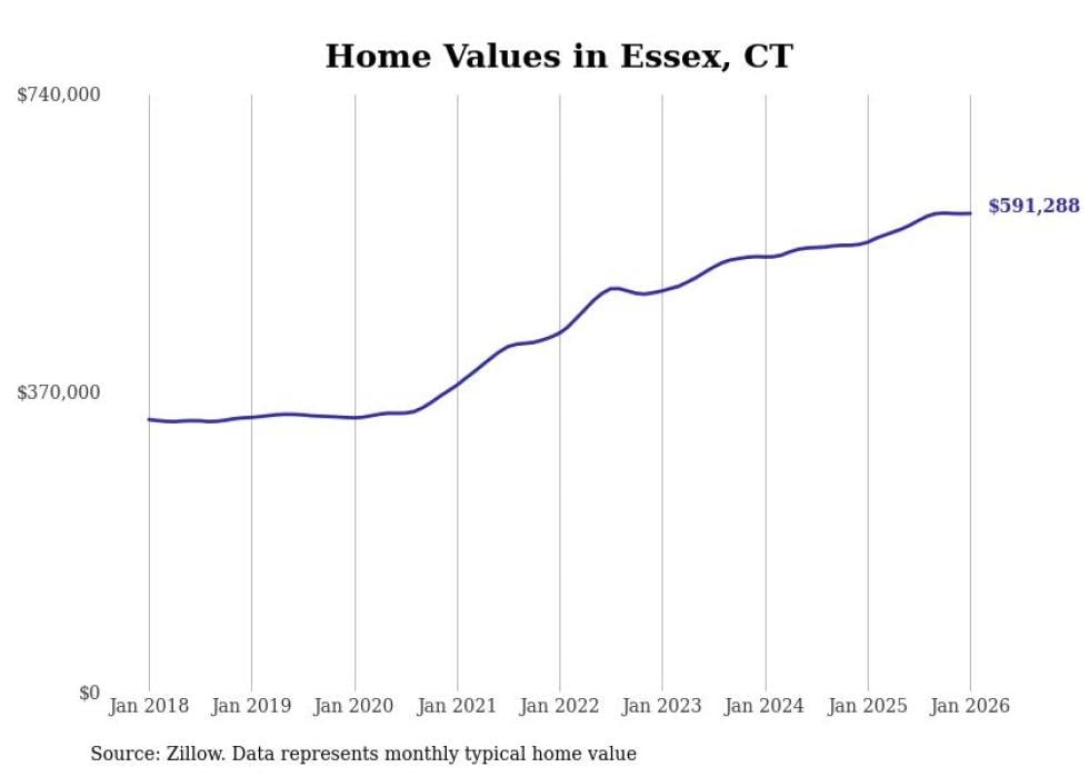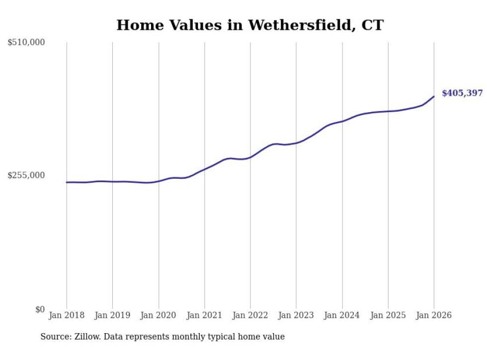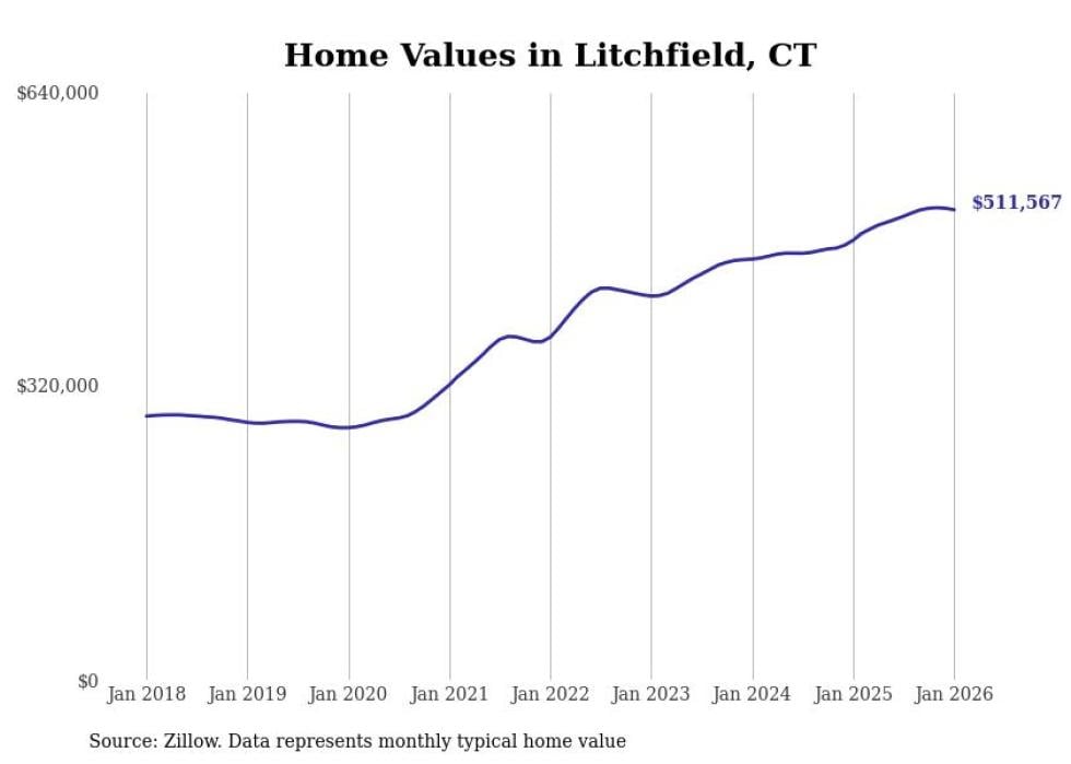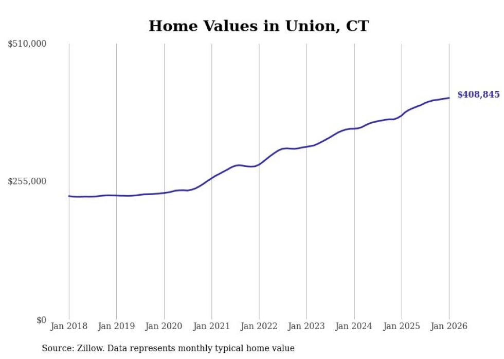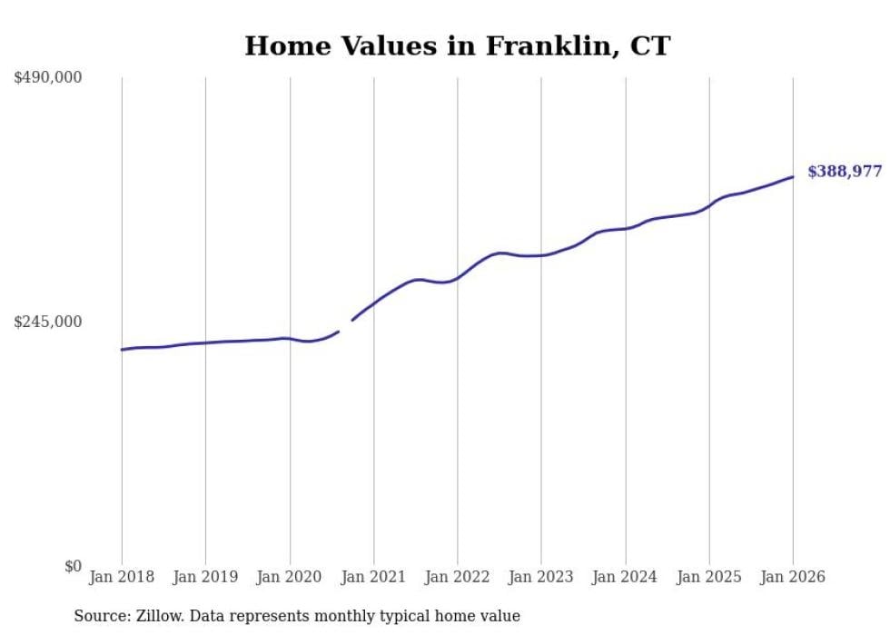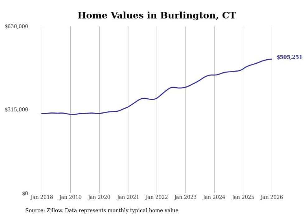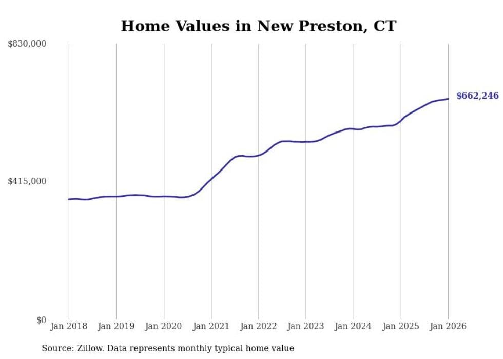 Stacker compiled a list of cities with the fastest-growing home prices in Connecticut using data from Zillow. Cities are ranked by the dollar change in the Zillow Home Values Index for all homes from the 12 months ending January 2026. The charts in this story were created automatically using Matplotlib. Data was available for 50 cities and towns in Connecticut.