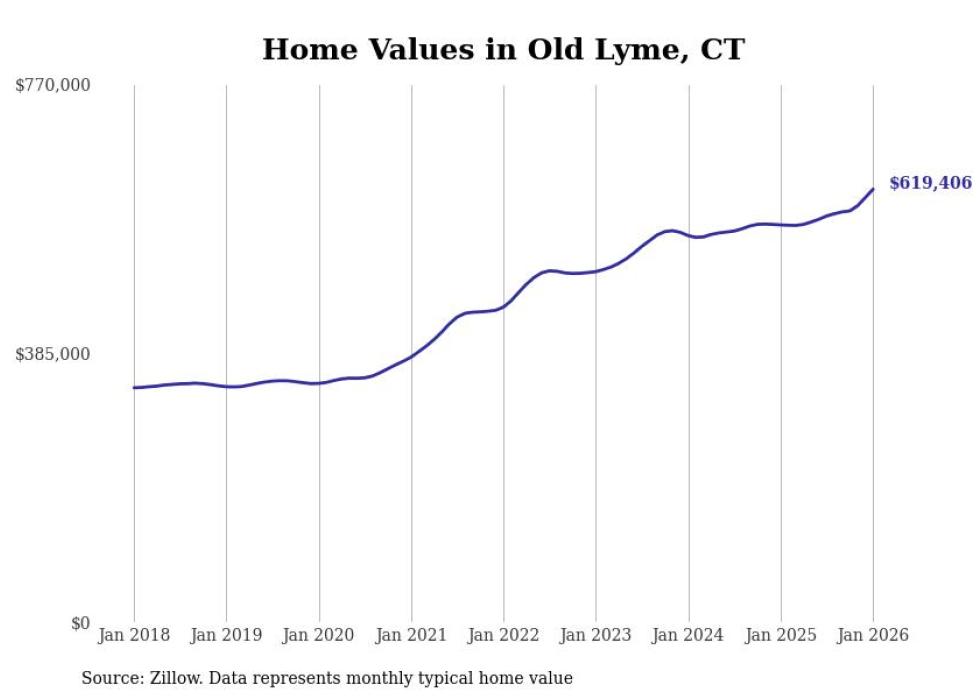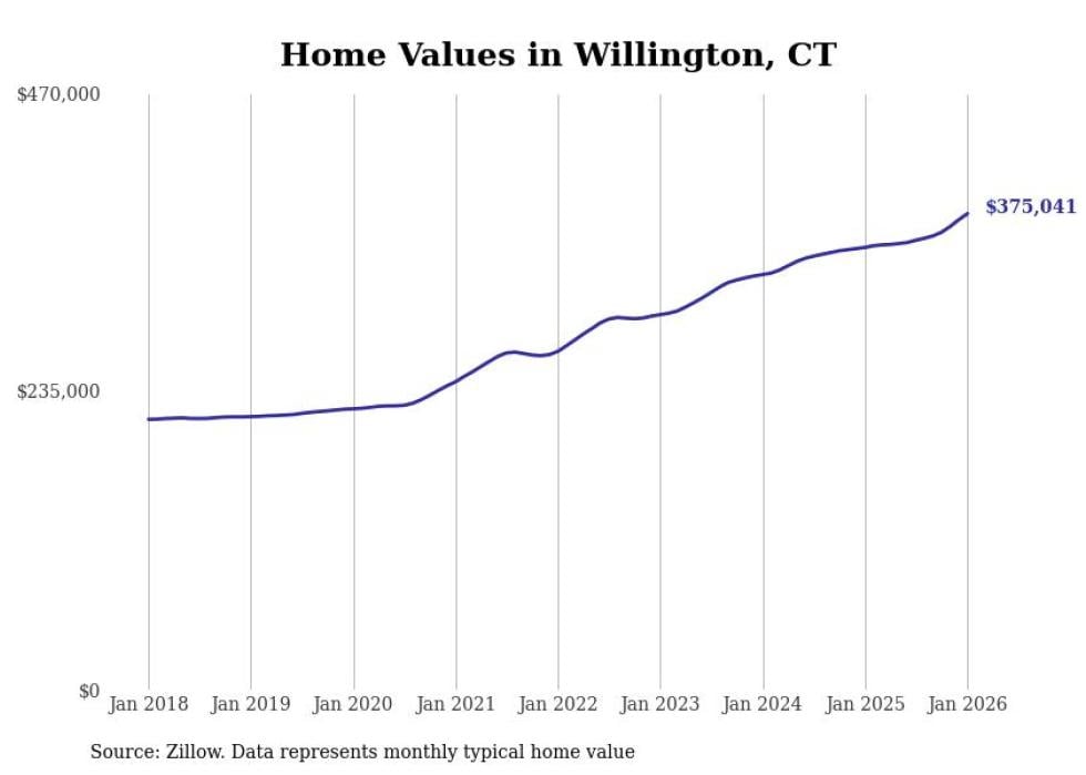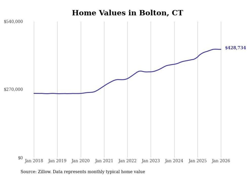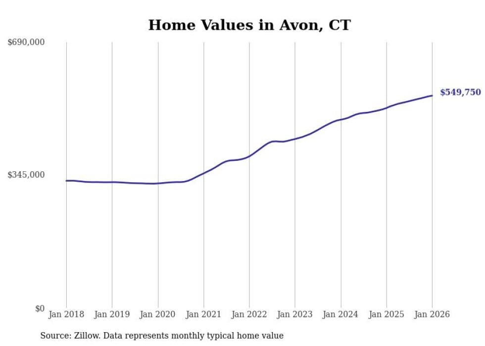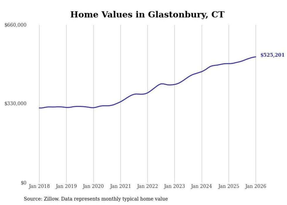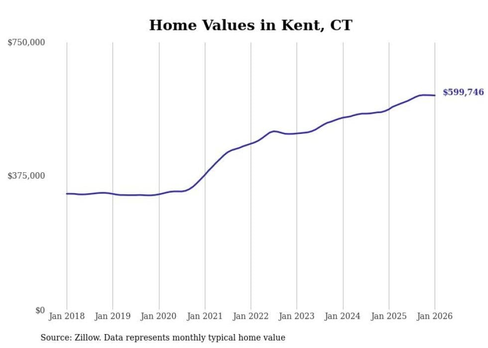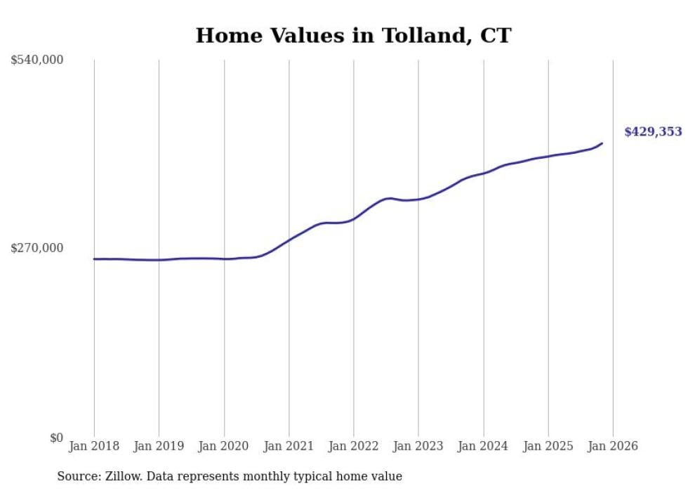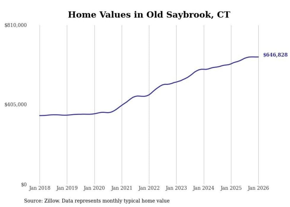 Stacker compiled a list of cities with the fastest-growing home prices in Connecticut using data from Zillow. Cities are ranked by the dollar change in the Zillow Home Values Index for all homes from the 12 months ending January 2026. The charts in this story were created automatically using Matplotlib. Data was available for 50 cities and towns in Connecticut.
